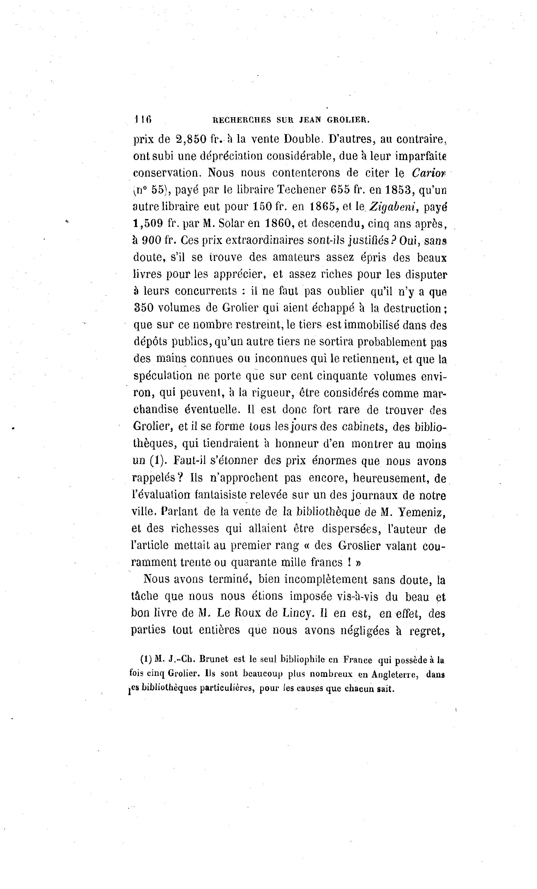 1 i fi RECHERCHES SUR JEAN GROLIER. prix de 2,850 fr. a la vente Double, D'autres, au contraire, ont subi une dépréciation considérable, due à leur imparfaite conservation. Nous nous contenterons de citer le Carior Kxi° 55), payé par le libraire Techener 655 fr. en 1853, qu'un autre libraire eut pour 150 fr. en 1865, et le_Zigabeni, payé 1,509 fr. par M. Solar en 1860, et descendu, cinq ans après, à 900 fr. Ces prix extraordinaires sont-ils justifiés? Oui, sans doute, s'il se trouve des amateurs assez épris des beaux livres pour les apprécier, et assez riches pour les disputer à leurs concurrents : il ne faut pas oublier qu'il n'y a que 350 volumes de Grolier qui aient échappé a la destruction ; que sur ce nombre restreint, le tiers est immobilisé dans des dépôts publics, qu'un autre tiers ne sortira probablement pas des mains connues ou inconnues qui le retiennent, et que la spéculation ne porte que sur cent cinquante volumes envi- ron, qui peuvent, a la rigueur, être considérés comme mar- chandise éventuelle. 11 est donc fort rare de trouver des Grolier, et il se forme tous les jours des cabinets, des biblio- thèques, qui tiendraient a honneur d'en montrer au moins un (1). Faut-il s'étonner des prix énormes que nous avons rappelés? Ils n'approchent pas encore, heureusement, de l'évaluation fantaisiste relevée sur un des journaux de notre ville, Parlant de la vente de la bibliothèque de M. Yemeniz, et des richesses qui allaient être dispersées, l'auteur de l'article mettait au premier rang « des Groslier valant cou- ramment trente ou quarante mille francs ! » Nous avons terminé, bien incomplètement sans doute, la tâche que nous nous étions imposée vis-à -vis du beau et bon livre de M. Le Roux de Lincy. Il en est, en effet, des parties tout entières que nous avons négligées a regret, (I) M. J.-Ch. Brunet est le seul bibliophile en France qui possède à la fois cinq Grolier. Ils sont beaucoup plus nombreux en Angleterre, dans .es bibliothèques particulières, pour les causes que chacun sait.