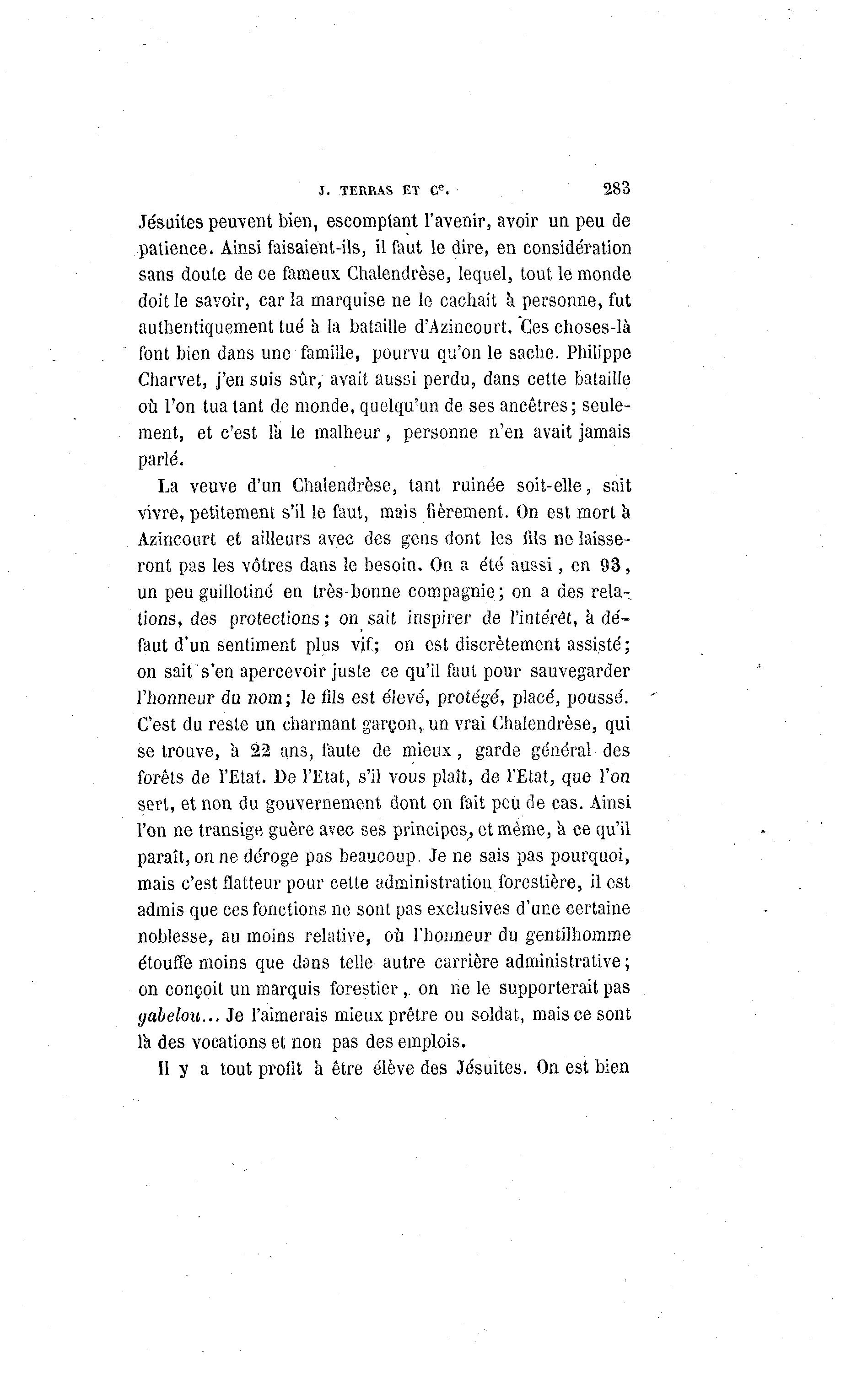 J. TERRAS ET C e . 283 Jésuites peuvent bien, escomptant l'avenir, avoir un peu de patience. Ainsi faisaient-ils, il faut le dire, en considération sans doute de ce fameux Chalendrèse, lequel, tout le monde doit le savoir, car la marquise ne le cachait à personne, fut aulhentiquement tué à la bataille d'Azincourt. Ces choses-là font bien dans une famille, pourvu qu'on le sache. Philippe Charvet, j'en suis sûr, avait aussi perdu, dans cette bataille où l'on tua tant de monde, quelqu'un de ses ancêtres; seule- ment, et c'est la le malheur, personne n'en avait jamais parlé. La veuve d'un Chalendrèse, tant ruinée soit-elle, sait vivre, petitement s'il le faut, mais fièrement. On est mort a Azincourt et ailleurs avec des gens dont les fils ne laisse- ront pas les vôtres dans le besoin. On a été aussi, en 9 3 , un peu guillotiné en très-bonne compagnie; on a des rela- tions, des protections ; on sait inspirer de l'intérêt, à dé- faut d'un sentiment plus vif; on est discrètement assisté; on sait s'en apercevoir juste ce qu'il faut pour sauvegarder l'honneur du nom; le fils est élevé, protégé, placé, poussé. C'est du reste un charmant garçon,-un vrai Chalendrèse, qui se trouve, à 22 ans, faute de mieux, garde général des forêts de l'Etat. De l'Etat, s'il vous plaît, de l'Etat, que l'on sert, et non du gouvernement dont on fait peu de cas. Ainsi l'on ne transige guère avec ses principes, et même, a ce qu'il paraît, on ne déroge pas beaucoup. Je ne sais pas pourquoi, mais c'est flatteur pour cette administration forestière, il est admis que ces fonctions ne sont pas exclusives d'une certaine noblesse, au moins relative, où l'honneur du gentilhomme étouffe moins que dans telle autre carrière administrative ; on conçoit un marquis forestier,. on ne le supporterait pas gabelou.., Je l'aimerais mieux prêtre ou soldat, mais ce sont la des vocations et non pas des emplois. Il y a tout profit 'a être élève des Jésuites. On est bien