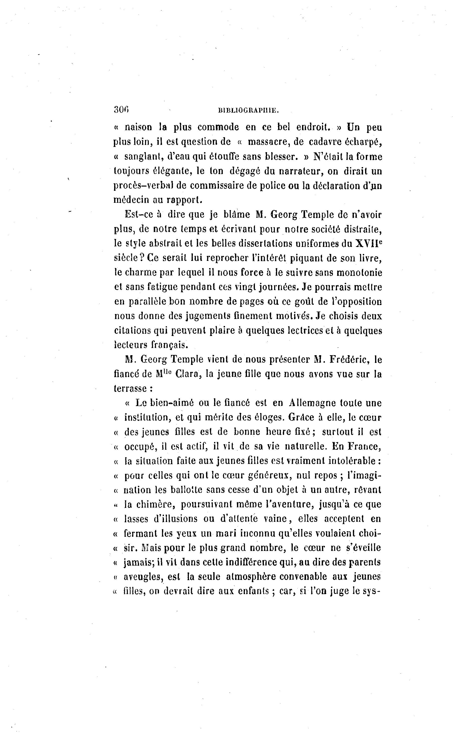 30fi BIBLIOGRAPHIE. « naison la plus commode en ce bel endroit. » Un peu plus loin, il est question de « massacre, de cadavre écharpé, « sanglant, d'eau qui étouffe sans blesser. » N'était la forme toujours élégante, le ton dégagé du narrateur, on dirait un procès-verbal de commissaire de police ou la déclaration d'jin médecin au rapport. Est-ce à dire que je blâme M. Georg Temple de n'avoir plus, de notre temps et écrivant pour notre société distraite, le style abstrait et les belles dissertations uniformes du XVIIe siècle?Ce serait lui reprocher l'intérêt piquant de son livre, le charme par lequel il nous force à le suivre sans monotonie et sans fatigue pendant ces vingt journées. Je pourrais mettre en parallèle bon nombre de pages où ce goût de l'opposition nous donne des jugements finement motivés. Je choisis deux citations qui peuvent plaire à quelques lectrices et a quelques lecteurs français. M. Georg Temple vient de nous présenter M. Frédéric, le fiancé de Mlle Clara, la jeune fille que nous avons vue sur la terrasse : « Le bien-aimé ou le fiancé est en Allemagne toute une o institution, et qui mérite des éloges. Grdce à elle, le cœur « des jeunes filles est de bonne heure fixé ; surtout il est « occupé, il est actif, il vit de sa vie naturelle. En France, « la situation faite aux jeunes filles est vraiment intolérable : « pour celles qui ont le cœur généreux, nul repos ; l'imagi- « nation les ballotte sans cesse d'un objet à un autre, rêvant « la chimère, poursuivant même l'aventure, jusqu'à ce que « lasses d'illusions ou d'attente vaine, elles acceptent en « fermant les yeux un mari inconnu qu'elles voulaient choi- « sir. Mais pour le plus grand nombre, le cœur ne s'éveille « jamais; il vit dans celle indifférence qui, au dire des parents « aveugles, est la seule atmosphère convenable aux jeunes « filles, on devrait dire aux enfants ; car, si l'on juge le sys-