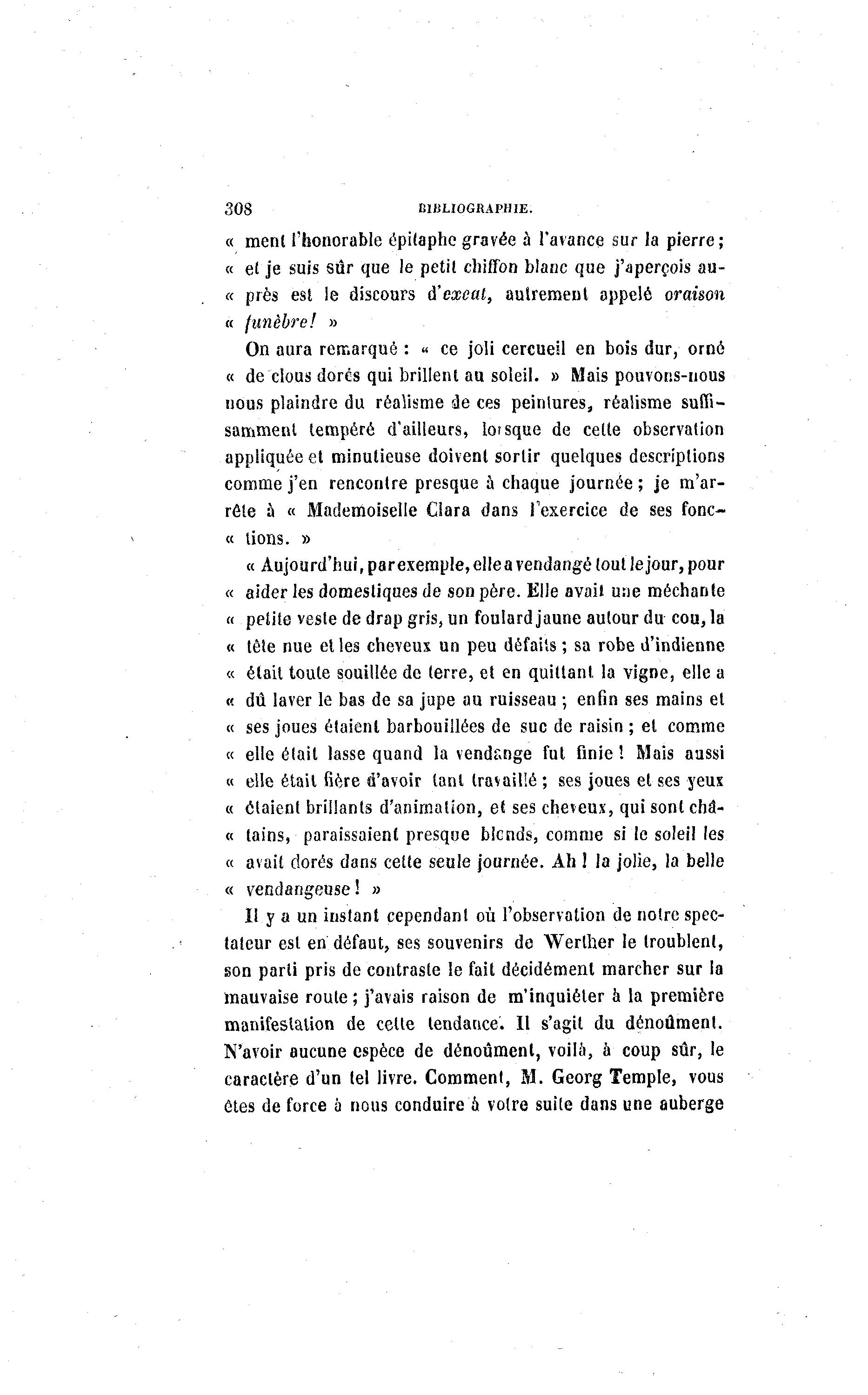 308 B11JUOGRAPH1E. « ment l'honorable épifaphc gravée à l'avance sur la pierre; « et je suis sûr que le petit chiffon blanc que j'aperçois au- « près est le discours à 'excat, autrement appelé oraison « funèbre! » On aura remarqué : « ce joli cercueil en bois dur, orne « de clous dorés qui brillent au soleil. » Mais pouvons-nous nous plaindre du réalisme à e ces peintures, réalisme suffi- samment tempéré d'ailleurs, lorsque de cette observation appliquée et minutieuse doivent sortir quelques descriptions comme j'en rencontre presque à chaque journée ; je m'ar- rête à « Mademoiselle Clara dans l'exercice de ses fonc- « lions. » « Aujourd'hui, parexemple,ellea vendangé tout le jour, pour « aider les domestiques de son père. Elle avait une méchante « petite veste de drap gris, un foulard jaune autour du cou, la « tête nue et les cheveux un peu défaits ; sa robe d'indienne « était toute souillée de terre, et en quittant la vigne, elle a « dû laver le bas de sa jupe au ruisseau ; enfin ses mains et « ses joues étaient barbouillées de suc de raisin ; et comme « elle était lasse quand la vendange fut finie ! Mais aussi « elle était fière d'avoir tant travaillé ; ses joues et ses yeux « étaient brillants d'animation, et ses cheveux, qui sont châ- « tains, paraissaient presque blcnds, comme si le soleil les « avait dorés dans cette seule journée. Ah ! la jolie, la belle « vendangeuse! » Il y a un instant cependant où l'observation de notre spec- tateur est en défaut, ses souvenirs de Werther le troublent, son parti pris de contraste le fait décidément marcher sur la mauvaise roule ; j'avais raison de m'inquiéler à la première manifestation de celle tendance. Il s'agit du dénoûmenl. N'avoir aucune espèce de dénoûmenl, voila, à coup sûr, le caractère d'un tel livre. Comment, M. Georg Temple, vous êtes de force à nous conduire à votre suile dans une auberge
