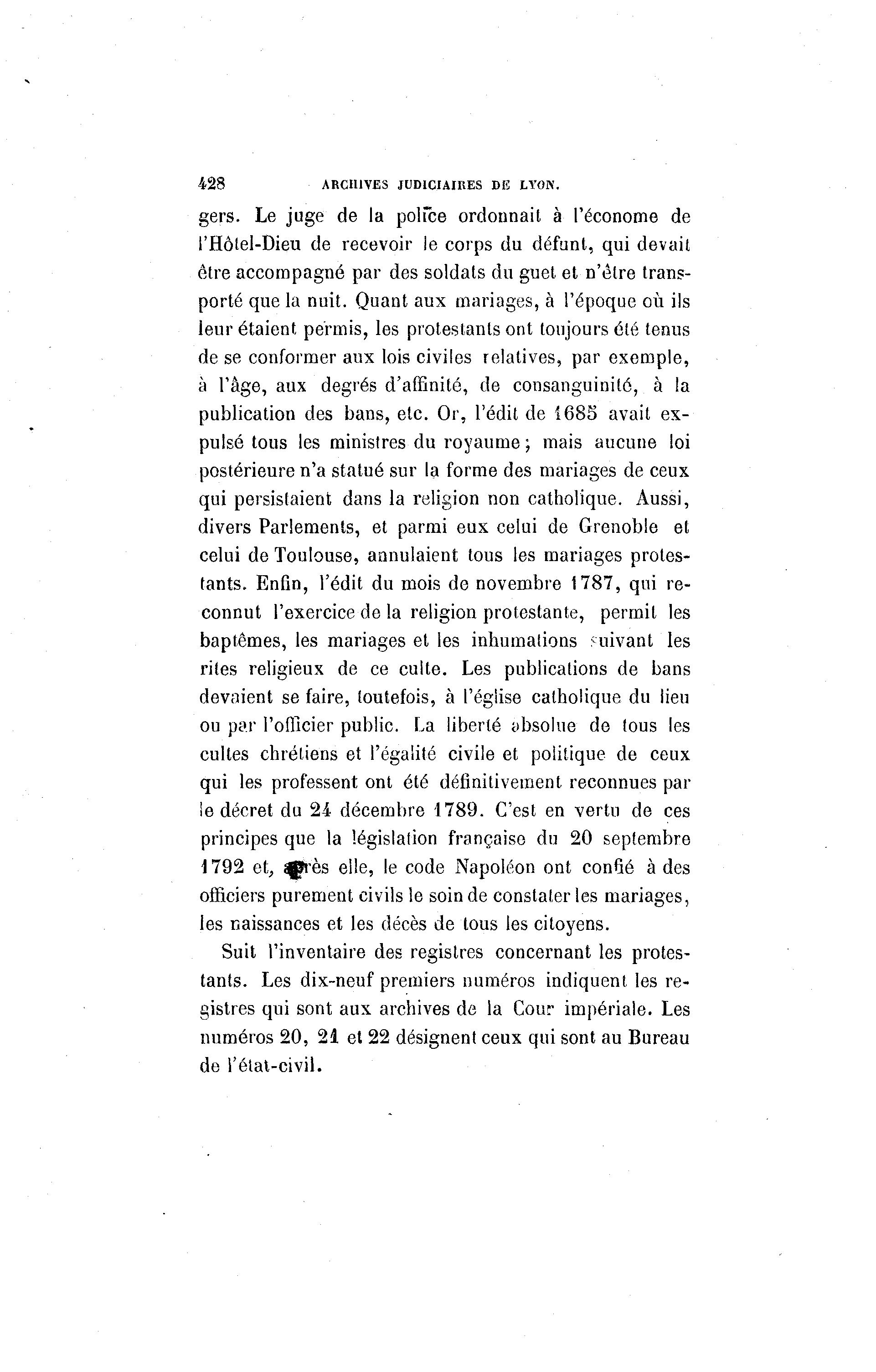 428 ARCHIVES JUDICIAIRES DE LYON. gers. Le juge de la police ordonnait à l'économe de l'Hôtel-Dieu de recevoir le corps du défunt, qui devait être accompagné par des soldats du guet et n'être trans- porté que la nuit. Quant aux mariages, à l'époque où ils ieur étaient permis, les protestants ont toujours été tenus de se conformer aux lois civiles relatives, par exemple, à l'âge, aux degrés d'affinité, de consanguinité, à la publication des bans, etc. Or, l'édit de 1685 avait ex- pulsé tous les ministres du royaume ; mais aucune loi postérieure n'a statué sur la forme des mariages de ceux qui persistaient dans la religion non catholique. Aussi, divers Parlements, et parmi eux celui de Grenoble et celui de Toulouse, annulaient tous les mariages protes- tants. Enfin, l'édit du mois de novembre 1787, qui re- connut l'exercice de la religion protestante, permit les baptêmes, les mariages et les inhumations «uivant les rites religieux de ce culte. Les publications de bans devaient se faire, toutefois, à l'église catholique du lieu ou par l'officier public. La liberté absolue de tous les cultes chrétiens et l'égalité civile et politique de ceux qui les professent ont été définitivement reconnues par le décret du 24 décembre 1789. C'est en vertu de ces principes que la législation française du 20 septembre 1792 et, qprès elle, le code Napoléon ont confié à des officiers purement civils le soin de constater les mariages, les naissances et les décès de tous les citoyens. Suit l'inventaire des registres concernant les protes- tants. Les dix-neuf premiers numéros indiquent les re- gistres qui sont aux archives de la Cour impériale. Les numéros 20, 21 et 22 désignent ceux qui sont au Bureau de l'état-civil.