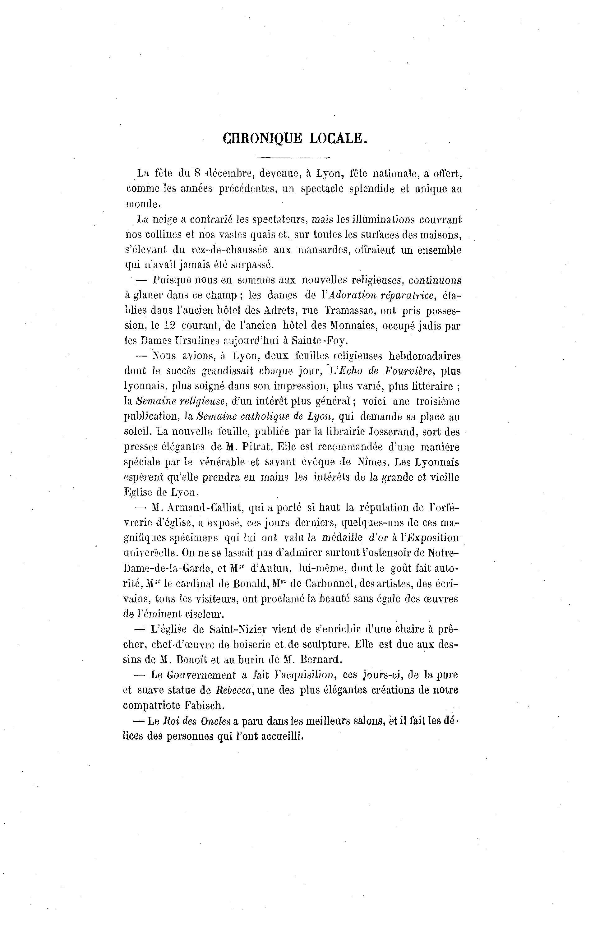 CHRONIQUE LOCALE. La fête du 8 -décembre, devenue, à Lyon, fête nationale, a offert, comme les années précédentes, un spectacle splendide et unique au monde. La neige a contrarié les spectateurs, mais les illuminations couvrant nos collines et nos vastes quais et, sur toutes les surfaces des maisons, s'élevant du rez-de-chaussée aux mansardes, offraient un ensemble qui n'avait jamais été surpassé. — Puisque nous en sommes aux nouvelles religieuses, continuons à glaner dans ce champ ; les dames de l'Adoration réparatrice, éta- blies dans l'ancien hôtel des Adrets, rue Tramassac, ont pris posses- sion, le 12 courant, de l'ancien hôtel des Monnaies, occupé jadis par les Dames Ursulines aujourd'hui à Sainte-Foy. — Nous avions, à Lyon, deux feuilles religieuses hebdomadaires dont le succès grandissait chaque jour, L'Echo de Fourvière, plus lyonnais, plus soigné dans son impression, plus varié, plus littéraire ; la Semaine religieuse, d'un intérêt plus général ; voici une troisième publication, la Semaine catholique de Lyon, qui demande sa place au soleil. La nouvelle feuille, publiée par la librairie Josserand, sort des presses élégantes de M. Pitrat. Elle est recommandée d'une manière spéciale par le vénérable et savant évêque de Nîmes. Les Lyonnais espèrent qu'elle prendra en mains les intérêts de la grande et vieille Eglise de Lyon. — M. Armand-Galbât, qui a porté si haut la réputation de l'orfè- vrerie d'église, a exposé, ces jours derniers, quelques-uns de ces ma- gnifiques spécimens qui lui ont valu la médaille d'or à l'Exposition universelle. On ne se lassait pas d'admirer surtout l'ostensoir de Notre- Dame-de-la-Garde, et W d'Autun, lui-même, dont le goût fait auto- rité, M" le cardinal de Bonald, M8' de Carbonnel, des artistes, des écri- vains, tous les visiteurs, ont proclamé la beauté sans égale des œuvres de l'éminent ciseleur. — L'église de Saint-Nizier vient de s'enrichir d'une chaire à prê- cher, chef-d'œuvre de boiserie et.de sculpture. Elle est due aux des- sins de M. Benoit et au burin de M. Bernard. — Le Gouvernement a fait l'acquisition, ces jours-ci, de la pure et suave statue de Rebecca, une des plus élégantes créations de notre compatriote Fabisch. — Le Roi des Oncles a paru dans les meilleurs salons, et il fait les dé • lices des personnes qui l'ont accueilli.