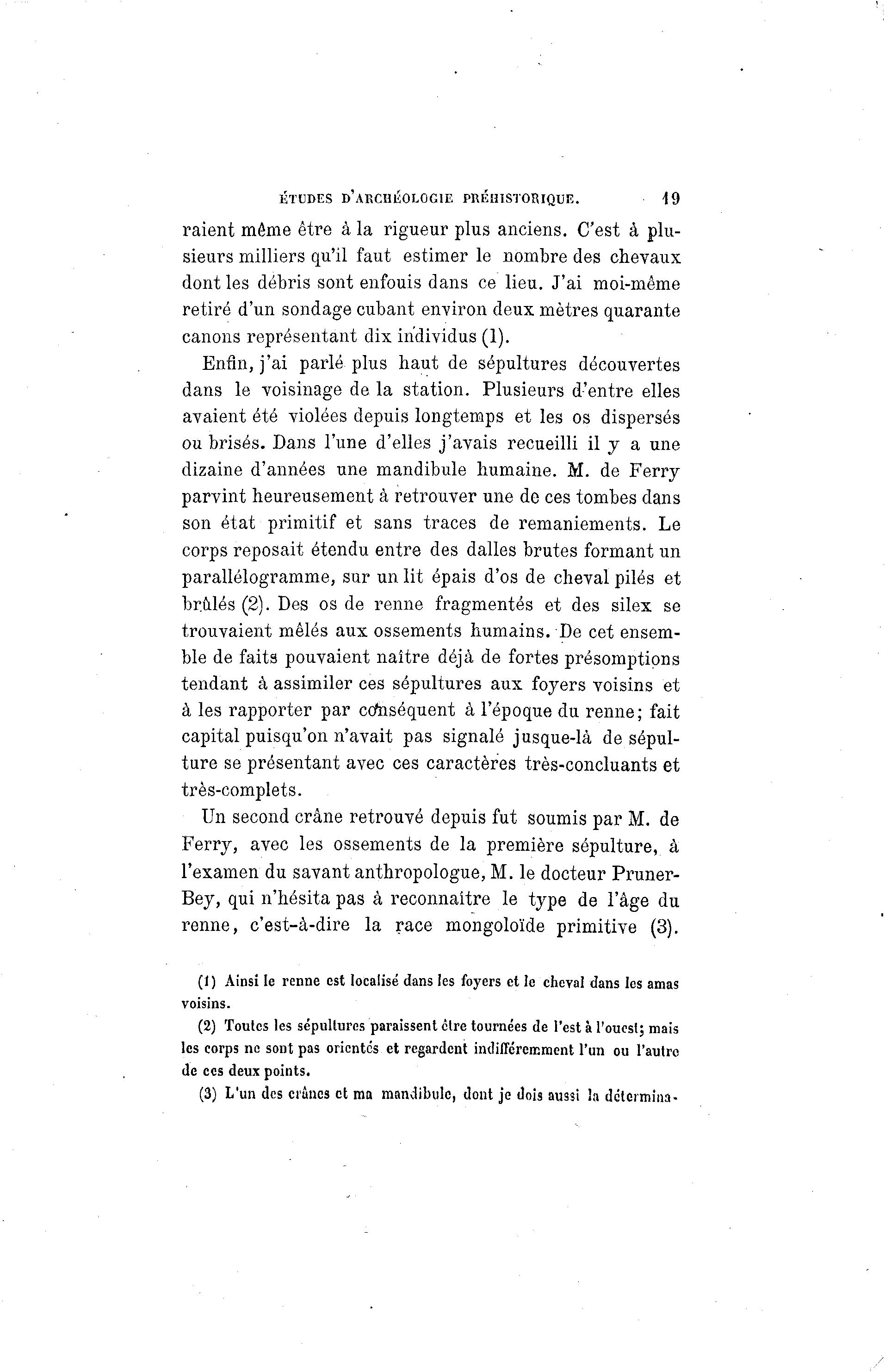 ÉTUDES D'ARCHÉOLOGIE PRÉHISTORIQUE. 49 raient même être à la rigueur plus anciens. C'est à plu- sieurs milliers qu'il faut estimer le nombre des chevaux dont les débris sont enfouis dans ce lieu. J'ai moi-même retiré d'un sondage cubant environ deux mètres quarante canons représentant dix individus (1). Enfin, j'ai parlé plus haut de sépultures découvertes dans le voisinage de la station. Plusieurs d'entre elles avaient été violées depuis longtemps et les os dispersés ou brisés. Dans l'une d'elles j'avais recueilli il y a une dizaine d'années une mandibule humaine. M. de Ferry parvint heureusement à retrouver une de ces tombes dans son état primitif et sans traces de remaniements. Le corps reposait étendu entre des dalles brutes formant un parallélogramme, sur un lit épais d'os de cheval piles et brûlés (2). Des os de renne fragmentés et des silex se trouvaient mêlés aux ossements humains. De cet ensem- ble de faits pouvaient naître déjà de fortes présomptions tendant à assimiler ces sépultures aux foyers voisins et à les rapporter par conséquent à l'époque du renne; fait capital puisqu'on n'avait pas signalé jusque-là de sépul- ture se présentant avec ces caractères très-concluants et très-complets. Un second crâne retrouvé depuis fut soumis par M. de Ferry, avec les ossements de la première sépulture, à l'examen du savant anthropologue, M. le docteur Pruner- Bey, qui n'hésita pas à reconnaître le type de l'âge du renne, c'est-à -dire la race mongoloïde primitive (3). (1 ) Ainsi le renne est localisé dans les foyers et le cheval dans les amas voisins. (2) Toutes les sépultures paraissent être tournées de l'est à l'ouest; mais les corps ne sont pas orientes et regardent indifféremment l'un ou l'autre de ces deux points. (3) L'un des ciines et ma mandibule, dont je dois aussi la détermina-