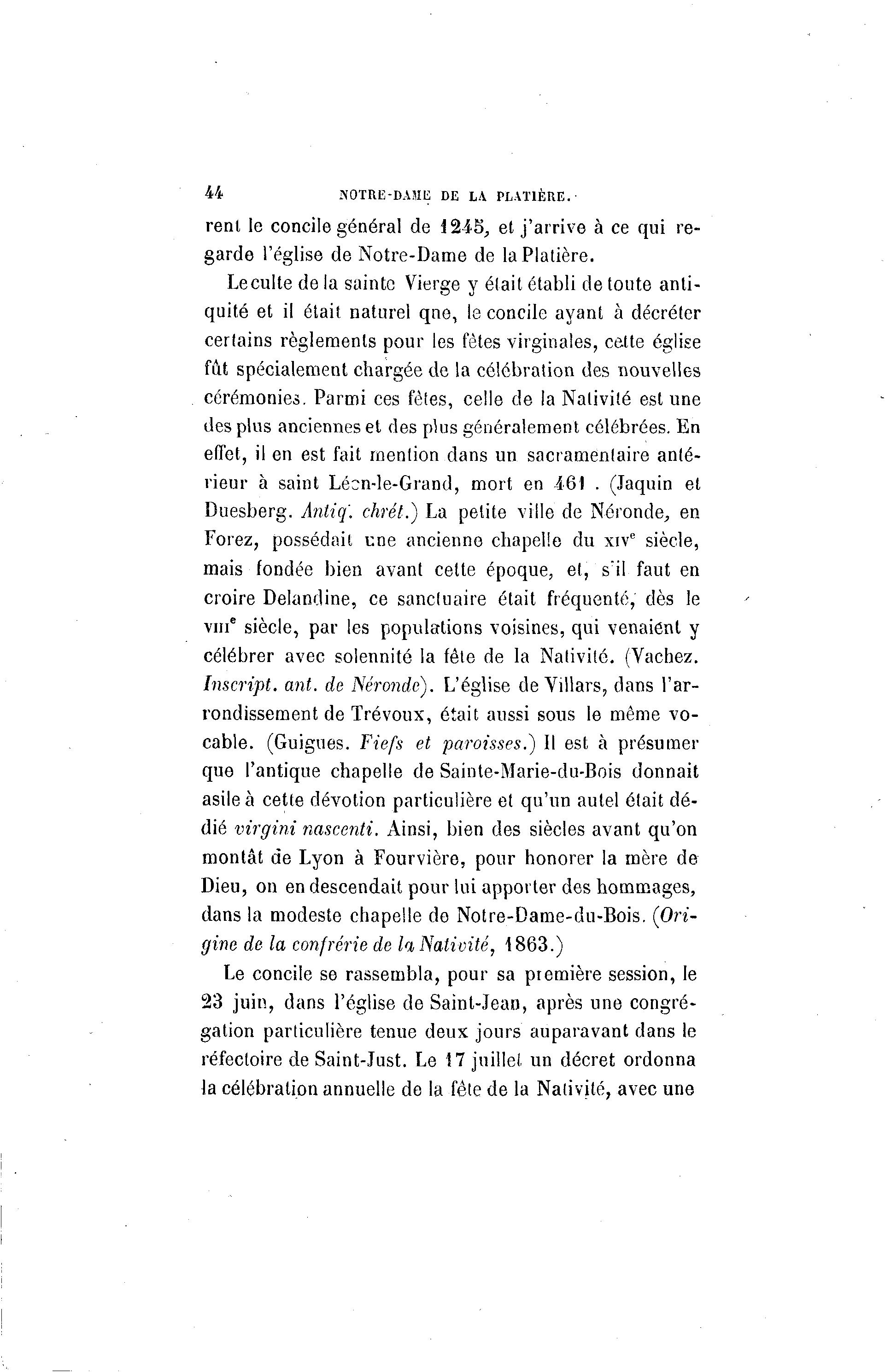 44 NOTRE-DAME DE LA PLAT1ÈRE. rent le concile général de 1245, et j'arrive à ce qui re- garde l'église de Notre-Dame de laPlatière. Le culte de la sainte Vierge y était établi de toute anti- quité et il était naturel qne, le concile ayant à décréter certains règlements pour les fêtes virginales, cette église fût spécialement chargée de la célébration des nouvelles cérémonies. Parmi ces fêtes, celle de la Nativité est une des plus anciennes et des plus généralement célébrées. En effet, il en est fait mention dans un sacramenlaire anté- rieur à saint Léon-îe-Grand, mort en 461 . (Jaquin et Duesberg. Antiq. chrél.) La petite ville de Néronde, en Forez, possédait une ancienne chapelle du xive siècle, mais fondée bien avant celte époque, et, s'il faut en croire Delandine, ce sanctuaire était fréquenté, dès le vme siècle, par les populations voisines, qui venaient y célébrer avec solennité la fête de la Nativité. (Vachez. Inscript, ant. de Nércnidc). L'église de Villars, dans l'ar- rondissement de Trévoux, était aussi sous le même vo- cable. (Guignes. Fiefs et paroisses.) Il est à présumer que l'antique chapelle de Sainte-Marie-du-Bois donnait asile à cette dévotion particulière et qu'un autel était dé- dié virgini nascenti. Ainsi, bien des siècles avant qu'on montât de Lyon à Fourvière, pour honorer la mère de Dieu, on en descendait pour lui apporter des hommages, dans la modeste chapelle de Notre-Dame-du-Bois. (Ori- gine de la confrérie de h Nativité, 4863.) Le concile se rassembla, pour sa ptemière session, le 23 juin, dans l'église de Saint-Jean, après une congré- gation particulière tenue deux jours auparavant dans le réfectoire de Saint-Just. Le 17 juillet un décret ordonna la célébration annuelle de la fête de la Nativité, avec une