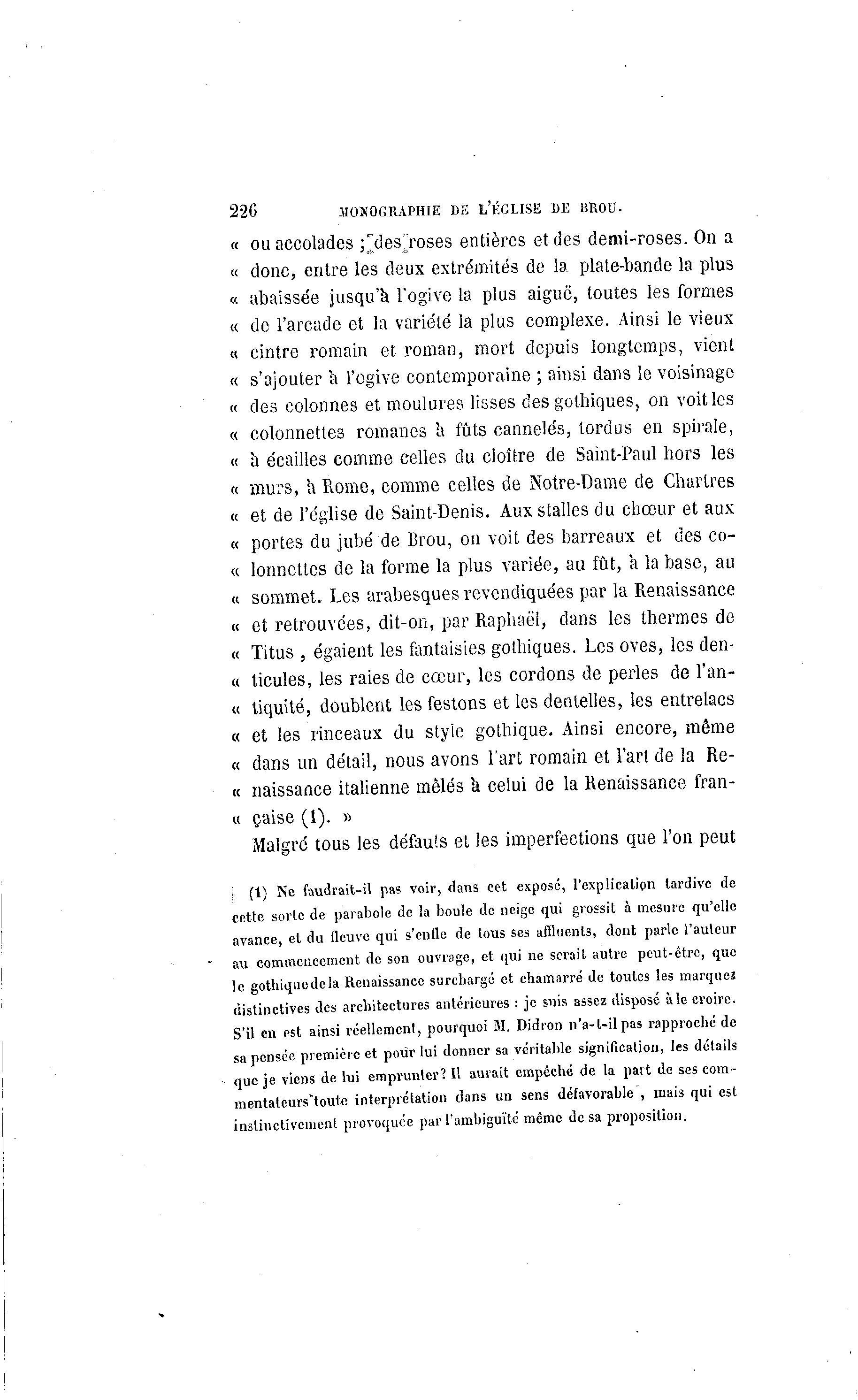 22G MONOGRAPHIE DS L'ÉGLISE DE BROU. « ou accolades ;"des/oses entières et des demi-roses. On a « donc, entre les deux extrémités de la plate-bande la plus « abaissée jusqu'à l'ogive la plus aiguë, toutes les formes « de l'arcade et la variété la plus complexe. Ainsi le vieux « cintre romain et roman, mort depuis longtemps, vient « s'ajouter a l'ogive contemporaine ; ainsi dans le voisinage « des colonnes et moulures lisses des gothiques, on voit les « colonnettes romanes h fûts cannelés, tordus en spirale, « à écailles comme celles du cloître de Saint-Paul hors les « murs, a Rome, comme celles de Notre-Dame de Chartres « et de l'église de Saint-Denis. Aux stalles du chœur et aux « portes du jubé de Brou, on voit des barreaux et des co- « lonnettes de la forme la plus variée, au fût, a la base, au « sommet. Les arabesques revendiquées par la Renaissance « et retrouvées, dit-on, par Raphaël, dans les thermes de « Titus , égaient les fantaisies gothiques. Les oves, les den- « ticules, les raies de cœur, les cordons de perles de l'an- « tiquité, doublent les festons et les dentelles, les entrelacs « et les rinceaux du style gothique. Ainsi encore, môme « dans un détail, nous avons l'art romain et Fart de la Re- « naissance italienne mêlés à celui de la Renaissance fran- « çaise (1). » Malgré tous les défauts et les imperfections que l'on peut i (1) Ne faudrait-il pas voir, dans cet exposé, 1'explicalion tardive de cette sorte de parabole de la boule de neige qui grossit à mesure qu'elle avance, et du fleuve qui s'enfle de tous ses affluents, dont parle l'auteur au commencement de son ouvrage, et qui ne serait autre peut-être, que le gothiquedela Renaissance surchargé et chamarré de toutes les marques distinctives des architectures antérieures : je suis assez disposé aie croire. S'il en est ainsi réellement, pourquoi M. Didion n'a-t-ilpas rapproché de sa pensée première et pour lui donner sa véritable signification, les détails que je viens de lui emprunter? Il aurait empêché de la part de ses com- mentatcurs'toute interprétation dans un sens défavorable , mais qui est instinctivement provoquée par l'ambiguïté même de sa proposition.