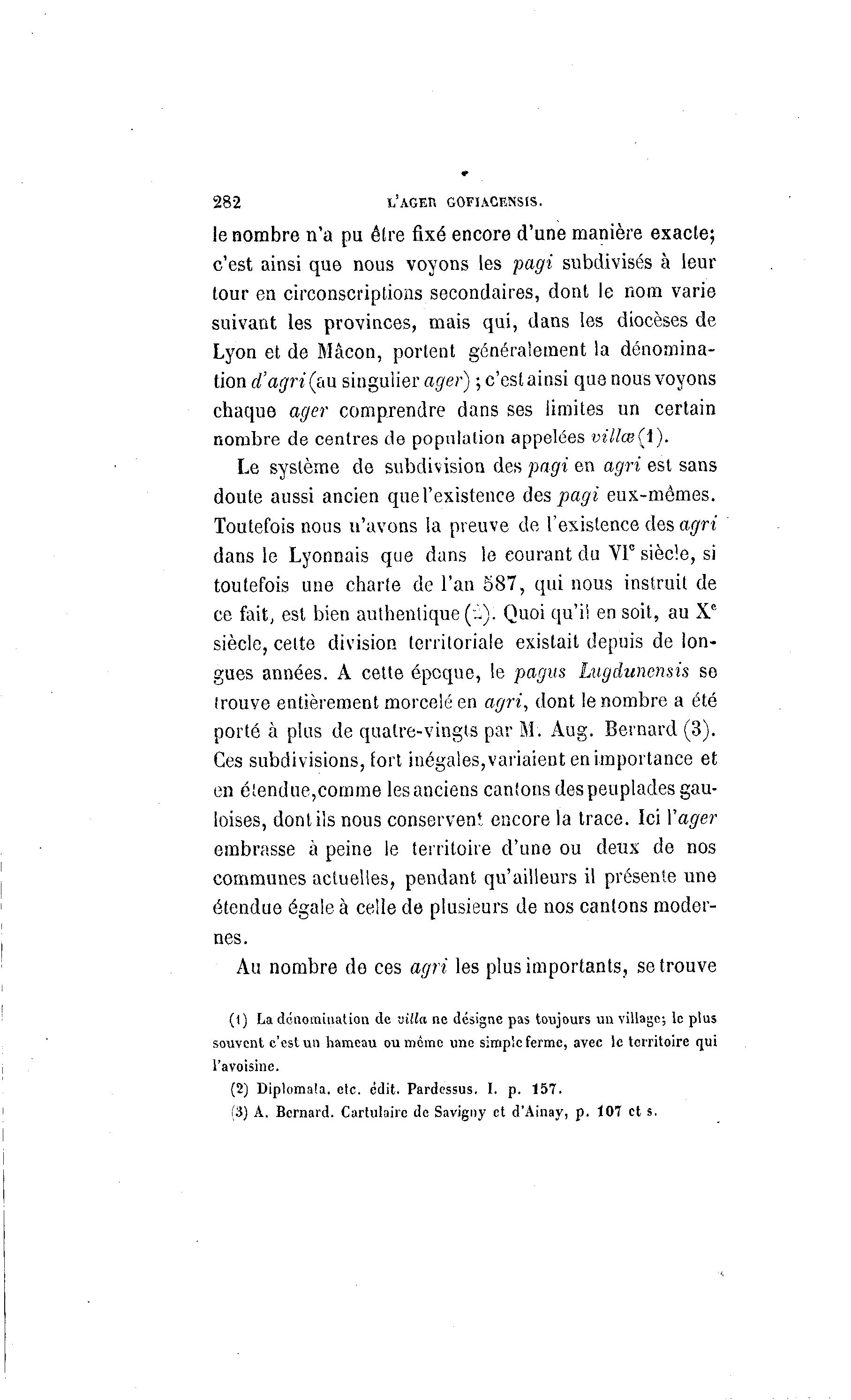 282 I/AGER GOFIAOENSIS. le nombre n'a pu être fixé encore d'une manière exacte; c'est ainsi que nous voyons les pagi subdivisés à leur tour en circonscriptions secondaires, dont le nom varie suivant les provinces, mais qui, dans les diocèses de Lyon et de Mâcon, portent généralement la dénomina- tion cïagri (au singulier ager) ; c'est ainsi que nous voyons chaque ager comprendre dans ses limites un certain nombre de centres de population appelées villœÇi). Le système de subdivision des pagi en agri est sans doute aussi ancien que l'existence des pagi eux-mêmes. Toutefois nous n'avons la preuve de l'existence des agri dans le Lyonnais que dans le eourant du VIe siècle, si toutefois une charte de l'an 587, qui nous instruit de ce fait, est bien authentique (i,). Quoi qu'il en soit, au Xe siècle, cette division territoriale existait depuis de lon- gues années. A cette époque, le pagus lugdunensis se (rouve entièrement morcelé en agri, dont le nombre a été porté à plus de quatre-vingts par M. Aug. Bernard (3). Ces subdivisions, fort inégales, variaient en importance et en étendue,comme les anciens cantons des peuplades gau- loises, dont ils nous conservent encore la trace. Ici Y ager embrasse à peine le territoire d'une ou deux de nos communes actuelles, pendant qu'ailleurs il présente une étendue égale à celle de plusieurs de nos cantons moder- nes. Au nombre de ces agri les plus importants, se trouve (1) La dénomination de villa ne désigne pas toujours un village; le plus souvent c'est un hameau ou même une simple ferme, avec le territoire qui l'avoisine. (2) Diplomata. etc. edit. Pardessus. I. p. 157. (3) A. Bernard. Cartulairc de Savigny et d'Ainay, p . 107 et s.
