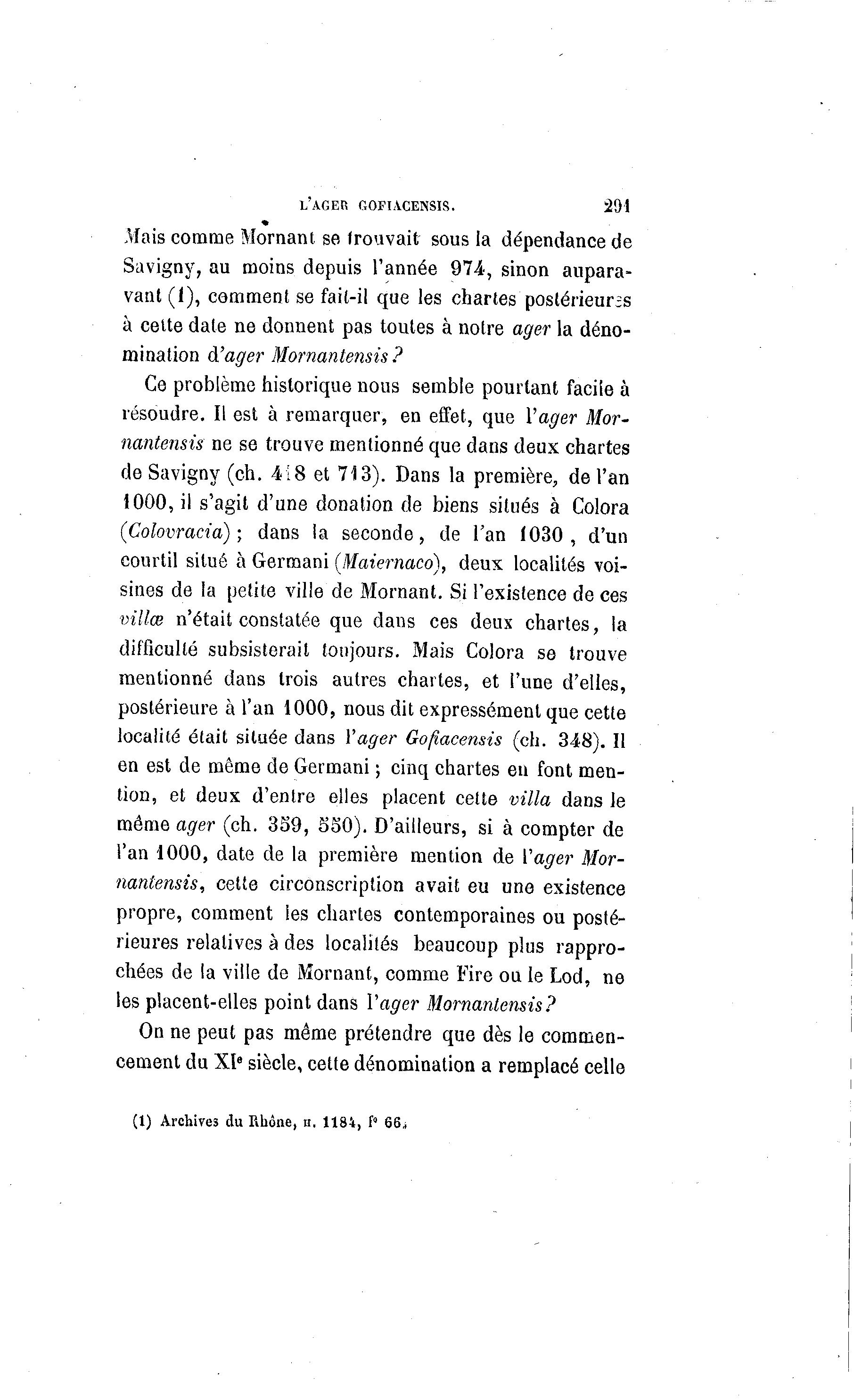 L'ACIER GOFIACENSIS. 291 Mais comme Mornant se trouvait sous la dépendance de Savigny, au moins depuis l'année 974, sinon aupara- vant (1), comment se fail-il que les chartes postérieures à cette date ne donnent pas toutes à notre ager la déno- mination à 'ager Mornantensis ? Ce problème historique nous semble pourtant facile à résoudre. Il est à remarquer, en effet, que Yager Mor- nantensis ne se trouve mentionné que dans deux chartes de Savigny (ch. 418 et 713). Dans la première, de l'an 1000, il s'agit d'une donation de biens situés à Colora (Colovracia) ; dans la seconde, de l'an Ã030 , d'un courtil situé à Germani (Maiernacd), deux localités voi- sines de la petite ville de Mornant. Si l'existence de ces villas n'était constatée que dans ces deux chartes, la difficulté subsisterait toujours. Mais Colora se trouve mentionné dans trois autres chartes, et l'une d'elles, postérieure à l'an 1000, nous dit expressément que cette localité était située dans Yager Goftacensis (ch. 348). Il en est de même de Germani ; cinq chartes en font men- tion, et deux d'entre elles placent cette villa dans le même ager (ch. 359, 550). D'ailleurs, si à compter de l'an 1000, date de la première mention de Yager Mor- nantensis, cette circonscription avait eu une existence propre, comment ies chartes contemporaines ou posté- rieures relatives à des localités beaucoup plus rappro- chées de la ville de Mornant, comme Fire ou le Lod, ne les placent-elles point dans Yager Mornantensis? On ne peut pas même prétendre que dès le commen- cement du XIe siècle, cette dénomination a remplacé celle (1) Archives du Rhône, a. 1184, i" 66,