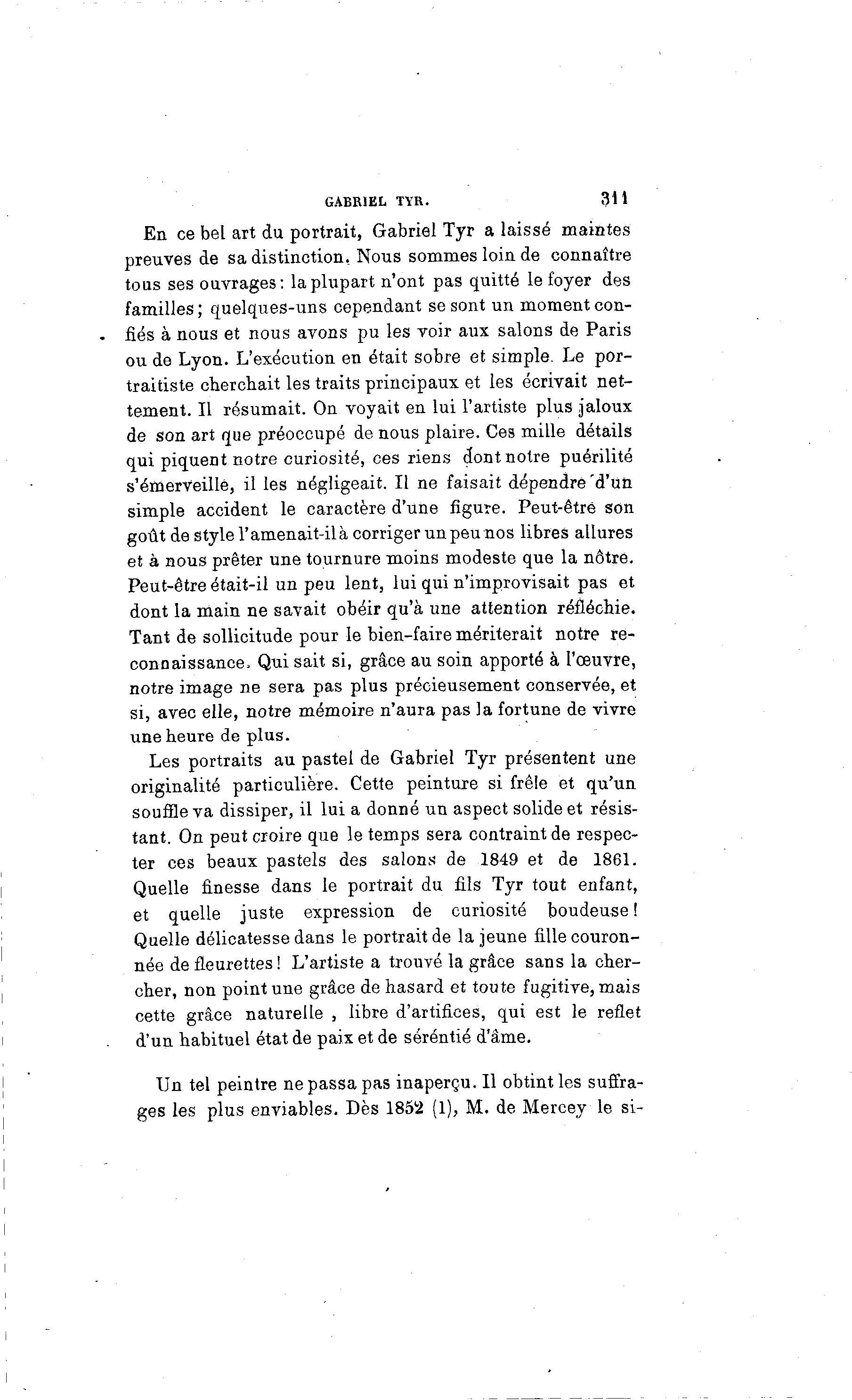 GABRIEL TYR. 311 En ce bel art du portrait, Gabriel Tyr a laissé maintes preuves de sa distinction, Nous sommes loin de connaître tous ses ouvrages: la plupart n'ont pas quitté le foyer des familles ; quelques-uns cependant se sont un moment con- fiés à nous et nous avons pu les voir aux salons de Paris ou de Lyon. L'exécution en était sobre et simple. Le por- traitiste cherchait les traits principaux et les écrivait net- tement. Il résumait. On voyait en lui l'artiste plus jaloux de son art que préoccupé de nous plaire. Ces mille détails qui piquent notre curiosité, ces riens dont notre puérilité s'émerveille, il les négligeait. Il ne faisait dépendre 'd'un simple accident le caractère d'une figure. Peut-être son goût de style l'amenait-ilà corriger un peu nos libres allures et à nous prêter une tournure moins modeste que la nôtre. Peut-être était-il un peu lent, lui qui n'improvisait pas et dont la main ne savait obéir qu'à une attention réfléchie. Tant de sollicitude pour le bien-faire mériterait notre re- connaissance. Qui sait si, grâce au soin apporté à l'œuvre, notre image ne sera pas plus précieusement conservée, et si, avec elle, notre mémoire n'aura pas la fortune de vivre une heure de plus. Les portraits au pastel de Gabriel Tyr présentent une originalité particulière. Cette peinture si frêle et qu'un souffle va dissiper, il lui a donné un aspect solide et résis- tant. On peut croire que le temps sera contraint de respec- ter ces beaux pastels des salons de 1849 et de 1861. Quelle finesse dans le portrait du fils Tyr tout enfant, et quelle juste expression de curiosité boudeuse ! Quelle délicatesse dans le portrait de la jeune fille couron- née de fleurettes ! L'artiste a trouvé la grâce sans la cher- cher, non point une grâce de hasard et toute fugitive, mais cette grâce naturelle , libre d'artifices, qui est le reflet d'un habituel état de paix et de séréntié d'âme. Un tel peintre ne passa pas inaperçu. Il obtint les suffra- ges les plus enviables. Dès 1852 (1), M. de Mercey le si-