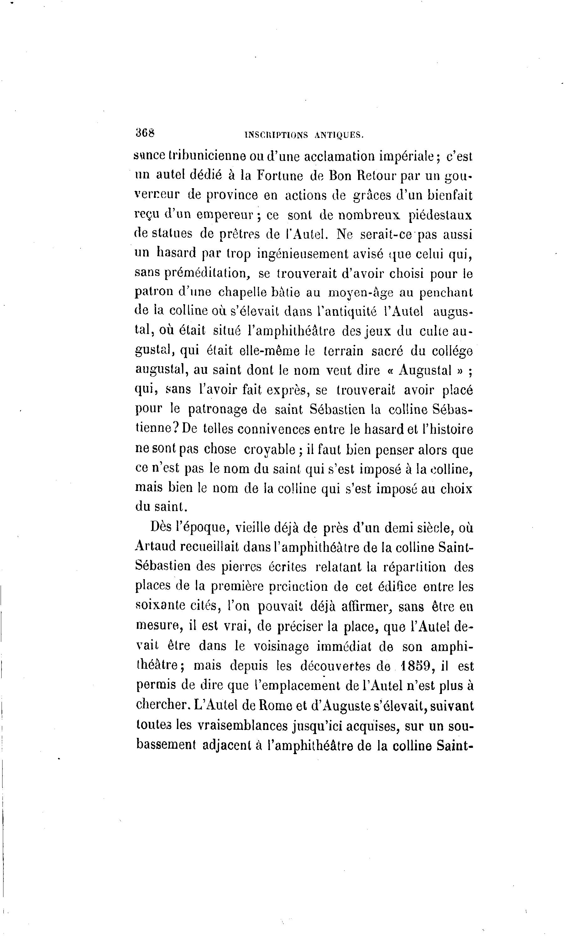 368 INSCRIPTIONS ANTIQUES. sunce tnbunicienne ou d'une acclamation impériale ; c'est un autel dédié à la Fortune de Bon Retour par un gou- verneur de province en actions de grâces d'un bienfait reçu d'un empereur ; ce sont de nombreux piédestaux de statues de prêtres de l'Autel. Ne serait-ce pas aussi un hasard par trop ingénieusement avisé que celui qui, sans préméditation, se trouverait d'avoir choisi pour ie patron d'une chapelle bâtie au moyen-âge au penchant de la colline où s'élevait dans l'antiquité l'Autel augus- tal, où était situé l'amphithéâtre des jeux du culte au- gustal, qui était elle-même le terrain sacré du collège augustal, au saint dont le nom veut dire « Augustal » ; qui, sans l'avoir fait exprès, se trouverait avoir placé pour le patronage de saint Sébastien la colline Sébas- tienne?De telles connivences entre le hasard et l'histoire ne sont pas chose croyable ; il faut bien penser alors que ce n'est pas le nom du saint qui s'est imposé à la colline, mais bien le nom de la colline qui s'est imposé au choix du saint. Dès l'époque, vieille déjà de près d'un demi siècle, où Artaud recueillait dans l'amphithéâtre de la colline Saint- Sébastien des pierres écrites relatant la répartition des places de la première prcinction de cet édifice entre les soixante cités, l'on pouvait déjà affirmer, sans être en mesure, il est vrai, de préciser la place, que l'Autel de- vait être dans le voisinage immédiat de son amphi- théâtre; mais depuis les découvertes de. 1859, il est permis de dire que l'emplacement de l'Autel n'est plus à chercher. L'Autel de Rome et d'Auguste s'élevait, suivant toutes les vraisemblances jusqu'ici acquises, sur un sou- bassement adjacent à l'amphithéâtre de la colline Saint-