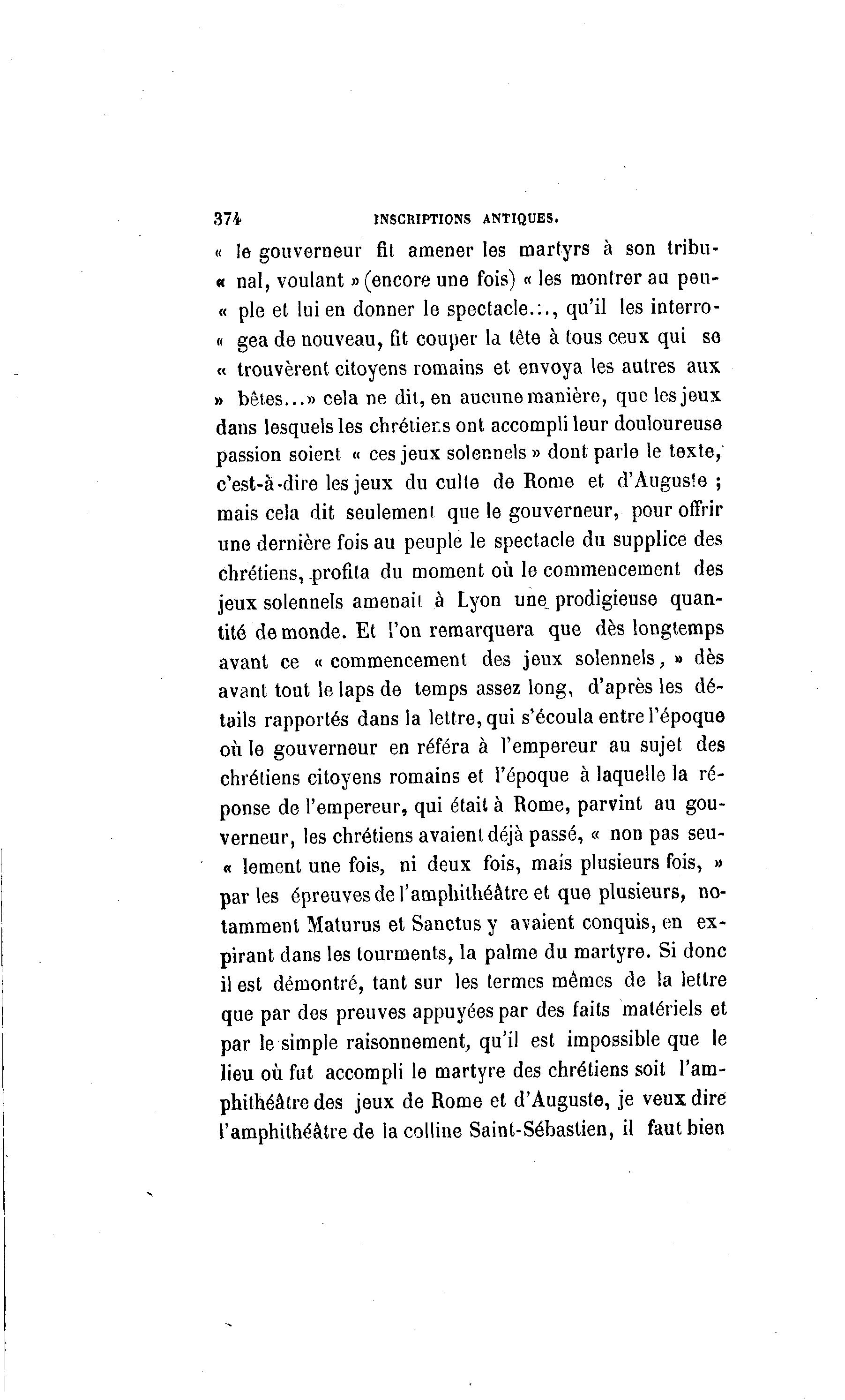 374 INSCRIPTIONS ANTIQUES. « le gouverneur fit amener les martyrs à son tribu- « nal, voulant » (encore une fois) « les montrer au peu- « pie et lui en donner le spectacle.:., qu'il les interro- « gea de nouveau, fit couper la tête à tous ceux qui se « trouvèrent citoyens romains et envoya les autres aux » bêtes...» cela ne dit, en aucune manière, que les jeux dans lesquels les chrétiers ont accompli leur douloureuse passion soient « ces jeux solennels » dont parle le texte, c'est-à -dire les jeux du culte de Rome et d'Auguste; mais cela dit seulement que le gouverneur, pour offrir une dernière fois au peuple le spectacle du supplice des chrétiens, .profita du moment où le commencement des jeux solennels amenait à Lyon une, prodigieuse quan- tité de monde. Et l'on remarquera que dès longtemps avant ce «commencement des jeux solennels, » dès avant tout le laps de temps assez long, d'après les dé- tails rapportés dans la lettre, qui s'écoula entre l'époque où le gouverneur en référa à l'empereur au sujet des chrétiens citoyens romains et l'époque à laquelle la ré- ponse de l'empereur, qui était à Rome, parvint au gou- verneur, les chrétiens avaient déjà passé, « non pas seu- « lement une fois, ni deux fois, mais plusieurs fois, » parles épreuves de l'amphithéâtre et que plusieurs, no- tamment Maturus et Sanctus y avaient conquis, en ex- pirant dans les tourments, la palme du martyre. Si donc il est démontré, tant sur les termes mêmes de la lettre que par des preuves appuyées par des faits matériels et par le simple raisonnement, qu'il est impossible que le lieu où fut accompli le martyre des chrétiens soit l'am- phithéâtre des jeux de Rome et d'Auguste, je veux dire l'amphithéâtre de la colline Saint-Sébastien, il faut bien