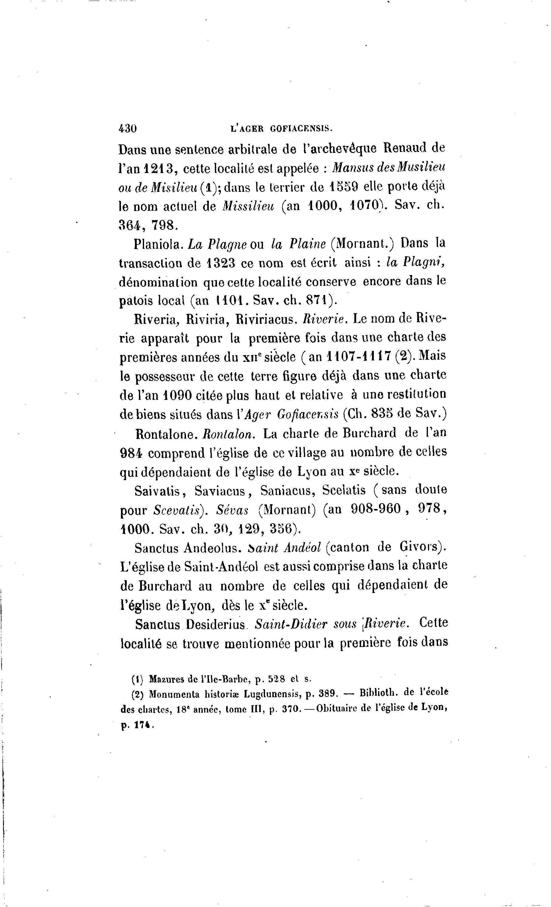 430 L'AGER GOFIACENSIS. Dans une sentence arbitrale de l'archevêque Renaud de l'an 1213, cette localité est appelée : Mansus desMusilieu ou de Misilieu (1); dans le terrier de 1559 elle porte déjà le nom actuel de Missilieu (an 1000, 1070). Sav. ch. 364, 798. Planiola. La Plagne ou la Plaine (Mornant.) Dans la transaction de 1323 ce nom est écrit ainsi : la Plagni, dénomination que cette localité conserve encore dans le patois local (an 1101. Sav. ch. 871). Riveria, Riviria, Riviriacus. Riverie, Le nom de Rive- rie apparaît pour la première fois dans une charte des premières années du xncsiècle (an 1107-1117 (2).Mais le possesseur de cette terre figure déjà dans une charte de l'an 1090 citée plus haut et relative à une restitution de biens situés dans YAger Gofiacer.ais (Ch. 835 de Sav.) Rontalone. Rontalon. La charte de Burchard de l'an 984 comprend l'église de ce village au nombre de celles qui dépendaient de l'église de Lyon au xe siècle. Saivatis, Saviacus, Saniacus, Scelatis (sans doute pour Scevatis). Sévas (Mornant) (an 908-960, 978, 1000. Sav. ch. 30, 129, 356). Sanctus Andeolus. baint Andéol (canton de Givors). L'église de Saint-Andéol est aussi comprise dans la charte de Burchard au nombre de celles qui dépendaient de l'église de Lyon, dès le x" siècle. Sanctus Desiderius Saint-Didier sous \Riverie. Cette localité se trouve mentionnée pour la première fois dans (1) Mazures de l'Ilc-Barbe, p. 528 et s. (2) Monumenta historiae Lugdunensis, p. 389. — Biblioth. de l'école des chartes, 18e année, tome III, p. 370.—Obituaire de l'église de Lyon, p. 174.