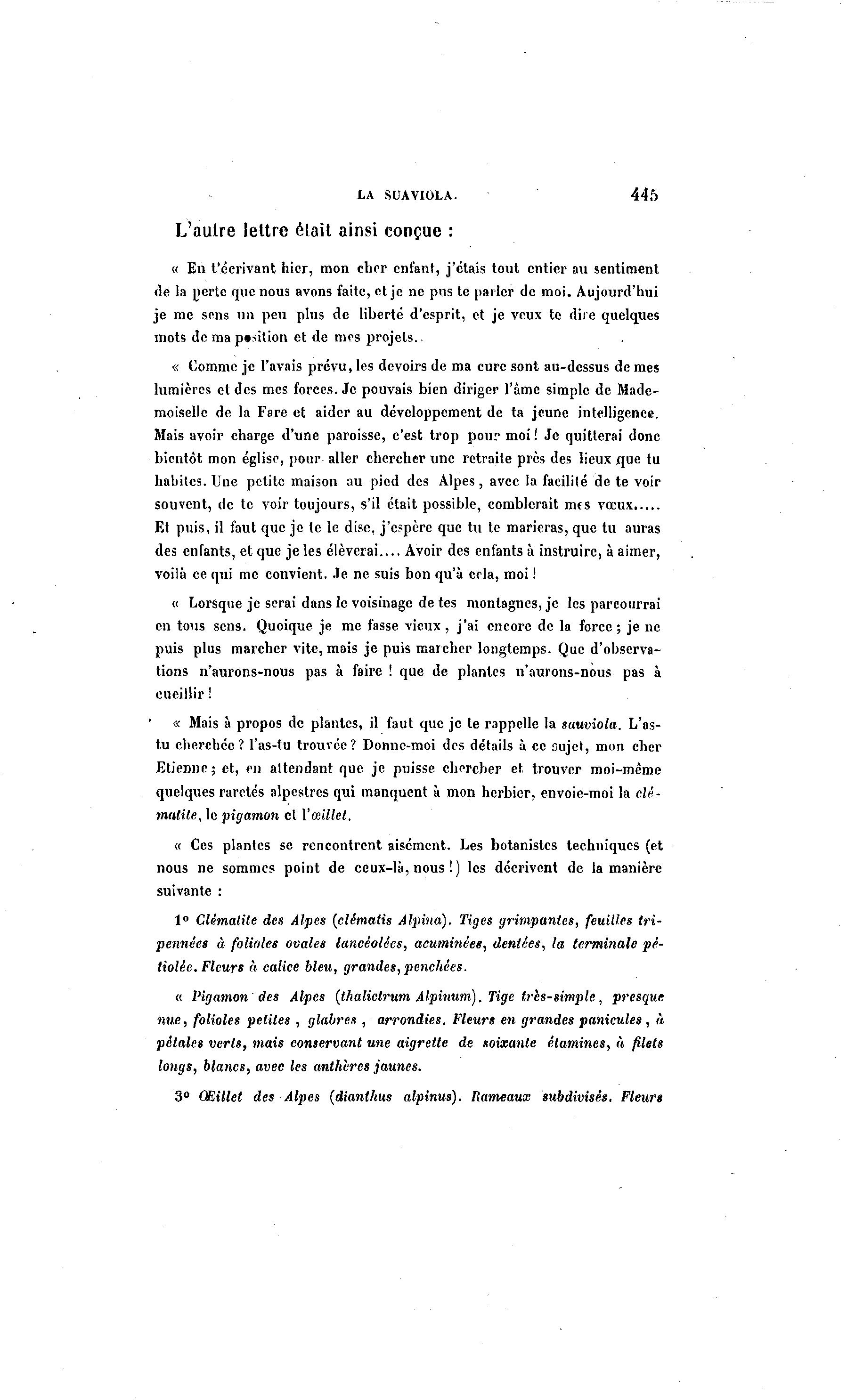 LA SUAVIOLA. 445 L'autre lettre était ainsi conçue : « En t'écrivant hier, mon cher enfant, j'étais tout entier au sentiment de la perte que nous avons faite, et je ne pus te parler de moi. Aujourd'hui je me sens un peu plus de liberté d'esprit, et je veux te dire quelques mots de ma position et de mes projets. « Comme je l'avais prévu, les devoirs de ma cure sont au-dessus de mes lumières et des mes forces. Je pouvais bien diriger l'âme simple de Made- moiselle de la Fare et aider au développement de ta jeune intelligence. Mais avoir charge d'une paroisse, c'est trop pour moi ! Je quitterai donc bientôt mon église, pour aller chercher une retraite près des lieux que tu habites. Une petite maison au pied des Alpes, avec la facilité de te voir souvent, de te voir toujours, s'il était possible, comblerait mes voeux Et puis, il faut que je le le dise, j'espère que tu te marieras, que tu auras des enfants, et que je les élèverai.... Avoir des enfants à instruire, à aimer, voilà ce qui me convient. Je ne suis bon qu'à cela, moi ! « Lorsque je serai dans le voisinage de tes montagnes, je les parcourrai en tous sens. Quoique je me fasse vieux, j'ai encore de la force ; je ne puis plus marcher vite, mais je puis marcher longtemps. Que d'observa- tions n'aurons-nous pas à faire ! que de plantes n'aurons-nous pas à cueillir ! « Mais à propos de plantes, il faut que je te rappelle la sauviola. L'as- tu cherchée? l'as-tu trouvée? Donne-moi des détails à ce sujet, mon cher Etienne; et, en attendant que je puisse chercher et trouver moi-même quelques raretés alpestres qui manquent à mon herbier, envoie-moi la clé- matite, le pigamon et Vœillet. « Ces plantes se rencontrent aisément. Les botanistes techniques (et nous ne sommes point de ceux-là , nous !) les décrivent de la manière suivante : 1° Clématite des Alpes (clématis Âlpina). Tiges grimpantes, feuilles tri- pennées à folioles ovales lancéolées, acuminées, dentées, la terminale pé- tioléc. Fleurs à calice bleu, grandes, penchées. « Pigamon des Alpes (thaliclrum Alpinum). Tige très-simple, presque nue, folioles petites , glabres , arrondies. Fleurs en grandes panicules, à pétales verts, mais conservant une aigrette de soixante etamines, à filets longs, blancs, avec les anthères jaunes. 3° Œillet des Alpes (dianthus alpinus). Rameaux subdivisés. Fleurs
