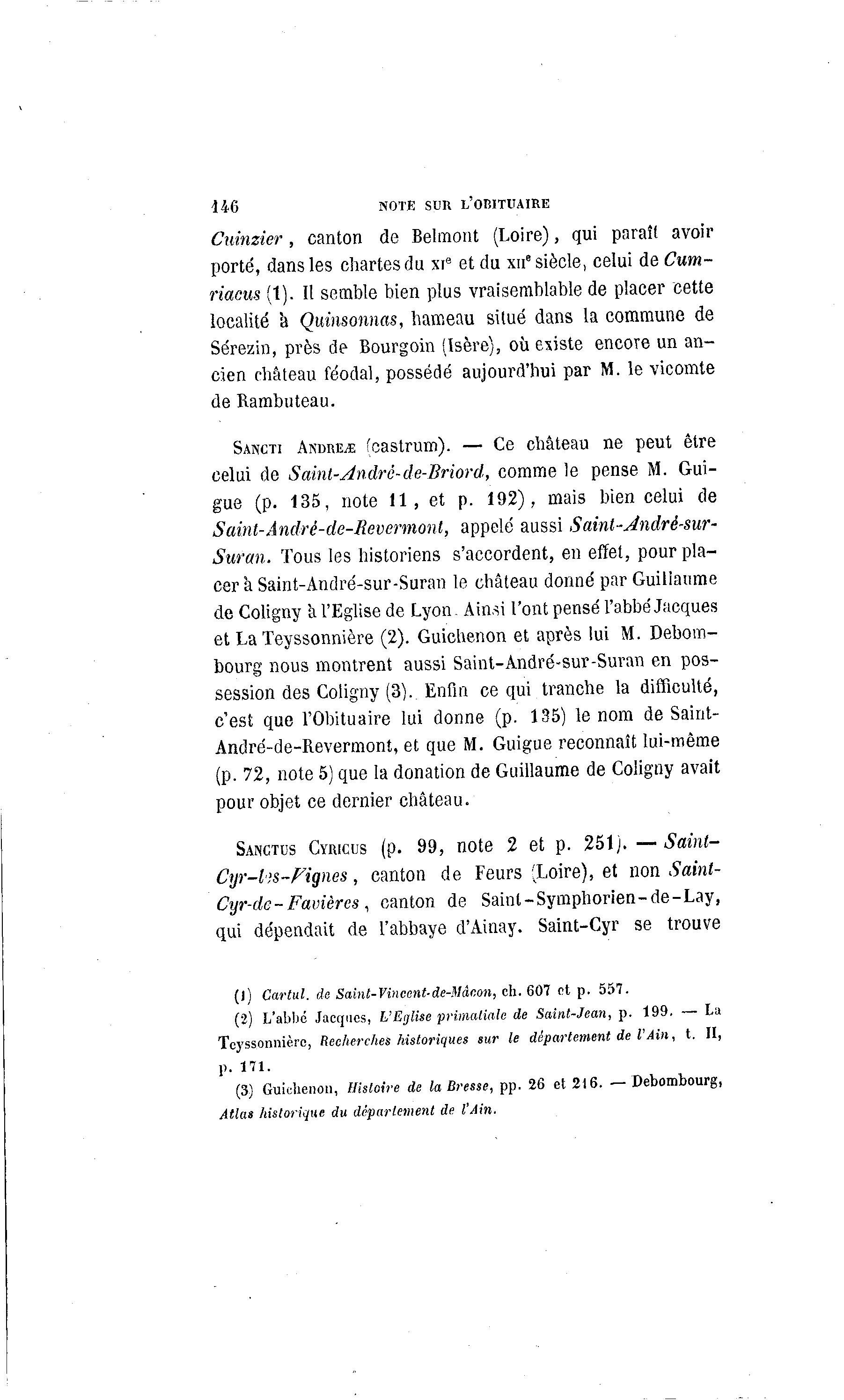 146 NOTE SUR L'OBITUAIRE Cuinzier, canton de Belmont (Loire), qui paraît avoir porté, dans les chartes du xi9 et du xue siècle, celui de Cum~ riacus (t). Il semble bien plus vraisemblable de placer cette localité a Quinsonnas, hameau situé dans la commune de Sérezin, près de Bourgoin (Isère), où existe encore un an- cien château féodal, possédé aujourd'hui par M. le vicomte de Rambuteau. SAIVCTI ANDREW feastrum). — Ce château ne peut être celui de Saint-André-de-Briord, comme le pense M. Gui- gue (p. 135, note 1 1 , et p. 192), mais bien celui de Saint-André-de-Revermont, appelé aussi Saint-Jndrê-sur- Suran. Tous les historiens s'accordent, en effet, pour pla- cer à Saint-André-sur-Suran le château donné par Guillaume de Coligny a l'Eglise de Lyon- Ainsi l'ont pensé l'abbé Jacques et La Teyssonnière (2). Guichenon et après lui M. Debom- bourg nous montrent aussi Saint-André-sur-Suran en pos- session des Coligny (3). Enfin ce qui tranche la difficulté, c'est que l'Obituaire lui donne (p. 135) le nom de Saint- André-de-Revermont, et que M. Guigue reconnaît lui-même (p. 72, note 5) que la donation de Guillaume de Coligny avait pour objet ce dernier château. SANCTUS CYRICUS (p. 99, note 2 et p. 251). — Saint- Cyr-lis-Fiqnes, canton de Feurs (Loire), et non Saint- Cyr-dc-Favières, canton de Saint-Symphorien-de-Lay, qui dépendait de l'abbaye d'Ainay. Saint-Cyr se trouve (1) Cartul. de Saint-Vinccnt-de-Mâcon, eh. 607 et p . 557. (2) L'abbé Jacques, L'Eglise primatiale de Saint-Jean, p . 199. — La Teyssonnière, Recherches historiques sur le département de l'Ain, t. II, p. 1 7 1 . (3) Guichenou, Histoire de la Bresse, pp. 26 et 216. — Debombourg, Atlas historique du déparlement de l'Ain.
