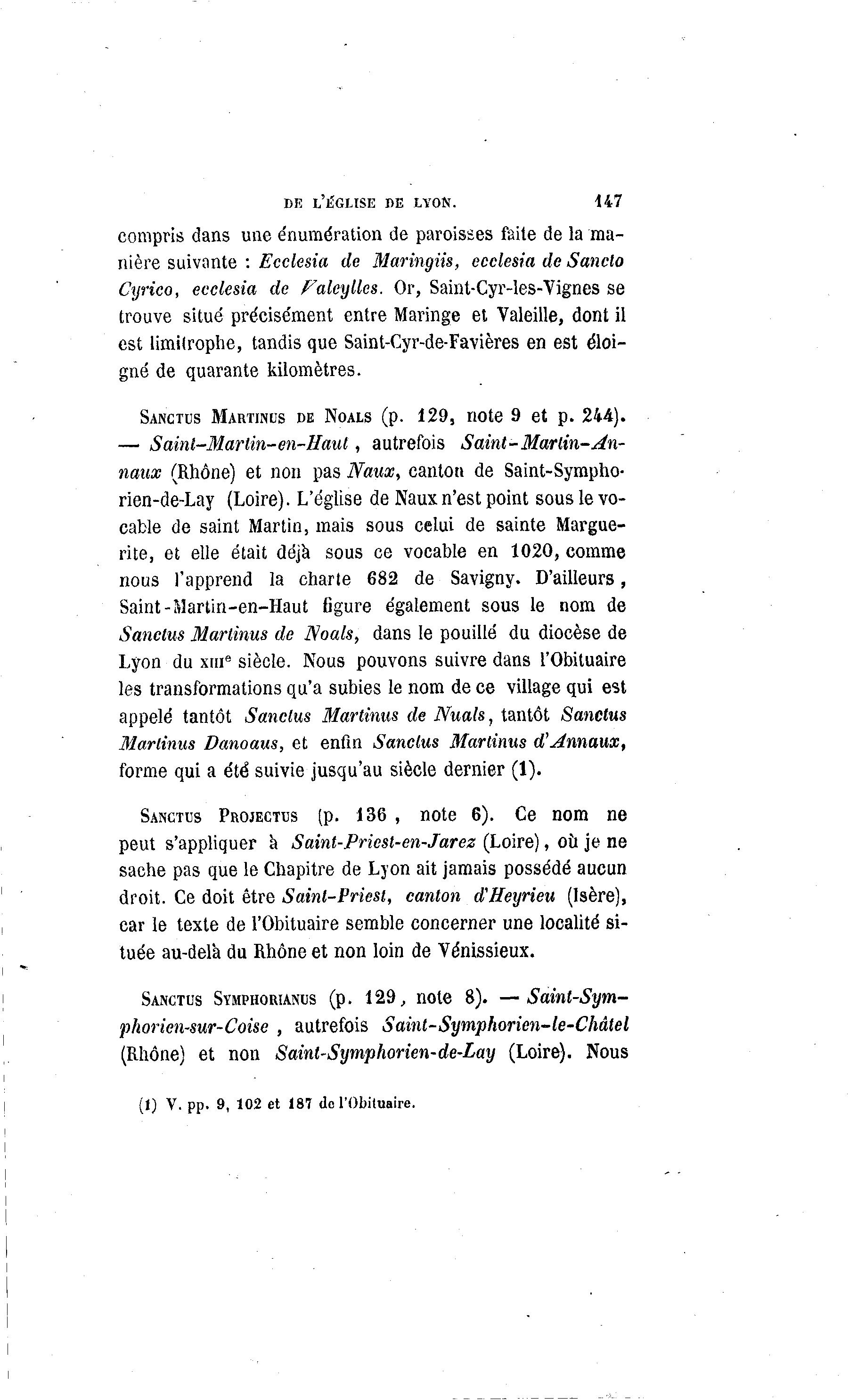 DE L'ÉGLISE DE LYON. 147 compris dans une énumération de paroisses faite de la ma- nière suivante : Ecclesia de Maringiis, ecclesia de Sanclo Cyrico, ecclesia de Faleyllcs. Or, Saint-Cyr-les-Vignes se trouve situé précise'ment entre Maringe et Valeille, dont il est limitrophe, tandis que Saint-Cyr-de-Favières en est éloi- gné de quarante kilomètres. SANCTUS MARTINUS DE NOALS (p. 129, note 9 et p. 244). — Sainl-Martin-en-Haut, autrefois Saint-Martin-An- naux (Rhône) et non pas Naux, canton de Saint-Sympho- rien-de-Lay (Loire). L'église de Naux n'est point sous le vo- cable de saint Martin, mais sous celui de sainte Margue- rite, et elle était déjà sous ce vocable en 1020, comme nous l'apprend la charte 682 de Savigny. D'ailleurs, Saint-Martin-en-Haut figure également sous le nom de Sanctus Martinus de Noals, dans le pouillé du diocèse de Lyon du xnie siècle. Nous pouvons suivre dans l'Obituaire les transformations qu'a subies le nom de ce village qui est appelé tantôt Sanctus Martinus de Nuals, tantôt Sanctus Martinus Danoaus, et enfin Sanctus Martinus d'Annaux, forme qui a été suivie jusqu'au siècle dernier (1). SANCTUS PROJECTUS (p. 136 , note 6). Ce nom ne peut s'appliquer a Saint-Priest-en-Jarez (Loire), où je ne sache pas que le Chapitre de Lyon ait jamais possédé aucun droit. Ce doit être Sainl-Priest, canton d'Heyrieu (Isère), car le texte de l'Obituaire semble concerner une localité si- tuée au-delà du Rhône et non loin de Vénissieux. SANCTUS SYMPHORIANUS (p. 129, note 8). —Saint-Sym- phorien-sur-Coise , autrefois Saint-Symphorien-le-Châtel (Rhône) et non Saint-Symphorien-de-Lay (Loire). Nous (1) V. pp. 9, 102 et 187 de l'Obituaire.