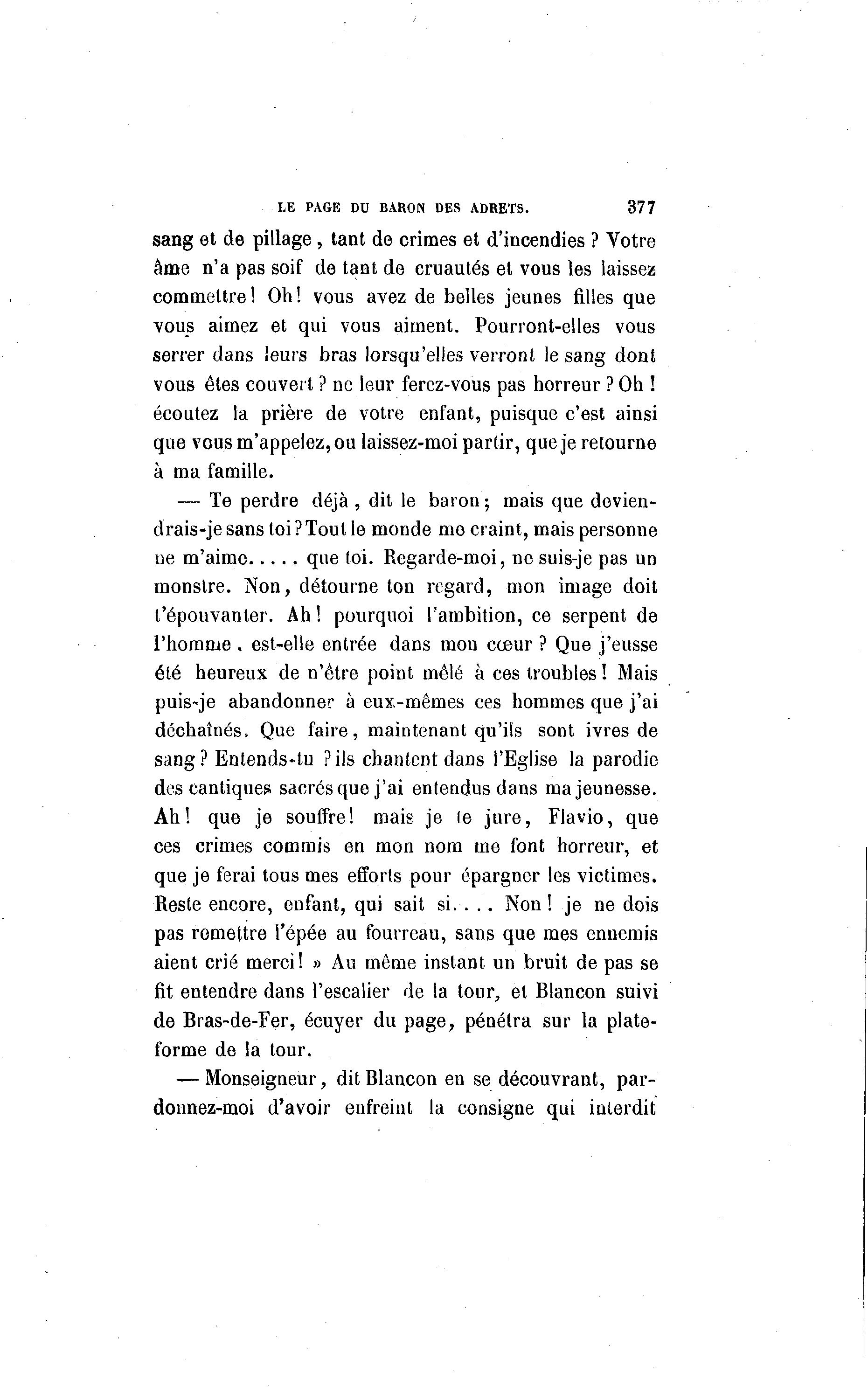 LE PAGE DU BARON DES ADRETS. 377 sang et de pillage , tant de crimes et d'incendies ? Votre âme n'a pas soif de tant de cruautés et vous les laissez commettre! Oh! vous avez de belles jeunes filles que vous aimez et qui vous aiment. Pourront-elles vous serrer dans ieurs bras lorsqu'elles verront le sang dont vous êtes couvert ? ne leur ferez-vous pas horreur ? Oh ! écoutez la prière de votre enfant, puisque c'est ainsi que vous m'appelez, ou laissez-moi partir, que je retourne à ma famille. — Te perdre déjà , dit le baron ; mais que devien- drais-je sans toi ? Tout le monde me craint, mais personne ne m'aime que loi. Regarde-moi, ne suis-je pas un monstre. Non, détourne ton regard, mon image doit l'épouvanter. Ah! pourquoi l'ambition, ce serpent de l'homme . est-elle entrée dans mon cœur ? Que j'eusse été heureux de n'être point mêlé à ces troubles ! Mais puis-je abandonner à eux-mêmes ces hommes que j'ai déchaînés. Que faire, maintenant qu'ils sont ivres de sang? Entends-tu ? ils chantent dans l'Eglise la parodie des cantiques sacrés que j'ai entendus dans ma jeunesse. Ah! que je souffre! mais je le jure, Flavio, que ces crimes commis en mon nom me font horreur, et que je ferai tous mes efforts pour épargner les victimes. Reste encore, enfant, qui sait si. . . . Non! je ne dois pas remettre l'épée au fourreau, sans que mes ennemis aient crié merci! » Au même instant un bruit de pas se fit entendre dans l'escalier de la tour, et Blancon suivi de Bras-de-Fer, écuyer du page, pénétra sur la plate- forme de la tour. — Monseigneur, dit Blancon en se découvrant, par- donnez-moi d'avoir enfreint la consigne qui interdit