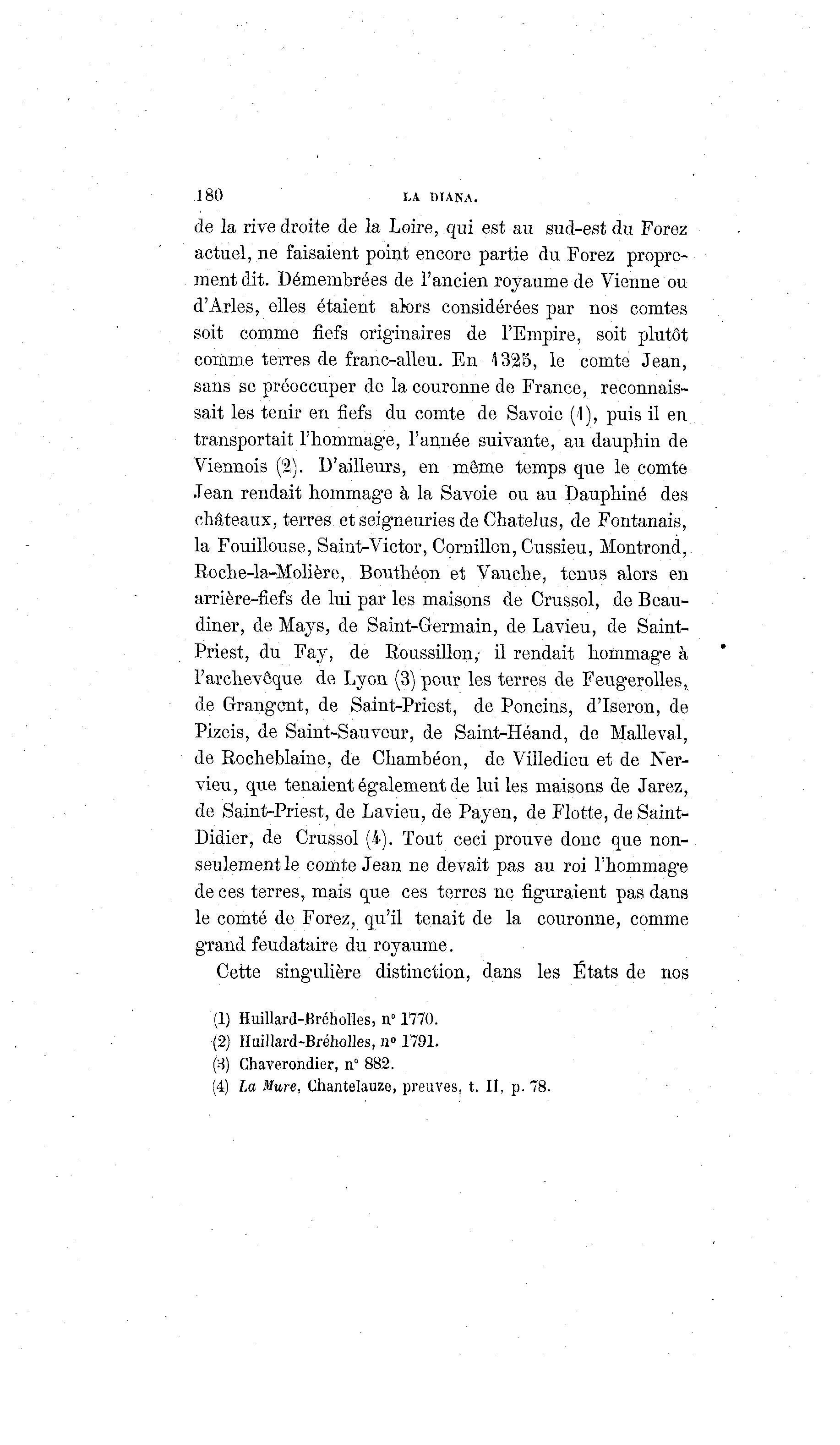180 LA DIANA. de la rive droite de la Loire, qui est au sud-est du Forez actuel, ne faisaient point encore partie du Forez propre- ment dit. Démembrées de l'ancien royaume de Vienne ou d'Arles, elles étaient alors considérées par nos comtes soit comme fiefs originaires de l'Empire, soit plutôt comme terres de franc-alleu. En 1325, le comte Jean, sans se préoccuper de la couronne de France, reconnais- sait les tenir en fiefs du comte de Savoie (