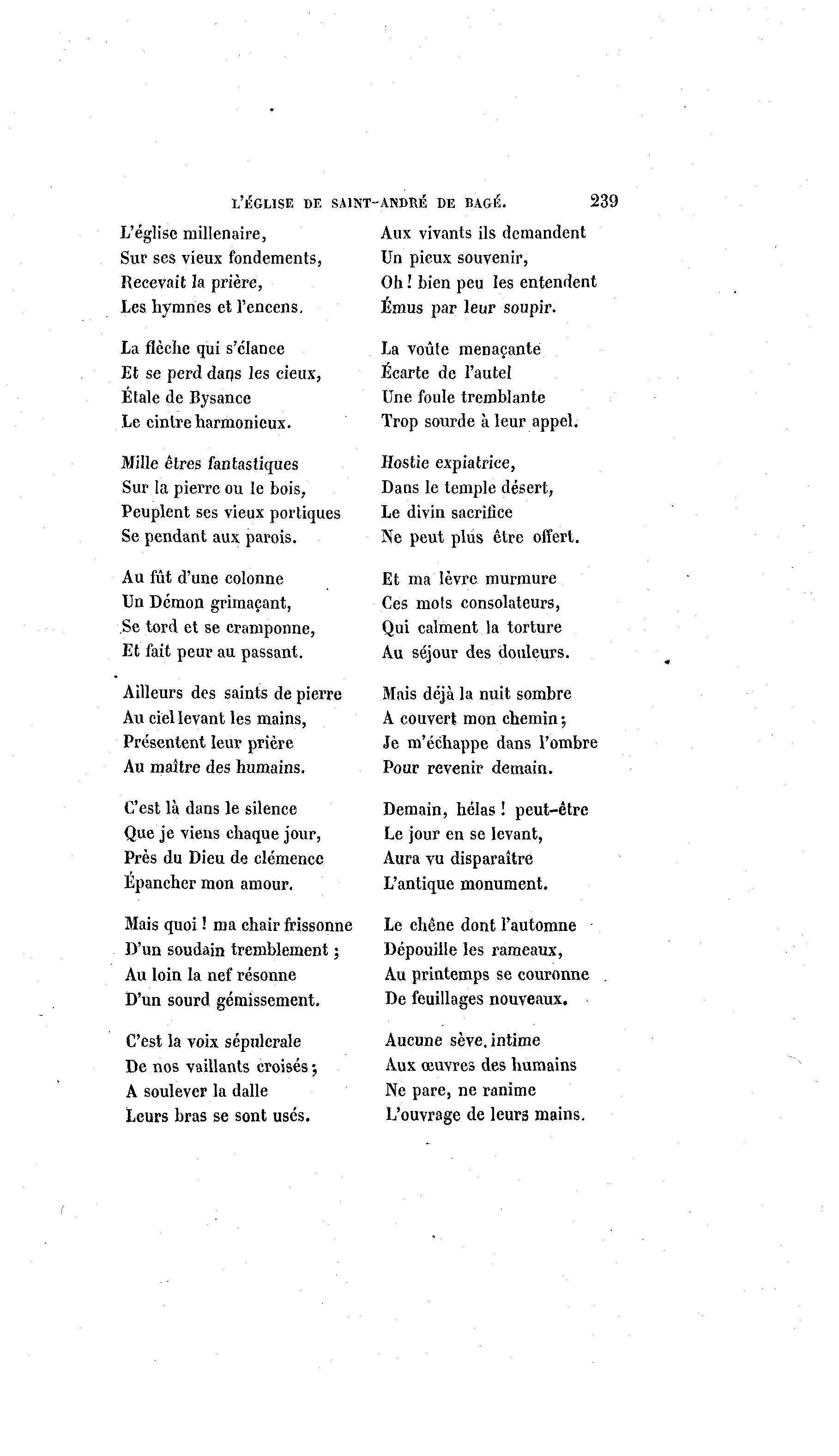 L'ÉGLISE DE SA1I -ANDRÉ DE BAGÉ\ 239 L'église millénaire, Aux vivants ils demandent Sur ses vieux fondements, Un pieux souvenir, Recevait la prière, Oh ! bien peu les entendent Les hymnes et l'encens. Émus par leur soupir. La flèche qui s'élance La voûte menaçante Et se perd dans les cieux, Écarte de l'autel Étale de Bysance Une foule tremblante Le cintre harmonieux. Trop sourde à leur appel. Mille êtres fantastiques Hostie expiatrice, Sur la pierre ou le bois, Dans le temple désert, Peuplent ses vieux portiques Le divin sacrifice Se pendant aux parois. Ne peut plus être offert. Au fût d'une colonne Et ma lèvre murmure Un Démon grimaçant, Ces mots consolateurs, Se tord et se cramponne, Qui calment la torture Et fait peur au passant. Au séjour des douleurs. Ailleurs des saints de pierre Mais déjà la nuit sombre Au ciel levant les mains, A couvert mon chemin ; Présentent leur prière Je m'échappe dans l'ombre Au maître des humains. Pour revenir demain. C'est là dans le silence Demain, hélas ! peut-être Que je viens chaque jour, Le jour en se levant, Près du Dieu de clémence Aura vu disparaître Épancher mon amour. L'antique monument. Mais quoi ! ma chair frissonne Le chêne dont l'automne D'un soudain tremblement ; Dépouille les rameaux, Au loin la nef résonne Au printemps se couronne . D'un sourd gémissement. De feuillages nouveaux. C'est la voix sépulcrale Aucune sève, intime De nos vaillants croisés ; Aux œuvres des humains A soulever la dalle Ne pare, ne ranime Leurs bras se sont usés. L'ouvrage de leurs mains.
