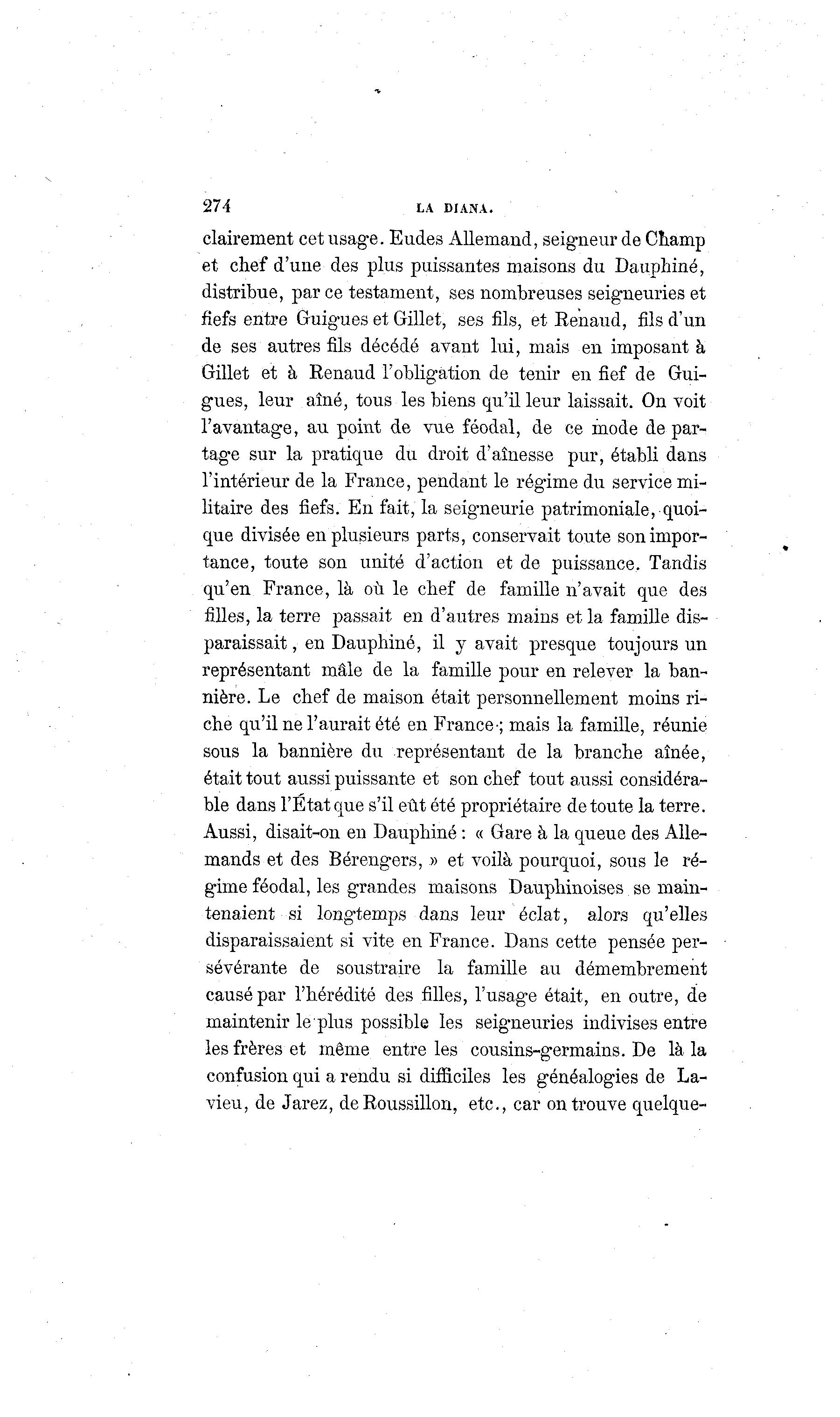274 LA DIANA. clairement cet usage. Eudes Allemand, seigneur de Champ et chef d'une des plus puissantes maisons du Dauphiné, distribue, par ce testament, ses nombreuses seigneuries et fiefs entre Guigues et Gillet, ses fils, et Eenaud, fils d'un de ses autres fils décédé avant lui, mais en imposant à Gillet et à Renaud l'obligation de tenir en fief de Gui- gues, leur aîné, tous les biens qu'il leur laissait. On voit l'avantage, au point de vue féodal, de ce mode de par- tage sur la pratique du droit d'aînesse pur, établi dans l'intérieur de la France, pendant le régime du service mi- litaire des fiefs. En fait, la seigneurie patrimoniale, quoi- que divisée en plusieurs parts, conservait toute son impor- tance, toute son unité d'action et de puissance. Tandis qu'en France, là où le chef de famille n'avait que des filles, la terre passait en d'autres mains et la famille dis- paraissait , en Dauphiné, il y avait presque toujours un représentant mâle de la famille pour en relever la ban- nière. Le chef de maison était personnellement moins ri- che qu'il ne l'aurait été en France-; mais la famille, réunie sous la bannière du représentant de la branche aînée, était tout aussi puissante et son chef tout aussi considéra- ble dans l'État que s'il eût été propriétaire de toute la terre. Aussi, disait-on en Dauphiné : « Gare à la queue des Alle- mands et des Bérengers, » et voilà pourquoi, sous le ré- gime féodal, les grandes maisons Dauphinoises se main- tenaient si longtemps dans leur éclat, alors qu'elles disparaissaient si vite en France. Dans cette pensée per- sévérante de soustraire la famille au démembrement causé par l'hérédité des filles, l'usage était, en outre, de maintenir le plus possible les seigneuries indivises entre les frères et même entre les cousins-germains. De là la confusion qui a rendu si difficiles les généalogies de La- vieu, de Jarez, de Roussillon, etc., car on trouve quelque-