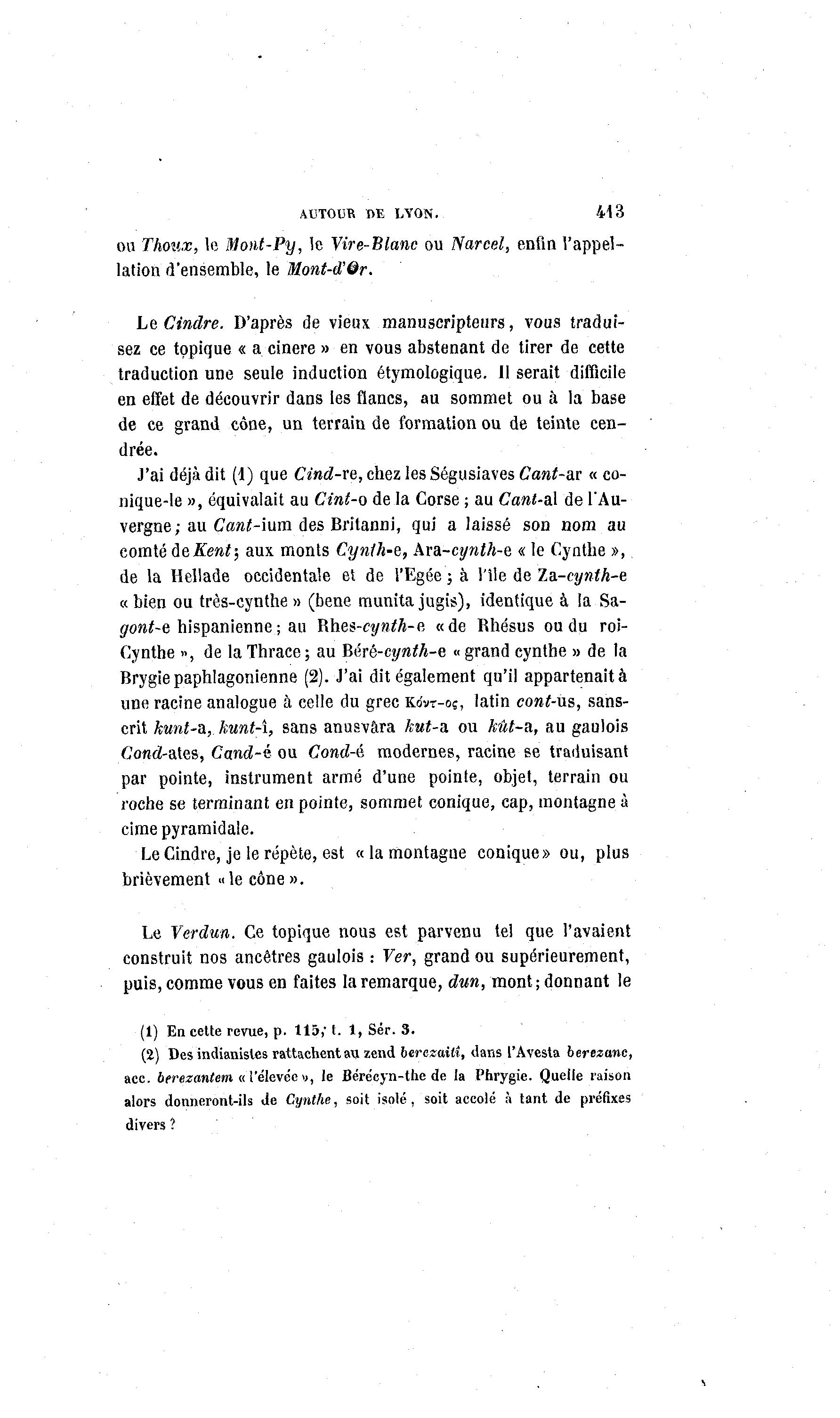 AUTOUR BE LYON. 443 ou Thoux, le Mon,t-Py, le Vire-Blanc ou Nareel, enfin l'appel- lation d'ensemble, le Uont-d'&r. Le Cindre. D'après de vieux manuscripteurs, vous tradui- sez ce topique « a cinere » en vous abstenant de tirer de cette traduction une seule induction étymologique. Il serait difficile en effet de découvrir dans les flancs, au sommet ou à la base de ce grand cône, un terrain de formation ou de teinte cen- drée. J'ai déjà dit (1) que Cind-re, chez les Ségusiaves Cant-ar « co- nique-le », équivalait au Cint-o de la Corse ; au Cant-nl de l'Au- vergne; au Cant-ium des Britanni, qui a laissé son nom au comté à eKent; aux monts Cynih-e, Ara-cywtt-e « le Cynthe », de la Hellade occidentale et de l'Egée j à l'île de 7,a-cyntk-e « bien ou très-cynthe » (bene munita jugis), identique à la Sa- gont-e hispanienne ; au Rhe$-cynth-p, «de Rhésus ou du roi- Cynthe », de la Thrace; au Bérë-cynth-e « grand cynthe » de la Brygie paphlagonienne (2). J'ai dit également qu'il appartenait à une racine analogue à celle du grec KoVr-oç, latin cont-us, sans- crit ktmt-a, kunt-î, sans anusvara kut-a ou Mt-a, au gaulois Cond-ates, Cand-é ou Cond-ê modernes, racine se traduisant par pointe, instrument armé d'une pointe, objet, terrain ou roche se terminant en pointe, sommet conique, cap, montagne à cime pyramidale. Le Cindre, je le répète, est « la montagne conique» ou, plus brièvement « le cône ». Le Verdun. Ce topique nous est parvenu tel que l'avaient construit nos ancêtres gaulois : Ver, grand ou supérieurement, puis, comme vous en faites la remarque, dun, mont ; donnant le (i) En cette revue, p. 115,' t. 1, Sér. 3 . (2) Des indianistes rattachent au zend berczaitî, dans l'Avesta berezme, ace. berezantem « l'élevée », le Bérécyn-the de la Phrygie. Quelle raison alors donneront-ils de Cynthe, soit isolé, soit accolé à tant de préfixes divers ?