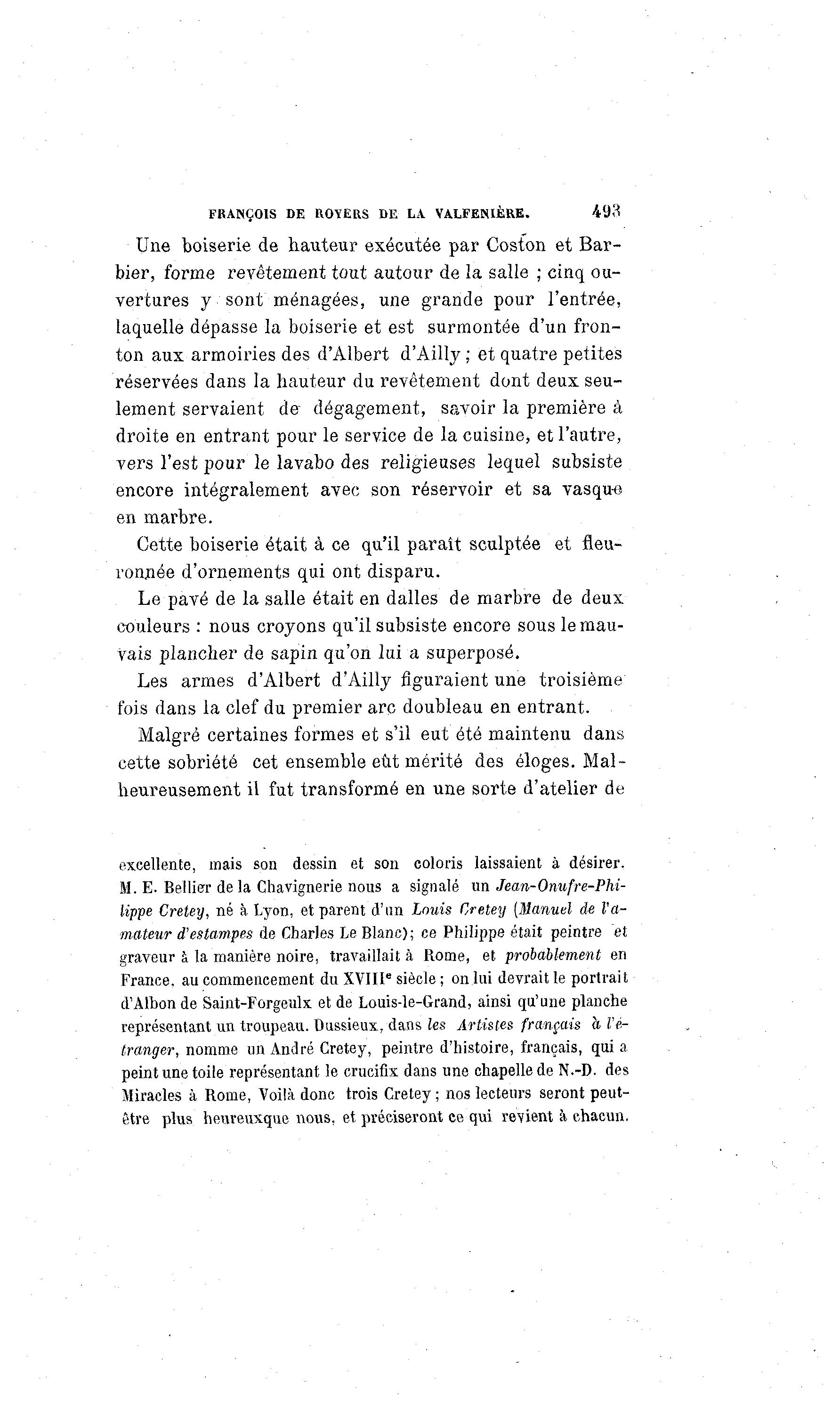 FRANÇOIS DE IWÃERS DE LA VALFEMÈRE. 493 Une boiserie de hauteur exécutée par Coston et Bar- bier, forme revêtement tout autour de la salle ; cinq ou- vertures y sont ménagées, une grande pour l'entrée, laquelle dépasse la boiserie et est surmontée d'un fron- ton aux armoiries des d'Albert d'Ailly ; et quatre petites réservées dans la hauteur du revêtement dont deux seu- lement servaient de dégagement, savoir la première à droite en entrant pour le service de la cuisine, et l'autre, vers l'est pour le lavabo des religieuses lequel subsiste encore intégralement avec son réservoir et sa vasque en marbre. Cette boiserie était à ce qu'il paraît sculptée et fleu- ronnée d'ornements qui ont disparu. Le pavé de la salle était en dalles de marbre de deux couleurs : nous croyons qu'il subsiste encore sous le mau- vais plancher de sapin qu'on lui a superposé. Les armes d'Albert d'Ailly figuraient une troisième fois dans la clef du premier arc doubleau en entrant. Malgré certaines formes et s'il eut été maintenu dans cette sobriété cet ensemble eût mérité des éloges. Mal- heureusement il fut transformé en une sorte d'atelier de excellente, mais son dessin et son coloris laissaient à désirer. M. E. Bellier de la Chavignerie nous a signalé un Jean-Onufre-Phi- lippe Cretey, né à Lyon, et parent d'un Louis Oretey (Manuel de Va- mateur d'estampes de Charles Le Blanc); ce Philippe était peintre et graveur à la manière noire, travaillait à Rome, et probablement en France, au commencement du XVIIIe siècle ; on lui devrait le portrait d'Albon de Saint-Forgeulx et de Louis-le-Grand, ainsi qu'une planche représentant un troupeau. Dussieux, dans les Artistes français h l'é- tranger, nomme un André Cretey, peintre d'histoire, français, qui a peint une toile représentant le crucifix dans une chapelle de N.-D. des Miracles à Rome, Voilà donc trois Cretey ; nos lecteurs seront peut- être plus heureuxque nous, et préciseront ce qui retient à chacun.