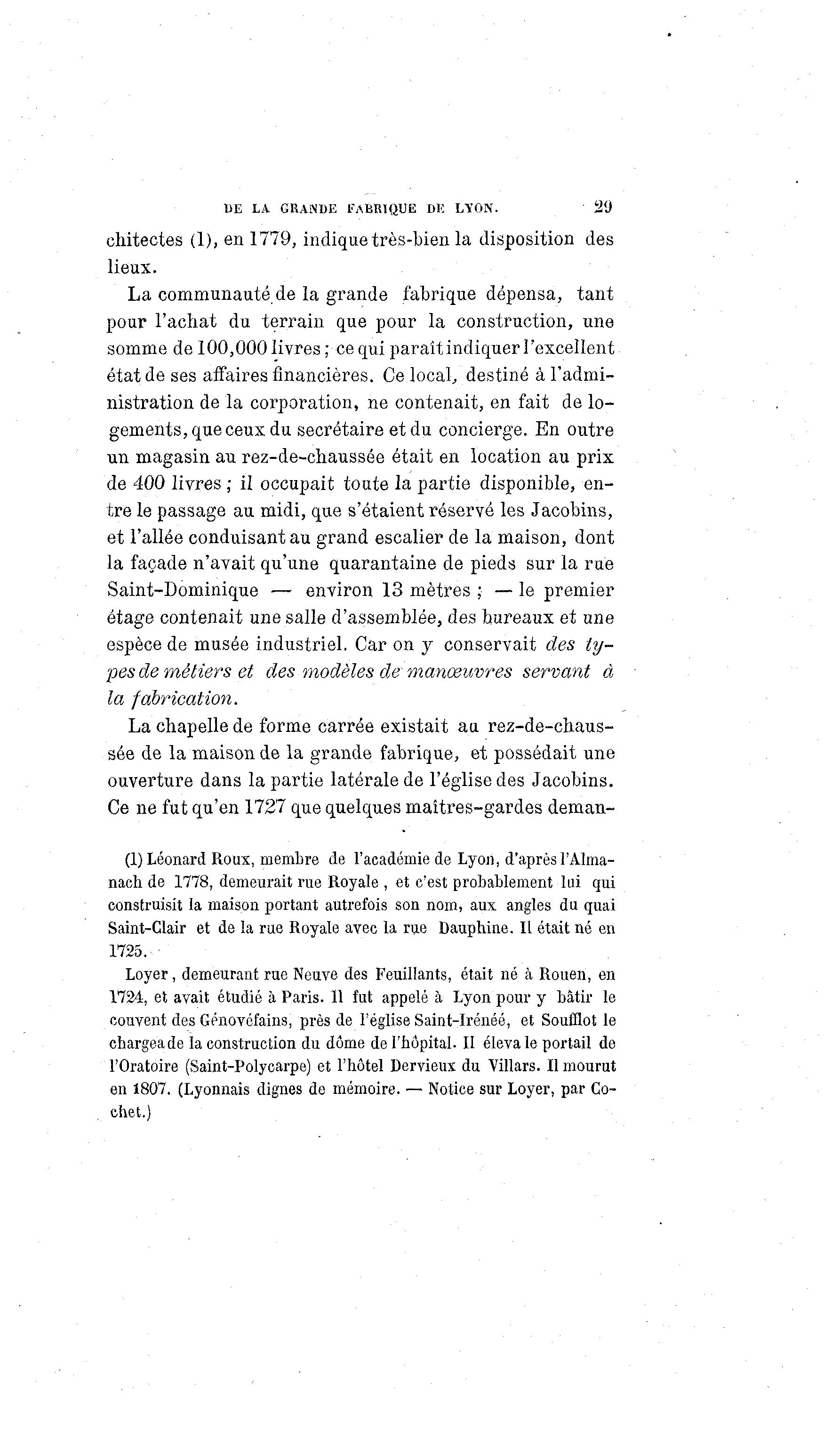 DE LA GRANDE FABRIQUE DE LYON. 29 chitectes (1), en 1779, indique très-bien la disposition des lieux. La communauté de la grande fabrique dépensa, tant pour l'achat du terrain que pour la construction, une somme de 100,000 livres ; ce qui paraît indiquer l'excellent état de ses affaires financières. Ce local, destiné à l'admi- nistration de la corporation, ne contenait, en fait de lo- gements, que ceux du secrétaire et du concierge. En outre un magasin au rez-de-chaussée était en location au prix de 400 livres ; il occupait toute la partie disponible, en- tre le passage au midi, que s'étaient réservé les Jacobins, et l'allée conduisant au grand escalier de la maison, dont la façade n'avait qu'une quarantaine de pieds sur la rue Saint-Dominique — environ 13 mètres ; — le premier étage contenait une salle d'assemblée, des bureaux et une espèce de musée industriel. Car on y conservait des ty- pes de métiers et des modèles de' manœuvres servant à la fabrication, La chapelle de forme carrée existait au rez-de-chaus- sée de la maison de la grande fabrique, et possédait une ouverture dans la partie latérale de l'église des Jacobins. Ce ne fut qu'en 1727 que quelques maîtres-gardes deman- (1) Léonard Roux, membre de l'académie de Lyon, d'après l'Alma- naeh de 1778, demeurait rue Royale , et c'est probablement lui qui construisit la maison portant autrefois son nom, aux angles du quai Saint-Clair et de la rue Royale avec la rue Dauphine. Il était né en 1725. Loyer, demeurant rue Neuve des Feuillants, était né à Rouen, en 1724, et avait étudié à Paris. 11 fut appelé à Lyon pour y bâtir le couvent des Génovéfains, près de l'église Saint-Irénéé, et Soufflot le chargeade la construction du dôme de l'hôpital. II éleva le portail de l'Oratoire (Saint-Polycarpe) et l'hôtel Dervieux du Villars. Il mourut en 1807. (Lyonnais dignes de mémoire. — Notice sur Loyer, par Co- chet.)