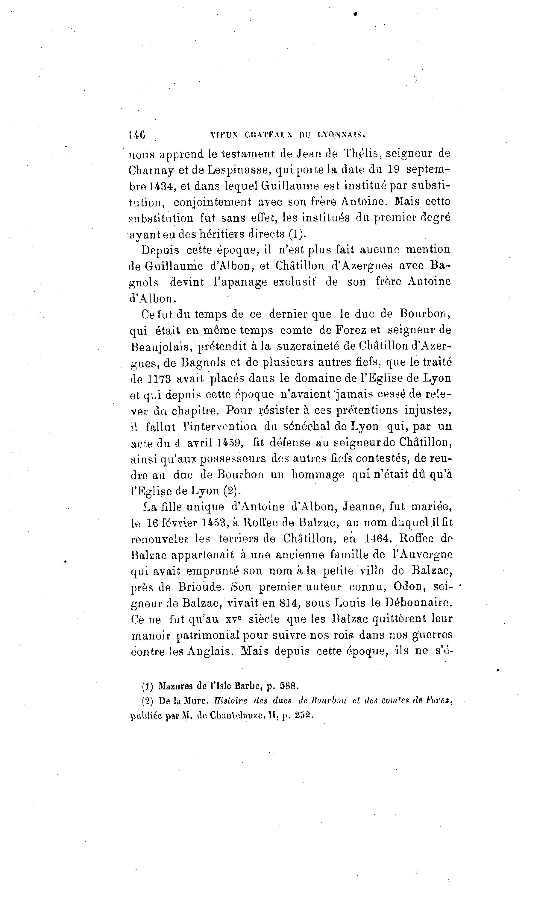 146 VIEUX'CHATEAUX DU LYONNAIS. nous apprend le testament de Jean de Thélis, seigneur de Charnay et de Lespinasse, qui porte la date du 19 septem- bre 1434, et dans lequel Guillaume est institué par substi- tution, conjointement avec son frère Antoine. Mais cette substitution fut sans effet, les institués du premier degré ayant eu des héritiers directs (1). Depuis cette époque, il n'est plus fait aucune mention de Guillaume d'Albon, et Châtillon d'Azergues avec Ba- gnols devint l'apanage exclusif de son frère Antoine d'Albon. Ce fut du temps de ce dernier que le duc de Bourbon, qui était en même temps comte de Forez et seigneur de Beaujolais, prétendit à la suzeraineté de Châtillon d'Azer- gues, de Bagnols et de plusieurs autres fiefs, que le traité de 1173 avait placés dans le domaine de l'Eglise de Lyon et qui depuis cette époque n'avaient jamais cessé de rele- ver du chapitre. Pour résister à ces prétentions injustes, il fallut l'intervention du sénéchal de Lyon qui, par un acte du 4 avril 1459, fit défense au seigneur de Châtillon, ainsi qu'aux possesseurs des autres fiefs contestés, de ren- dre au duc de Bourbon un hommage qui n'était dû qu'à l'Eglise de Lyon (2). La fille unique d'Antoine d'Albon, Jeanne, fut mariée, le 16 février 1453, à Roffec de Balzac, au nom duquel il fit renouveler les terriers de Châtillon, en 1464. Roffec de Balzac appartenait à une ancienne famille de l'Auvergne qui avait emprunté son nom à la petite ville de Balzac, près de Brioude. Son premier auteur connu, Odon, sei- gneur de Balzac, vivait en 814, sous Louis le Débonnaire. Ce ne fut qu'au xve siècle que les Balzac quittèrent leur manoir patrimonial pour suivre nos rois dans nos guerres contre les Anglais. Mais depuis cette époque, ils ne s'é- (1) Mazures de l'Islc Barbe, p. 588. (2) De la Mure. Histoire des ducs de Bourbon et des comtes de Forez, publiée par M. iln ChanUîlauze, H, p. 252.