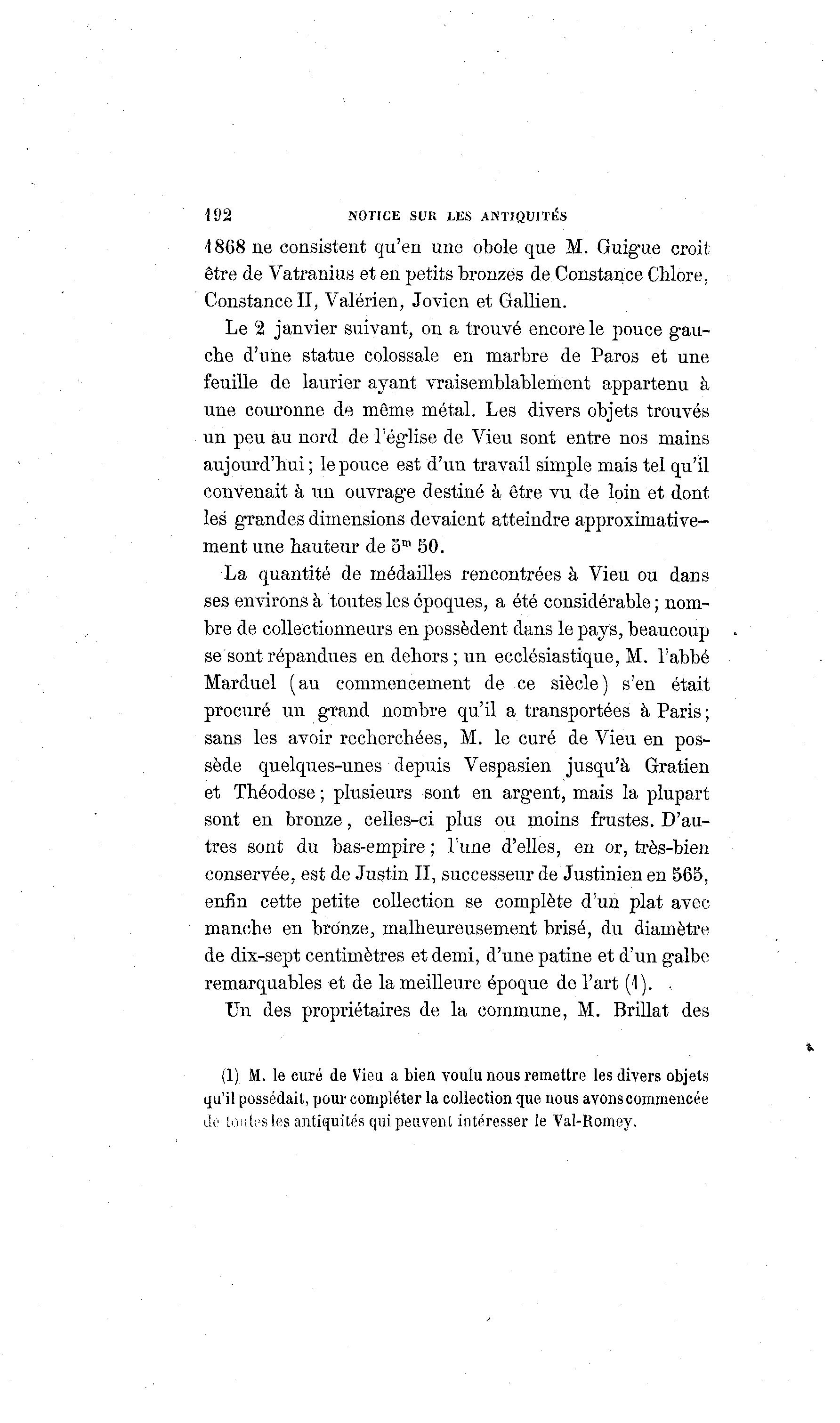 192 NOTICE SUR LES ANTIQUITÉS 1868 ne consistent qu'en une obole que M. Guigue croit être de Vatranius et en petits bronzes de Constance Chlore, Constance II, Valérien, Jovien et Gallien. Le 2 janvier suivant, on a trouvé encore le pouce gau- che d'une statue colossale en marbre de Paros et une feuille de laurier ayant vraisemblablement appartenu à une couronne de même métal. Les divers objets trouvés un peu au nord de l'église de Vieu sont entre nos mains aujourd'hui ; le pouce est d'un travail simple mais tel qu'il convenait à un ouvrage destiné à être vu de loin et dont les grandes dimensions devaient atteindre approximative- ment une hauteur de 5m 50. La quantité de médailles rencontrées à Vieu ou dans ses environs à toutes les époques, a été considérable ; nom- bre de collectionneurs en possèdent dans le pays, beaucoup se sont répandues en dehors ; un ecclésiastique, M. l'abbé Marduel (au commencement de ce siècle) s'en était procuré un grand nombre qu'il a transportées à Paris ; sans les avoir recherchées, M. le curé de Vieu en pos- sède quelques-unes depuis Vespasien jusqu'à Gratien et Théodose ; plusieurs sont en argent, mais la plupart sont en bronze, celles-ci plus ou moins frustes. D'au- tres sont du bas-empire ; l'une d'elles, en or, très-bien conservée, est de Justin II, successeur de Justinien en 565, enfin cette petite collection se complète d'un plat avec manche en bronze, malheureusement brisé, du diamètre de dix-sept centimètres et demi, d'une patine et d'un galbe remarquables et de la meilleure époque de l'art (1). , TJn des propriétaires de la commune, M. Brillât des (1) M. le curé de Vieu a bien voulu nous remettre les divers objets qu'il possédait, pour compléter la collection que nous avons commencée do toutes les antiquités qui peuvent intéresser le Val-Romey.
