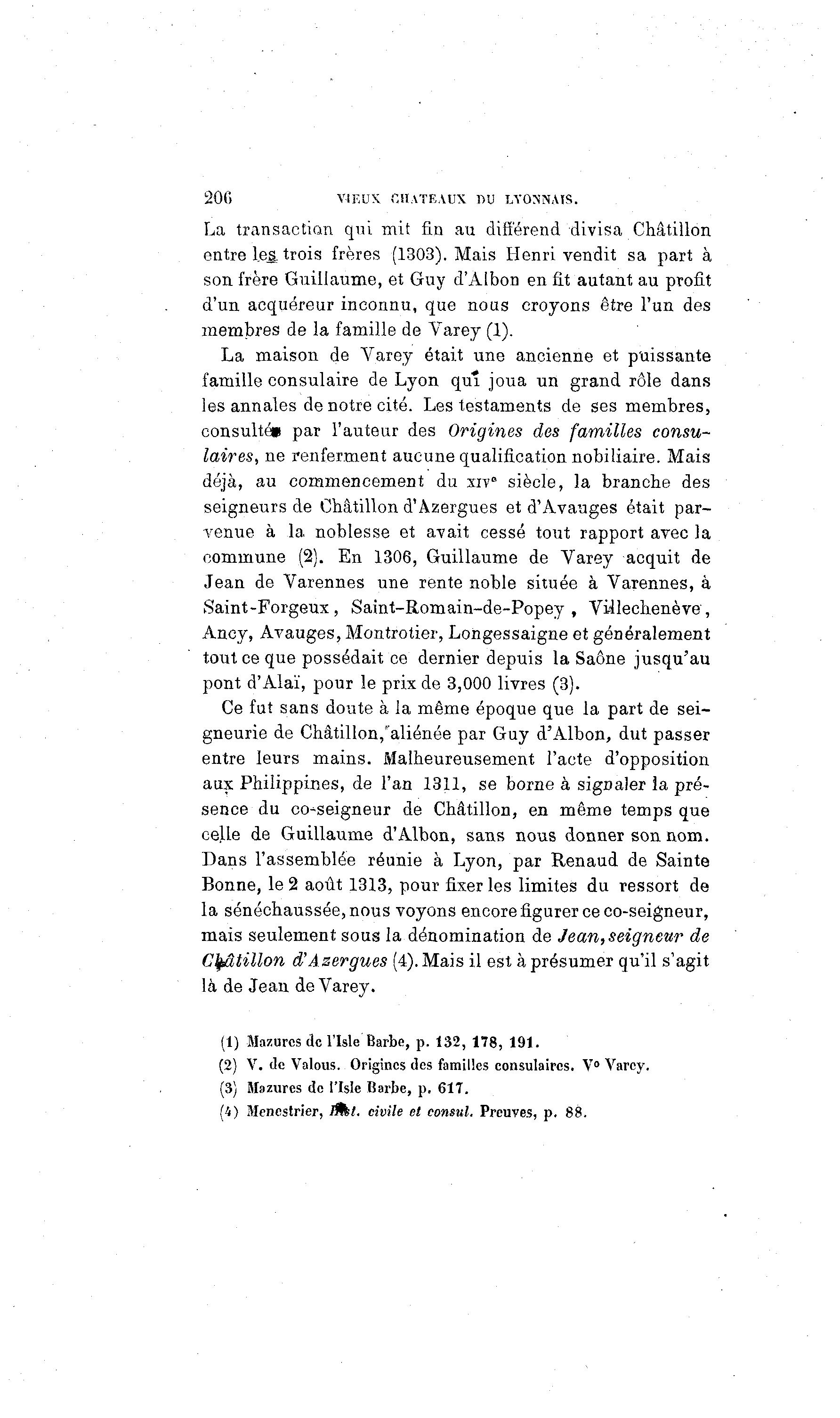 20G VIEUX CHATEAUX BU LYONNAIS. La transaction qui mit fin au différend divisa Châtillon entre l„e.â trois frères (1303). Mais Henri vendit sa part à son frère Guillaume, et Guy d'Albon en fit autant au profit d'un acquéreur inconnu, que nous croyons être l'un des membres de la famille de Varey (1). La maison de Varey était une ancienne et puissante famille consulaire de Lyon qui joua un grand rôle dans les annales de notre cité. Les testaments de ses membres, consulté» par l'auteur des Origines des familles consu- laires, ne renferment aucune qualification nobiliaire. Mais déjà , au commencement du xn>° siècle, la branche des seigneurs de Châtillon d'Azergues et d'Avauges était par- venue à la noblesse et avait cessé tout rapport avec la commune (2). En 1306, Guillaume de Varey acquit de Jean de Varennes une rente noble située à Varennes, à Saint-Forgeux, Saint-Romain-de-Popey , Viilechenève , Ancy, Avauges, Montrotier, Longessaigne et généralement tout ce que possédait ce dernier depuis la Saône jusqu'au pont d'Alaï, pour le prix de 3,000 livres (3). Ce fut sans doute à la même époque que la part de sei- gneurie de Châtillon,"aliénée par Guy d'Albon, dut passer entre leurs mains. Malheureusement l'acte d'opposition aux Philippines, de l'an 1311, se borne à sigDaler la pré- sence du co-^seigneur de Châtillon, en même temps que celle de Guillaume d'Albon, sans nous donner son nom. Dans l'assemblée réunie à Lyon, par Renaud de Sainte Bonne, le 2 août 1313, pour fixer les limites du ressort de la sénéchaussée, nous voyons encore figurer ce co-seigneur, mais seulement sous la dénomination de Jean, seigneur de Châtillon d'Azergues (4). Mais il est à présumer qu'il s'agit là de Jean de Varey. (1) Mazurcs de l'Isle Barbe, p. 132, 178, 191. (2) V. de Valous. Origines des familles consulaires. V° Varey. (3) Mazures de PIsIe Barbe, p. 61T. (4) Mencstrier, ifal. civile et consul. Preuves, p. 88.