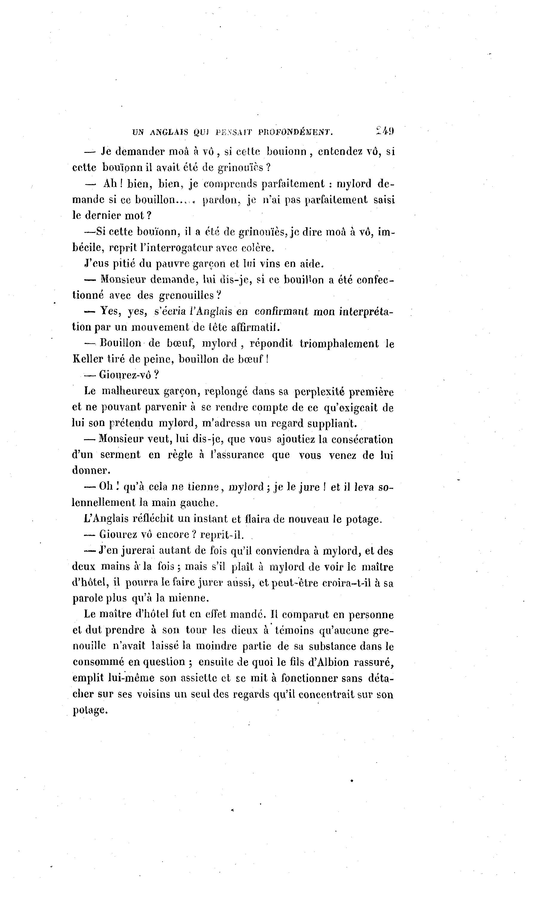 UN ANGLAIS QUI PENSAIT PROFONDÉMENT. ïii) — Je demander moâ à vô, si cette bouionn , entendez vô, si cette bouïpnn il avait été de grinouïès ? — Ah ! bien, bien, je comprends parfaitement : mylord de- mande si ce bouillon... • pardon, je n'ai pas parfaitement saisi le dernier mot ? —Si cette bouïonn, il a été de grinouïès, je dire moâ à vô, im- bécile, reprit l'interrogateur avec colère. J'eus pitié du pauvre garçon et lui vins en aide. — Monsieur demande, lui dis-je, si ce bouillon a été confec- tionné avec des grenouilles? — Yes, yes, s'écria l'Anglais en confirmant mon interpréta- tion par un mouvement de tête affirmatil. —• Bouillon-de bœuf, mylord, répondit triomphalement le Relier tiré de peine, bouillon de bœuf ! — Giourez-vô ? Le malheureux garçon, replongé dans sa perplexité première et ne pouvant parvenir à se rendre compte de ce qu'exigeait de lui son prétendu mylord, m'adressa un regard suppliant. — Monsieur veut, lui dis-je, que vous ajoutiez la consécration d'un serment en règle à l'assurance que vous venez de lui donner. — Oh ' qu'à cela ne tienne, mylord ; je le jure ! et il leva so- lennellement la main gauche. L'Anglais réfléchit un instant et flaira de nouveau le potage. — Giourez vô encore ? reprit-il. — J'en jurerai autant de fois qu'il conviendra à mylord, et des deux mains à la fois ; mais s'il plaît à mylord de voir le maître d'hôtel, il pourra le faire jurer aussi, et peut-être croira-t-il à sa parole plus qu'à la mienne. Le maître d'hôtel fut en effet mandé. Il comparut en personne et dut prendre à son tour les dieux à témoins qu'aucune gre- nouille n'avait laissé la moindre partie de sa substance dans le consommé en question ; ensuite de quoi le fils d'Albion rassuré, emplit lui-même son assiette et se mit à fonctionner sans déta- cher sur ses voisins un seul des regards qu'il concentrait sur son potage.