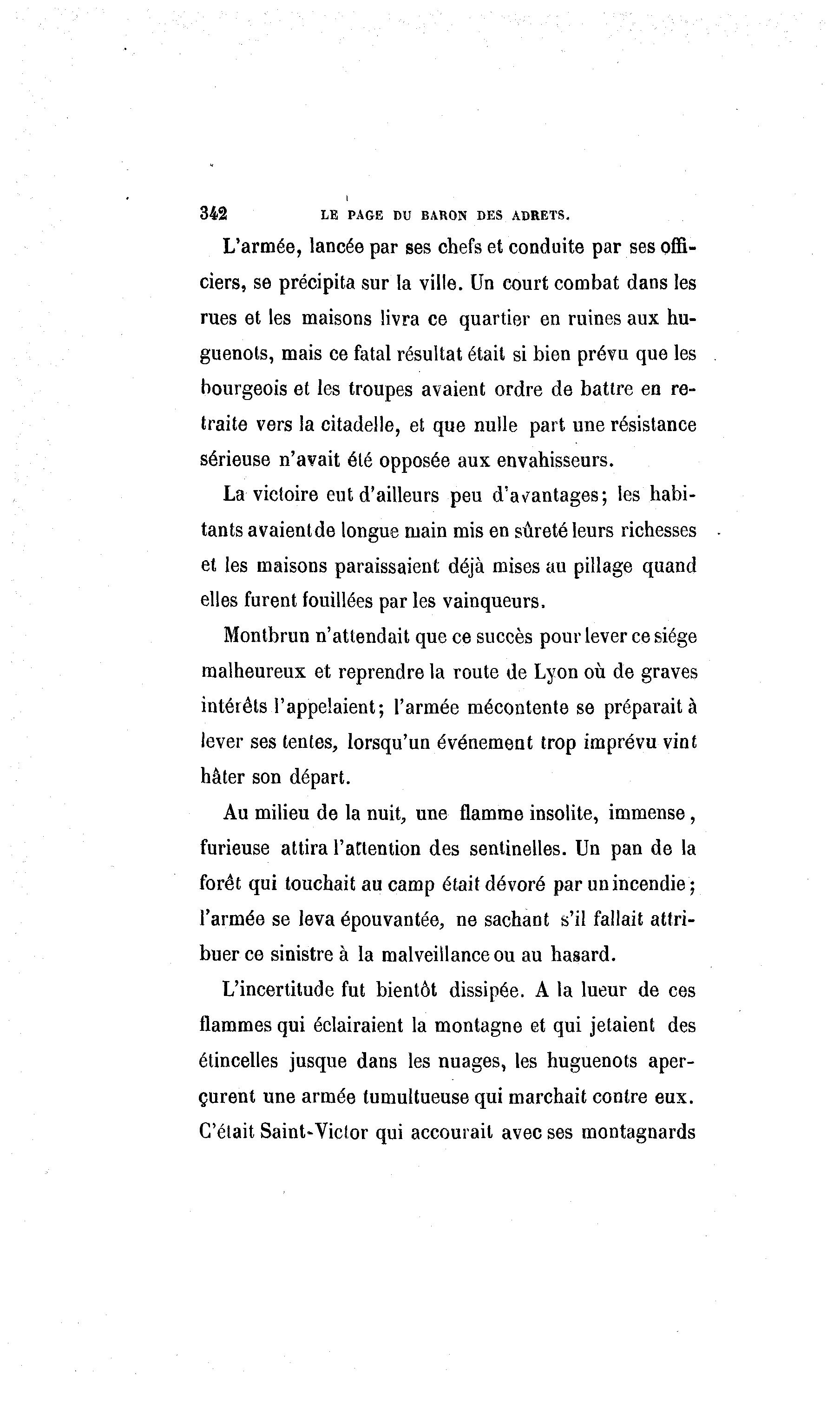 342 LE PAGE DU BARON DES ADRETS. L'armée, lancée par ses chefs et conduite par ses offi- ciers, se précipita sur la ville. Un court combat dans les rues et les maisons livra ce quartier en ruines aux hu- guenots, mais ce fatal résultat était si bien prévu que les bourgeois et les troupes avaient ordre de battre en re- traite vers la citadelle, et que nulle part une résistance sérieuse n'avait été opposée aux envahisseurs. La victoire eut d'ailleurs peu d'avantages; les habi- tants avaient de longue main mis en sûreté leurs richesses et les maisons paraissaient déjà mises au pillage quand elles furent fouillées par les vainqueurs. Montbrun n'attendait que ce succès pour lever ce siège malheureux et reprendre la route de Lyon où de graves intérêts l'appelaient; l'armée mécontente se préparait à lever ses tentes, lorsqu'un événement trop imprévu vint hâter son départ. Au milieu de la nuit, une flamme insolite, immense, furieuse attira l'attention des sentinelles. Un pan de la forêt qui touchait au camp était dévoré par un incendie ; l'armée se leva épouvantée, ne sachant s'il fallait attri- buer ce sinistre à la malveillance ou au hasard. L'incertitude fut bientôt dissipée. A la lueur de ces flammes qui éclairaient la montagne et qui jetaient des étincelles jusque dans les nuages, les huguenots aper- çurent une armée tumultueuse qui marchait contre eux. C'était Saint-Victor qui accourait avec ses montagnards