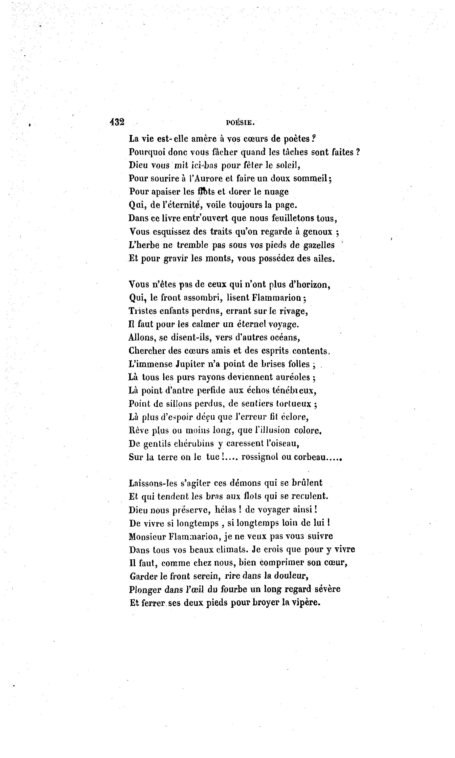 POESIE. l a vie est- elle amère à vos cœurs de poètes ? Pourquoi donc vous fâcher quand les tâches sont faites ? Dieu vous mit ici-ibas pour fêter le soleil, Pour sourire à l'Aurore et faire un doux sommeil ; Pour apaiser les flbts et dorer le nuage Qui, de l'éternité, voile toujours la page. Dans ce livre entr'ouvert que nous feuilletons tous, Vous esquissez des traits qu'on regarde à genoux ; L'herbe ne tremble pas sous vos pieds de gazelles Et pour gravir les monts, vous possédez des ailes. Vous n'êtes pas de ceux qui n'ont plus d'horizon, Qui, le front assombri, lisent Flammarion ; Tristes enfants perdus, errant sur le rivage, Il faut pour les calmer un éternel voyage. Allons, se disent-ils, vers d'autres océans, Chercher des cœurs amis et des esprits contents. L'immense Jupiter n'a point de brises folles ; Là tous les purs rayons deviennent auréoles ; Là point d'antre perfide aux échos ténébieux, Point de sillons perdus, de sentiers tortueux ; Là plus d'e