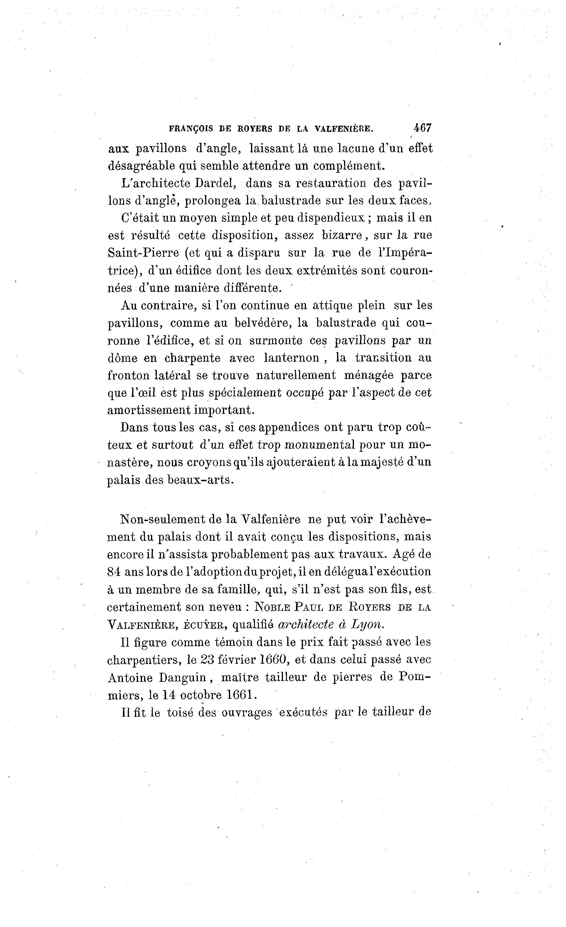 FRANÇOIS DE KOYERS DE 1A VALFENIÈRE. 467 aux pavillons d'angle, laissant là une lacune d'un effet désagréable qui semble attendre un complément. L'architecte Dardel, dans sa restauration des pavil- lons d'angle, prolongea la.balustrade sur les deux faces, C'était un moyen simple et peu dispendieux ; mais il en est résulté cette disposition, assez bizarre, sur la rue Saint-Pierre (et qui a disparu sur la rue de l'Impéra- trice), d'un édifice dont les deux extrémités sont couron- nées d'une manière différente. ' Au contraire, si l'on continue en attique plein sur les pavillons, comme au belvédère, la balustrade qui cou- ronne l'édifice, et si on surmonte ces pavillons par un dôme en charpente avec lanternon , la transition au fronton latéral se trouve naturellement ménagée parce que l'œil est plus spécialement occupé par l'aspect de cet amortissement important. Dans tous les cas, si ces appendices ont paru trop coû- teux et surtout d'un effet trop monumental pour un mo- nastère, nous croyons qu'ils ajouteraient à la majesté d'un palais des beaux-arts. Non-seulement de la Valfenière ne put voir l'achève- ment du palais dont il avait conçu les dispositions, mais encore il n'assista probablement pas aux travaux. Agé de 84 ans lors de l'adoption du projet, il en délégua l'exécution à un membre de sa famille, qui, s'il n'est pas son fils, est certainement son neveu : NOBLE PAUL DE ROYERS DE LA VALFENIÈRE, ÉCUYER, qualifié architecte à Lyon. Il figure comme témoin dans le prix fait passé avec les charpentiers, le 23 février 1660, et dans celui passé avec Antoine Danguin, maître tailleur de pierres de Pom- miers, le 14 octobre 1661. Il fit le toisé des ouvrages exécutés par le tailleur de