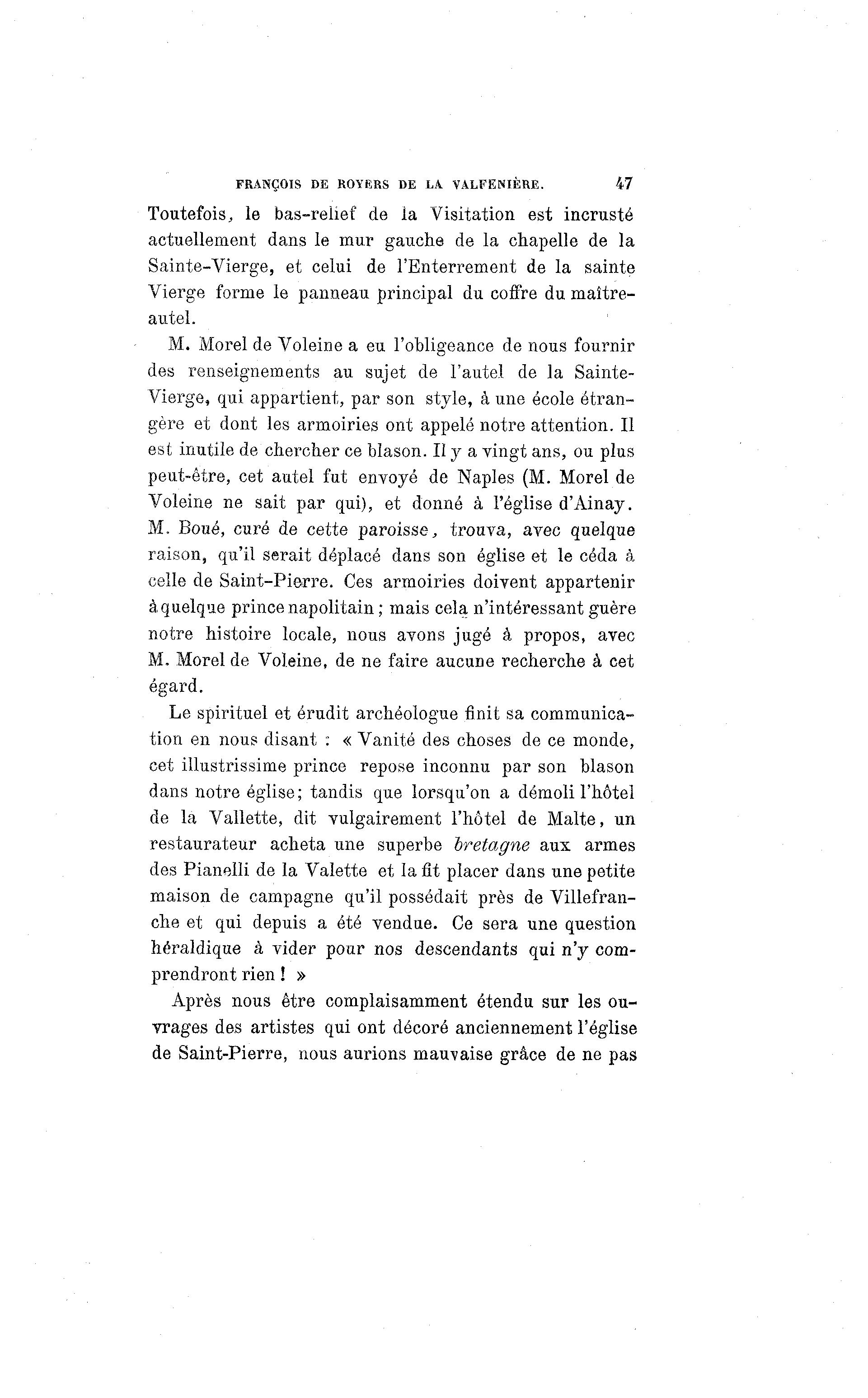 FRANÇOIS DE ROYËRS DE LA. VALFENIËRE. 47 Toutefois, le bas-relief de la Visitation est incrusté actuellement dans le mur gauche de la chapelle de la Sainte-Vierge, et celui de l'Enterrement de la sainte Vierge forme le panneau principal du coffre du maître- autel. M. Morel de Voleine a eu l'obligeance de nous fournir des renseignements au sujet de l'autel de la Sainte- Vierge» qui appartient, par son style, à une école étran- gère et dont les armoiries ont appelé notre attention. Il est inutile de chercher ce blason. Il y a vingt ans, ou plus peut-être, cet autel fut envoyé de Naples (M. Morel de Voleine ne sait par qui), et donné à l'église d'Ainay. M. Boue, curé de cette paroisse, trouva, avec quelque raison, qu'il serait déplacé dans son église et le céda à celle de Saint-Pierre. Ces armoiries doivent appartenir à quelque prince napolitain ; mais cela n'intéressant guère notre histoire locale, nous avons jugé à propos, avec M. Morel de Voleine, de ne faire aucune recherche à cet égard. Le spirituel et érudit archéologue finit sa communica- tion en nous disant : « Vanité des choses de ce monde, cet illustrissime prince repose inconnu par son blason dans notre église; tandis que lorsqu'on a démoli l'hôtel de la Vallette, dit vulgairement l'hôtel de Malte, un restaurateur acheta une superbe bretagne aux armes des Pianelli de la Valette et la fît placer dans une petite maison de campagne qu'il possédait près de Villefran- che et qui depuis a été vendue. Ce sera une question héraldique à vider pour nos descendants qui n'y com- prendront rien ! » Après nous être complaisamment étendu sur les ou- vrages des artistes qui ont décoré anciennement l'église de Saint-Pierre, nous aurions mauvaise grâce de ne pas