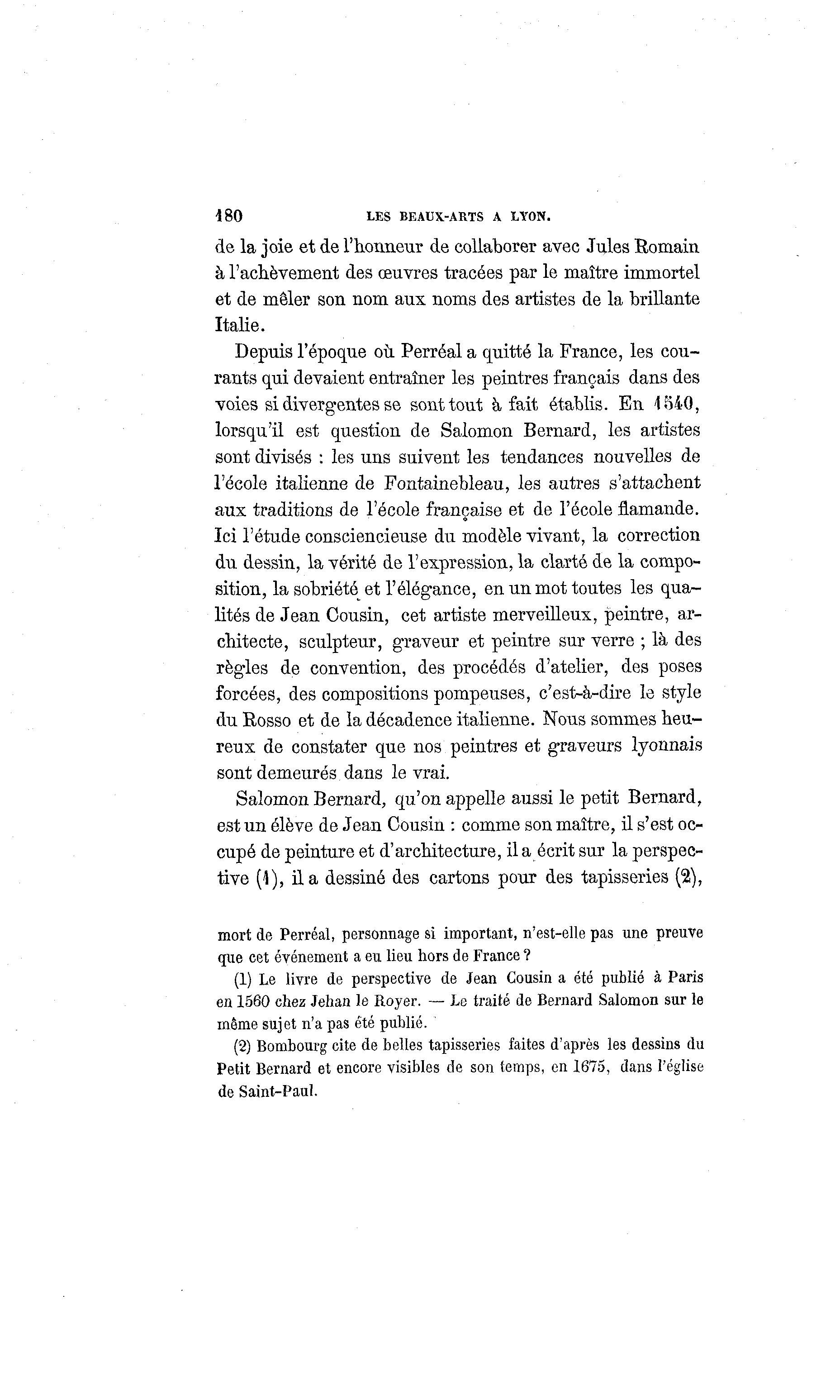 180 LES BEAUX-ARTS A LYON. de la joie et de l'honneur de collaborer avec Jules Romain à l'achèvement des œuvres tracées par le maître immortel et de mêler son nom aux noms des artistes de la brillante Italie. Depuis l'époque où Perréal a quitté la France, les cou- rants qui devaient entraîner les peintres français dans des voies si divergentes se sont tout à fait établis. En 1540, lorsqu'il est question de Salomon Bernard, les artistes sont divisés : les uns suivent les tendances nouvelles de l'école italienne de Fontainebleau, les autres s'attachent aux traditions de l'école française et de l'école flamande. Ici l'étude consciencieuse du modèle vivant, la correction du dessin, la vérité de l'expression, la clarté de la compo- sition, la sobriété^ et l'élégance, en un mot toutes les qua- lités de Jean Cousin, cet artiste merveilleux, peintre, ar- chitecte, sculpteur, graveur et peintre sur verre ; là des règles de convention, des procédés d'atelier, des poses forcées, des compositions pompeuses, c'est-à -dire le style du Rosso et de la décadence italienne. Nous sommes heu- reux de constater que nos peintres et graveurs lyonnais sont demeurés dans le vrai. Salomon Bernard, qu'on appelle aussi le petit Bernard, est un élève de Jean Cousin : comme son maître, il s'est oc- cupé de peinture et d'architecture, il a écrit sur la perspec- tive (1), il a dessiné des cartons pour des tapisseries (2), mort de Perréal, personnage si important, n'est-elle pas une preuve que cet événement a eu lieu hors de France ? (1) Le livre de perspective de Jean Cousin a été publié à Paris en 1560 chez Jehan le Royer. — Le traité de Bernard Salomon sur le même sujet n'a pas été publié. (2) Bombourg cite de belles tapisseries faites d'après les dessins du Petit Bernard et encore visibles de son temps, en 1675, dans l'église de Saint-Paul.