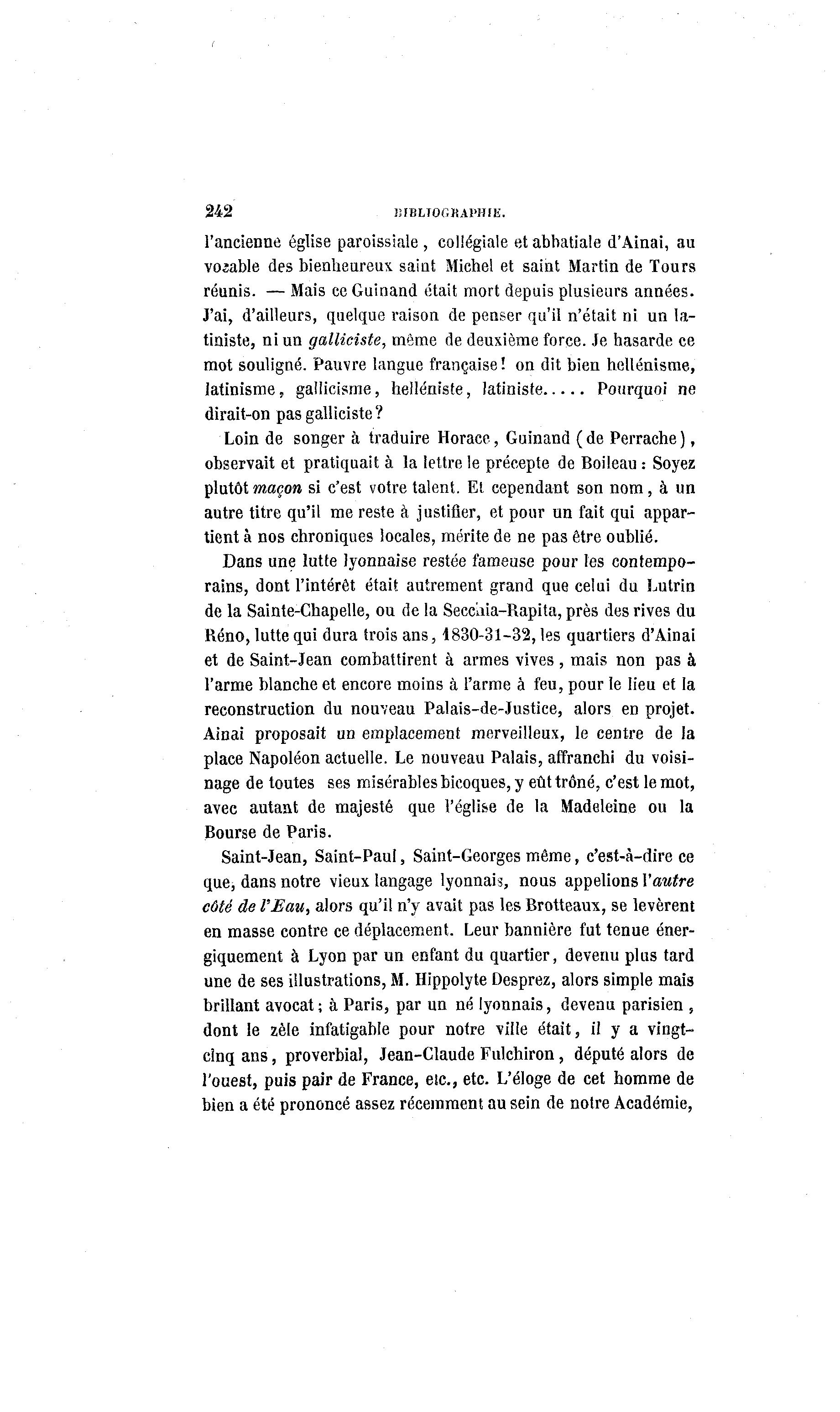 242 lïFBLTOGKAl'HfE. l'ancienne église paroissiale , collégiale et abbatiale d'Ainai, au vosable des bienheureux saint Michel et saint Martin de Tours réunis. — Mais ce Guinand était mort depuis plusieurs années. J'ai, d'ailleurs, quelque raison de penser qu'il n'était ni un la- tiniste, ni un galliciste, même de deuxième force. Je hasarde ce mot souligné. Pauvre langue française ! on dit bien hellénisme, latinisme, gallicisme, helléniste, latiniste Pourquoi ne dirait-on pas galliciste ? Loin de songer à traduire Horace, Guinand (de Perrache), observait et pratiquait à la lettre le précepte de Boileau : Soyez plutôt maçon si c'est votre talent. Et cependant son nom, à un autre titre qu'il me reste à justifier, et pour un fait qui appar- tient à nos chroniques locales, mérite de ne pas être oublié. Dans une lutte lyonnaise restée fameuse pour les contempo- rains, dont l'intérêt était autrement grand que celui du Lutrin de la Sainte-Chapelle, ou de la Secc'aia-Rapita, près des rives du Réno, lutte qui dura trois ans, 1830-31-32, les quartiers d'Ainai et de Saint-Jean combattirent à armes vives , mais non pas à l'arme blanche et encore moins à l'arme à feu, pour le lieu et la reconstruction du nouveau Palais-de-Justice, alors en projet. Ainai proposait un emplacement merveilleux, le centre de la place Napoléon actuelle. Le nouveau Palais, affranchi du voisi- nage de toutes ses misérables bicoques, y eût trôné, c'est le mot, avec autaat de majesté que l'église de la Madeleine ou la Bourse de Paris. Saint-Jean, Saint-Paul, Saint-Georges même, c'est-à -dire ce que, dans notre vieux langage lyonnais, nous appelions Vautre côté de l'Eau, alors qu'il n'y avait pas les Brotteaux, se levèrent en masse contre ce déplacement. Leur bannière fut tenue éner- giquement à Lyon par un enfant du quartier, devenu plus tard une de ses illustrations, M. Hippolyte Desprez, alors simple mais brillant avocat ; à Paris, par un né lyonnais, devenu parisien , dont le zèle infatigable pour notre ville était, il y a vingt- cinq ans, proverbial, Jean-Claude Fulchiron, député alors de l'ouest, puis pair de France, etc., etc. L'éloge de cet homme de bien a été prononcé assez récemment au sein de notre Académie,