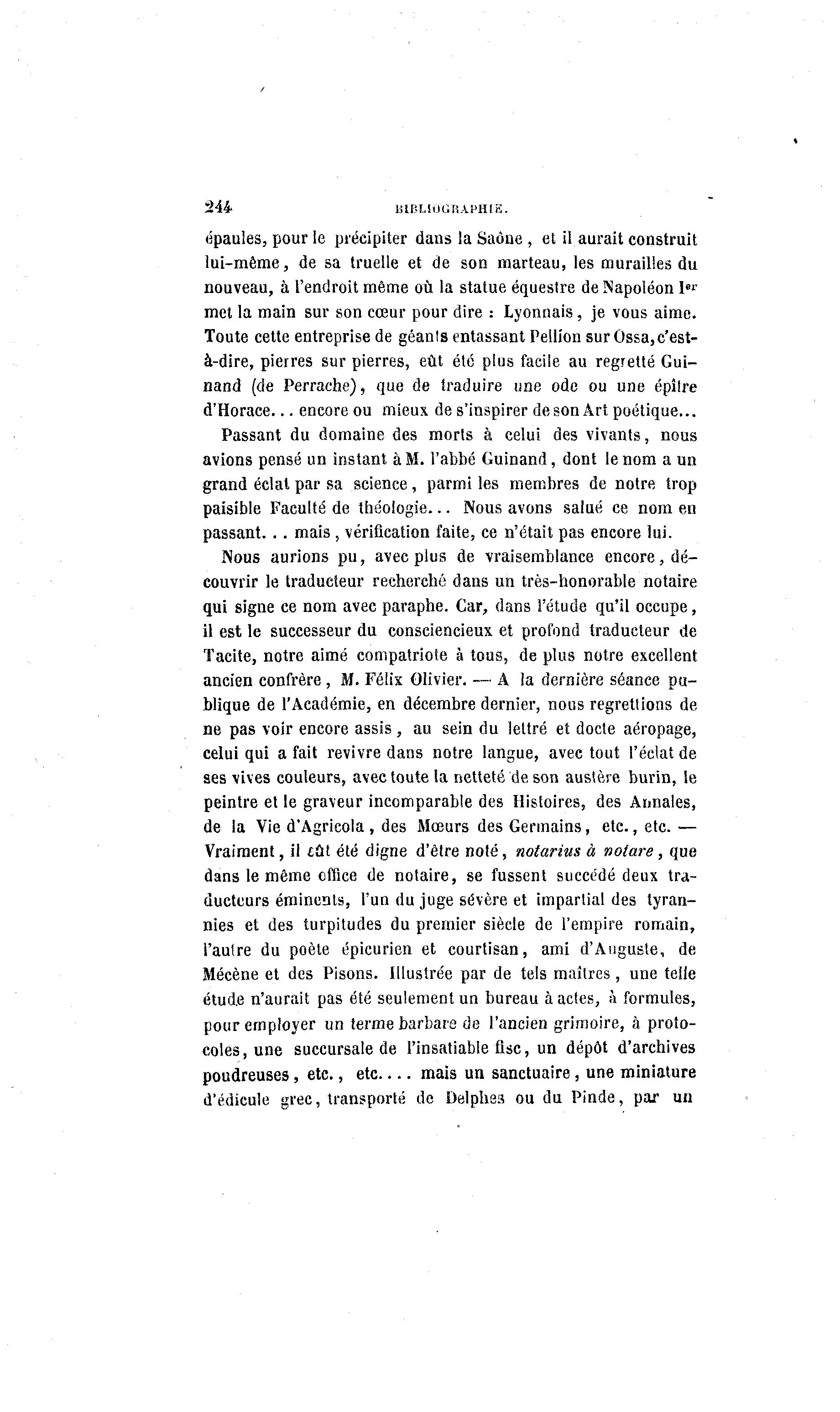 244 BIBLIOGRAPHIE. épaules, pour le précipiter dans la Saône , et il aurait construit lui-même, de sa truelle et de son marteau, les murailles du nouveau, à l'endroit même où la statue équestre de Napoléon I er met la main sur son cœur pour dire : Lyonnais, je vous aime. Toute cette entreprise de géants entassant Pellion sur Ossa,c'est- à -dire, pierres sur pierres, eût été plus facile au regretté Gui- nand (de Perrache), que de traduire une ode ou une épîlre d'Horace... encore ou mieux de s'inspirer de son Art poétique... Passant du domaine des morts à celui des vivants, nous avions pensé un instant à M. l'abbé Guinand, dont le nom a un grand éclat par sa science, parmi les membres de notre trop paisible Faculté de théologie... Nous avons salué ce nom en passant. . . mais , vérification faite, ce n'était pas encore lui. Nous aurions pu, avec plus de vraisemblance encore, dé- couvrir le traducteur recherché dans un très-honorable notaire qui signe ce nom avec paraphe. Car, dans l'étude qu'il occupe, il est le successeur du consciencieux et profond traducteur de Tacite, notre aimé compatriote à tous, de plus notre excellent ancien confrère , M. Félix Olivier. — A la dernière séance pu- blique de l'Académie, en décembre dernier, nous regrettions de ne pas voir encore assis , au sein du lettré et docte aéropage, celui qui a fait revivre dans notre langue, avec tout l'éclat de ses vives couleurs, avec toute la netteté de son austère burin, le peintre et le graveur incomparable des Histoires, des Annales, de la Vie d'Agricola , des Mœurs des Germains, etc., etc. — Vraiment, il lui été digne d'être noté, notarius à notare, que dans le même office de notaire, se fussent succédé deux tra- ducteurs éminents, l'un du juge sévère et impartial des tyran- nies et des turpitudes du premier siècle de l'empire romain, l'autre du poète épicurien et courtisan, ami d'Auguste, de Mécène et des Pisons. Illustrée par de tels maîtres, une telle étude n'aurait pas été seulement un bureau à actes, à formules, pour employer un terme barbare de l'ancien grimoire, à proto- coles, une succursale de l'insatiable fisc, un dépôt d'archives poudreuses, etc., etc mais un sanctuaire, une miniature d'édicule grec, transporté de Delphes ou du Pinde, par un