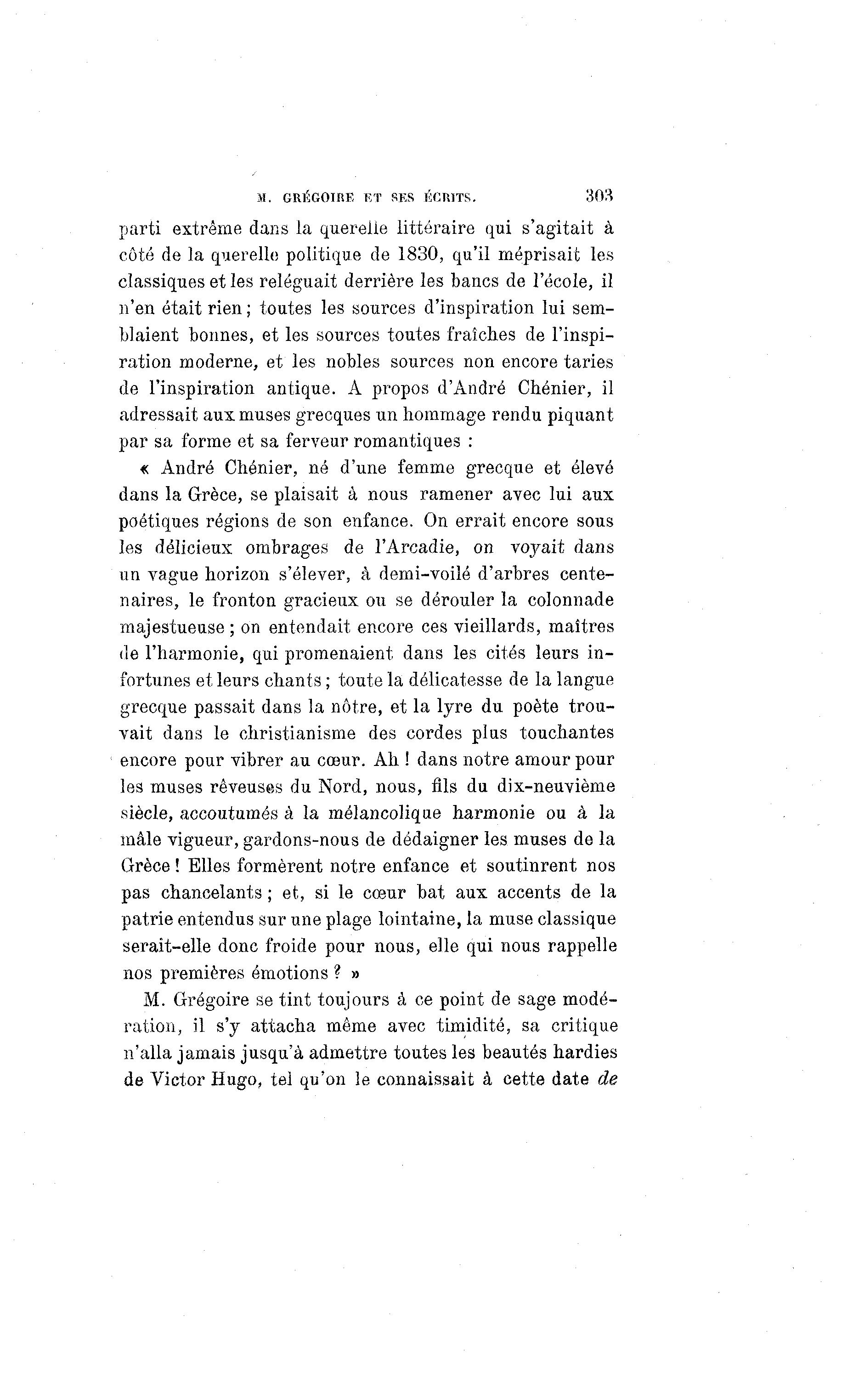 M. GRÉGOIRE ET SES ÉCRITS. 303 parti extrême dans la querelle littéraire qui s'agitait à côté de la querelle politique de 1830, qu'il méprisait les classiques et les reléguait derrière les bancs de l'école, il n'en était rien ; toutes les sources d'inspiration lui sem- blaient bonnes, et les sources toutes fraîches de l'inspi- ration moderne, et les nobles sources non encore taries de l'inspiration antique. A propos d'André Chénier, il adressait aux muses grecques un hommage rendu piquant par sa forme et sa ferveur romantiques : « André Chénier, né d'une femme grecque et élevé dans la Grèce, se plaisait à nous ramener avec lui aux poétiques régions de son enfance. On errait encore sous les délicieux ombrages de l'Arcadie, on voyait dans un vague horizon s'élever, à demi-voilé d'arbres cente- naires, le fronton gracieux ou se dérouler la colonnade majestueuse; on entendait encore ces vieillards, maîtres de l'harmonie, qui promenaient dans les cités leurs in- fortunes et leurs chants ; toute la délicatesse de la langue grecque passait dans la nôtre, et la lyre du poète trou- vait dans le christianisme des cordes plus touchantes encore pour vibrer au cœur. Ah ! dans notre amour pour les muses rêveuses du Nord, nous, fils du dix-neuvième siècle, accoutumés à la mélancolique harmonie ou à la mâle vigueur, gardons-nous de dédaigner les muses de la Grèce ! Elles formèrent notre enfance et soutinrent nos pas chancelants ; et, si le cœur bat aux accents de la patrie entendus sur une plage lointaine, la muse classique serait-elle donc froide pour nous, elle qui nous rappelle nos premières émotions ? » M. Grégoire se tint toujours à ce point de sage modé- ration, il s'y attacha même avec timidité, sa critique n'alla jamais jusqu'à admettre toutes les beautés hardies de Victor Hugo, tel qu'on le connaissait à cette date de