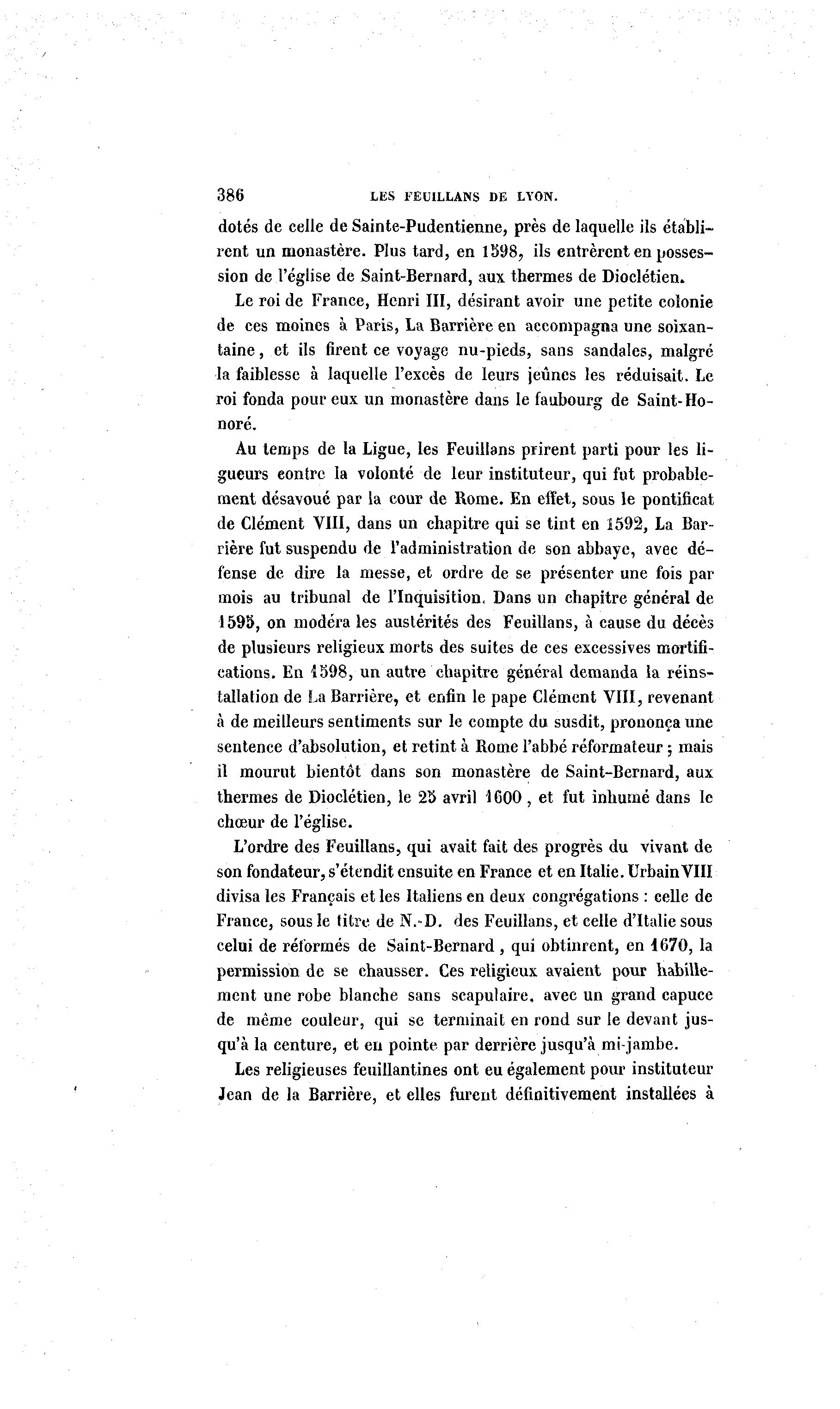 386 LES FEUILLANS DE LYON. dotés de celle de Sainte-Pudentienne, près de laquelle ils établi- rent un monastère. Plus tard, en 1598, ils entrèrent en posses- sion de l'église de Saint-Bernard, aux thermes de Dioclétien. Le roi de France, Henri III, désirant avoir une petite colonie de ces moines à Paris, La Barrière en accompagna une soixan- taine , et ils firent ce voyage nu-pieds, sans sandales, malgré la faiblesse à laquelle l'excès de leurs jeûnes les réduisait. Le roi fonda pour eux un monastère dans le faubourg de Saint-Ho- noré. Au temps de la Ligue, les Feuillans prirent parti pour les li- gueurs eontrc la volonté de leur instituteur, qui fut probable- ment désavoué par la cour de Rome. En effet, sous le pontificat de Clément VIII, dans un chapitre qui se tint en 1592, La Bar- rière fut suspendu de l'administration de son abbaye, avec dé- fense de dire la messe, et ordre de se présenter une fois par mois au tribunal de l'Inquisition. Dans un chapitre général de 1595, on modéra les austérités des Feuillans, à cause du décès de plusieurs religieux morts des suites de ces excessives mortifi- cations. En 1598, un autre chapitre général demanda la réins- tallation de La Barrière, et enfin le pape Clément VIII, revenant à de meilleurs sentiments sur le compte du susdit, prononça une sentence d'absolution, et retint à Rome l'abbé réformateur ; mais il mourut bientôt dans son monastère de Saint-Bernard, aux thermes de Dioclétien, le 25 avril 1600, et fut inhumé dans le chÅ“ur de l'église. L'ordre des Feuillans, qui avait fait des progrès du vivant de son fondateur, s'étendit ensuite en France et en Italie. Urbain VIII divisa les Français et les Italiens en deux congrégations : celle de France, sous le litre de N.-D. des Feuillans, et celle d'Italie sous celui de réformés de Saint-Bernard , qui obtinrent, en 1670, la permission de se chausser. Ces religieux avaient pour habille- ment une robe blanche sans scapulaire. avec un grand capuce de même couleur, qui se terminait en rond sur le devant jus- qu'à la centure, et en pointe par derrière jusqu'à mi-jambe. Les religieuses feuillantines ont eu également pour instituteur Jean de la Barrière, et elles furent définitivement installées Ã