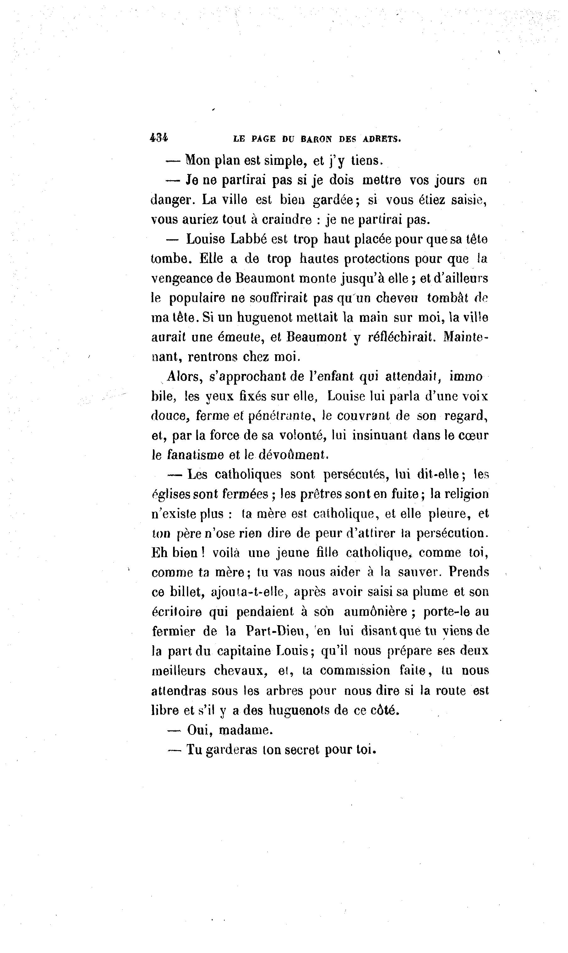 434 LE PAGE DU BARON DES ADRETS. — Mon plan est simple, et j'y tiens. — Je ne partirai pas si je dois mettre vos jours en danger. La ville est bien gardée; si vous étiez saisie, vous auriez tout à craindre : je ne partirai pas. — Louise Labbé est trop haut placée pour que sa tête tombe. Elle a de trop hautes protections pour que la vengeance de Beaumont monte jusqu'à elle ; et d'ailleurs le populaire ne souffrirait pas qu un cheveu tombât de ma tête. Si un huguenot mettait la main sur moi, la ville aurait une émeute, et Beaumont y réfléchirait. Mainte- nant, rentrons chez moi. Alors, s'approchant de l'enfant qui attendait, immo bile, les yeux fixés sur elle, Louise lui parla d'une voix douce, ferme et pénétrante, le couvrant de son regard, et, par la force de sa volonté, lui insinuant dans le cœur le fanatisme et le dévoûment. — Les catholiques sont persécutés, lui dit-elle ; les églises sont fermées ; les prêtres sont en fuite ; la religion n'existe plus : ta mère est catholique, et elle pleure, et ton père n'ose rien dire de peur d'attirer la persécution. Eh bien ! voilà une jeune fille catholique, comme toi, comme ta mère ; tu vas nous aider à la sauver. Prends ce billet, ajouta-t-elle, après avoir saisi sa plume et son écriloire qui pendaient à son aumônière ; porte-le au fermier de la Part-Dieu, en lui disantquetu viens de la part du capitaine Louis; qu'il nous prépare ses deux meilleurs chevaux, et, ta commission faite, tu nous attendras sous les arbres pour nous dire si la route est libre et s'il y a des huguenots de ce côté. — Oui, madame. — Tu garderas ton secret pour toi.