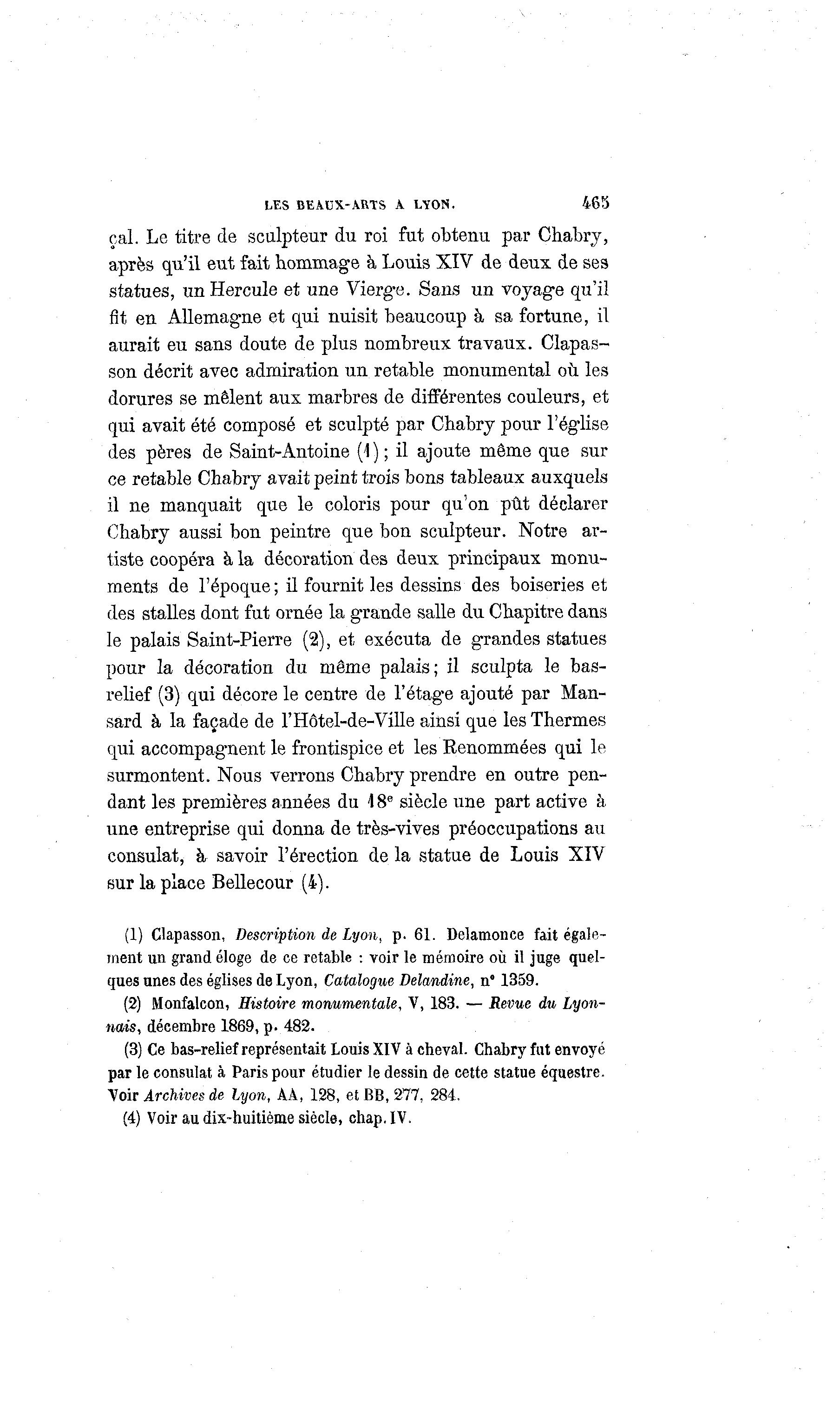 LES BEAUX-ARTS A LTOH. 465 cal. Le titre de sculpteur du roi fut obtenu par Chabry, après qu'il eut fait hommage à Louis XIV de deux de ses statues, un Hercule et une Vierge. Sans un voyage qu'il fit en Allemagne et qui nuisit beaucoup à sa fortune, il aurait eu sans doute de plus nombreux travaux. Clapas- son décrit avec admiration un retable monumental où les dorures se mêlent aux marbres de différentes couleurs, et qui avait été composé et sculpté par Chabry pour l'église des pères de Saint-Antoine (1) ; il ajoute même que sur ce retable Chabry avait peint trois bons tableaux auxquels il ne manquait que le coloris pour qu'on pût déclarer Chabry aussi bon peintre que bon sculpteur. Notre ar- tiste coopéra à la décoration des deux principaux monu- ments de l'époque ; il fournit les dessins des boiseries et des stalles dont fut ornée la grande salle du Chapitre dans le palais Saint-Pierre (2), et exécuta de grandes statues pour la décoration du même palais; il sculpta le bas- relief (3) qui décore le centre de l'étag'e ajouté par Man- sard à la façade de l'Hôtel-de-Ville ainsi que les Thermes qui accompagnent le frontispice et les Eenommées qui le surmontent. Nous verrons Chabry prendre en outre pen- dant les premières années du 48e siècle une part active à une entreprise qui donna de très-vives préoccupations au consulat, à savoir l'érection de la statue de Louis XIV sur la place Bellecour (4). (1) Clapasson, Description de Lyon, p. 61. Delamonce fait égale- ment un grand éloge de ce retable -. voir le mémoire où il juge quel- ques unes des églises de Lyon, Catalogue Delandine, n" 1359. (2) Monfalcon, Histoire monumentale, V, 183. — Revue du Lyon- nais, décembre 1869, p. 482. (3) Ce bas-relief représentait Louis XIV à cheval. Chabry fut envoyé par le consulat à Paris pour étudier le dessin de cette statue équestre. Voir Archives de Lyon, AA, 128, et BB, 277. 284. (4) Voir au dix-huitième siècle, ehap. IV.