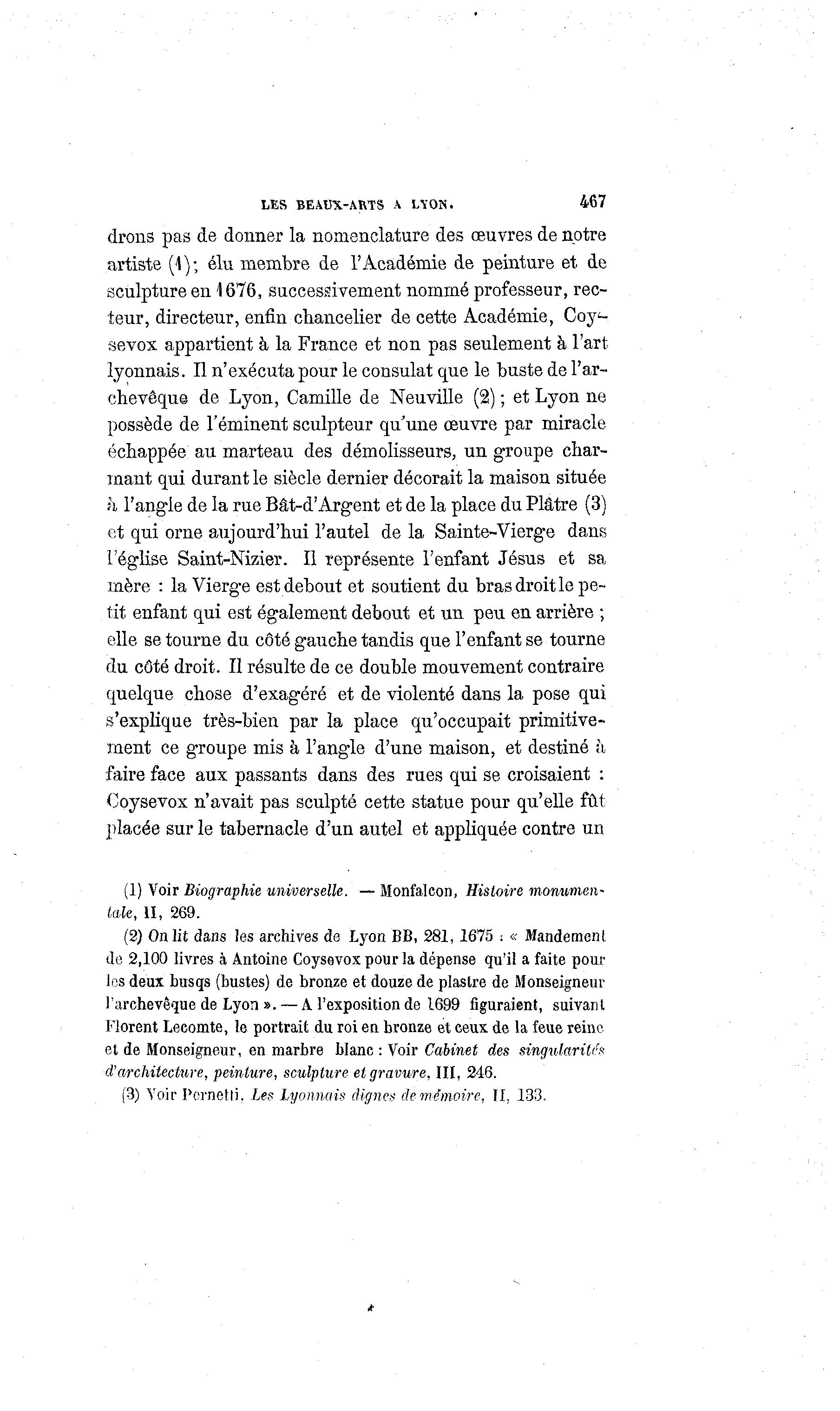 LES BEAUX-ARTS A IAON. 467 drons pas de donner la nomenclature des œuvres de notre artiste (4); élu membre de l'Académie de peinture et de sculpture en 1676, successivement nommé professeur, rec- teur, directeur, enfin chancelier de cette Académie, Coy^- sevox appartient à la France et non pas seulement à l'art lyonnais. Il n'exécuta pour le consulat que le buste de l'ar- chevêque de Lyon, Camille de Neuville (2) ; et Lyon ne possède de l'éminent sculpteur qu'une œuvre par miracle échappée au marteau des démolisseurs, un groupe char- mant qui durant le siècle dernier décorait la maison située h l'angle de la rue Bât-d'Argent et de la place du Plâtre (3) et qui orne aujourd'hui l'autel de la Sainte-Vierge dans l'église Saint-Nizier. Il représente l'enfant Jésus et sa mère : la Vierge est debout et soutient du bras droit le pe- tit enfant qui est également debout et un peu en arrière ; elle se tourne du côté gauche tandis que l'enfant se tourne du côté droit. Il résulte de ce double mouvement contraire quelque chose d'exagéré et de violenté dans la pose qui s'explique très-bien par la place qu'occupait primitive- ment ce groupe mis à l'angle d'une maison, et destiné à faire face aux passants dans des rues qui se croisaient : Coysevox n'avait pas sculpté cette statue pour qu'elle fût placée sur le tabernacle d'un autel et appliquée contre un (1) Voir Biographie universelle. — Monfalcon, Histoire monumen- tale, II, 269. (2) On lit dans les archives de Lyon BB, 281, 1675 : « Mandemenl de 2,100 livres à Antoine Coysevox pour la dépense qu'il a faite pour los deux busqs (bustes) de bronze et douze de piastre de Monseigneur l'archevêque de Lyon ». — A. l'exposition de 1699 figuraient, suivant Florent Lecomte, le portrait du roi en bronze et ceux de la feue reine et de Monseigneur, en marbre blanc : Voir Cabinet des singularités d'architecture, peinture, sculpture et gravure, III, 246. (3) Voir Pcrnetli, Les Lyonnais dignes de mémoire, II, 133.