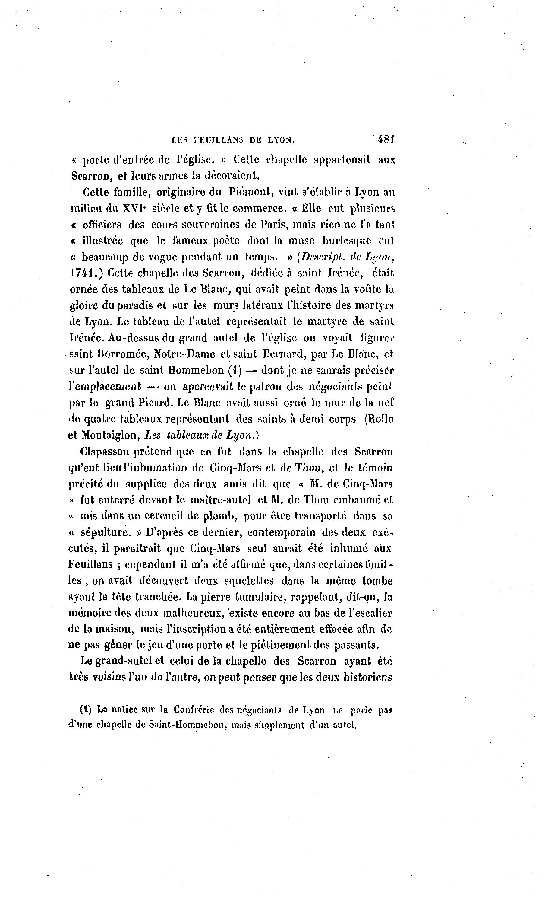 LES FEUILLANS DE LYON. 481 « porte d'entrée de l'église. » Cette chapelle appartenait aux Scarron, et leurs armes la décoraient. Cette famille, originaire du Piémont, vint s'établir à Lyon au milieu du XVIe siècle et y fit le commerce. « Elle eut plusieurs « officiers des cours souveraines de Paris, mais rien ne l'a tant « illustrée que le fameux poète dont la muse burlesque eut « beaucoup de vogue pendant un temps. » (Descript. de Lyon, 1741.) Cette chapelle des Scarron, dédiée à saint Irénée, était ornée des tableaux de Le Blanc, qui avait peint dans la voûte la gloire du paradis et sur les murs latéraux l'histoire des martyrs de Lyon. Le tableau de l'autel représentait le martyre de saint Irénée. Au-dessus du grand autel de l'église on voyait figurer saint Borromée, Notre-Dame et saint Bernard, par Le Blanc, et sur l'autel de saint Hommebon (1) — dont je ne saurais préciser l'emplacement — on apercevait le patron des négociants peint par le grand Picard. Le Blanc avait aussi orné le mur de la nef de quatre tableaux représentant des saints à demi-corps (Rolle et Montaiglon, Les tableaux de Lyon.) Clapasson prétend que ce fut dans la chapelle des Scarron qu'eut lieu l'inhumation de Cinq-Mars et de Thou, et le témoin précité du supplice des deux amis dit que « M. de Cinq-Mars « fut enterré devant le maître-autel et M. de Thou embaumé et « mis dans un cercueil de plomb, pour être transporté dans sa « sépulture. » D'après ce dernier, contemporain des deux exé- cutés, il paraîtrait que Cinq-Mars seul aurait été inhumé aux Feuillans ; cependant il m'a été affirmé que, dans certaines fouil- les , on avait découvert deux squelettes dans la même tombe ayant la tête tranchée. La pierre tumulaire, rappelant, dit-on, la mémoire des deux malheureux, 'existe encore au bas de l'escalier de la maison, mais l'inscription a été entièrement effacée afin de ne pas gêner le jeu d'une porte et le piétinement des passants. Le grand-autel et celui de la chapelle des Scarron ayant été très voisins l'un de l'autre, on peut penser que les deux historiens (t) La notice sur la Confrérie tics négociants de Lyon ne parle pas d'une chapelle de Saint-Hommebon, mais simplement d'un autel.