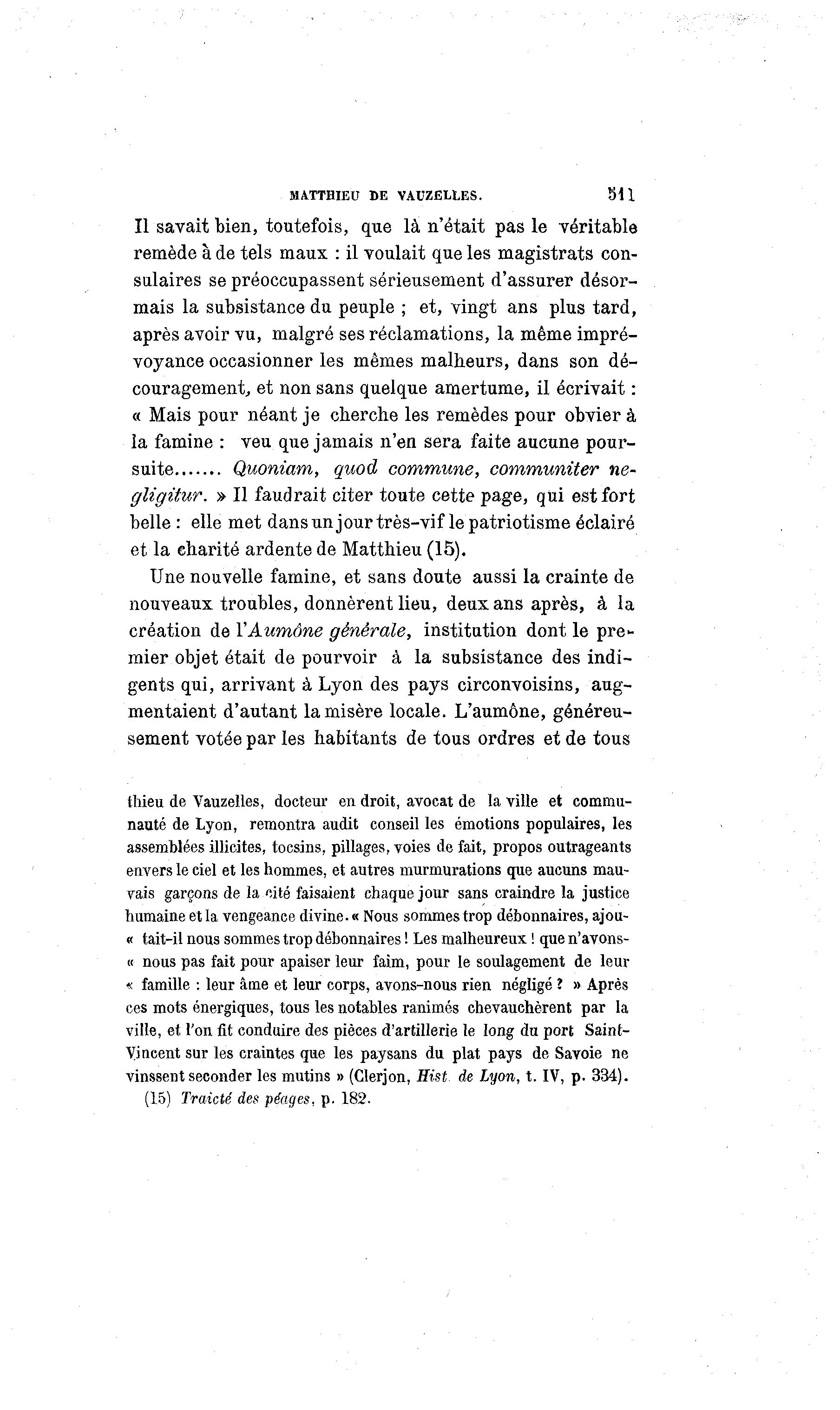 MATTHIEU DE VAUZEU.ES. 811 Il savait bien, toutefois, que là n'était pas le véritable remède à de tels maux : il voulait que les magistrats con- sulaires se préoccupassent sérieusement d'assurer désor- mais la subsistance du peuple ; et, vingt ans plus tard, après avoir vu, malgré ses réclamations, la même impré- voyance occasionner les mêmes malheurs, dans son dé- couragement, et non sans quelque amertume, il écrivait : « Mais pour néant je cherche les remèdes pour obvier à la famine : veu que jamais n'en sera faite aucune pour- suite Quoniam, quod commune, communiter ne- gligitur. » Il faudrait citer toute cette page, qui est fort belle : elle met dans un jour très-vif le patriotisme éclairé et la charité ardente de Matthieu (15). Une nouvelle famine, et sans doute aussi la crainte de nouveaux troubles, donnèrent lieu, deux ans après, à la création de XAumône générale, institution dont le pre- mier objet était de pourvoir à la subsistance des indi- gents qui, arrivant à Lyon des pays circonvoisins, aug- mentaient d'autant la misère locale. L'aumône, généreu- sement votée par les habitants de tous ordres et de tous thieu de Vauzelles, docteur en droit, avocat de la ville et commu- nauté de Lyon, remontra audit conseil les émotions populaires, les assemblées illicites, tocsins, pillages, voies de fait, propos outrageants envers le ciel et les hommes, et autres murmurations que aucuns mau- vais garçons de la cité faisaient chaque jour sans craindre la justice humaine et la vengeance divine. « Nous sommes trop débonnaires, ajou- « tait-il nous sommes trop débonnaires ! Les malheureux ! que n'avons- « nous pas fait pour apaiser leur faim, pour le soulagement de leur « famille : leur âme et leur corps, avons-nous rien négligé X » Après ces mots énergiques, tous les notables ranimés chevauchèrent par la ville, et l'on fit conduire des pièces d'artillerie le long du port Saint- Vincent sur les craintes que les paysans du plat pays de Savoie ne vinssent seconder les mutins » (Clerjon, Hist. de Lyon, t. IV, p. 334). (15) Traicté des péages, p. 182.