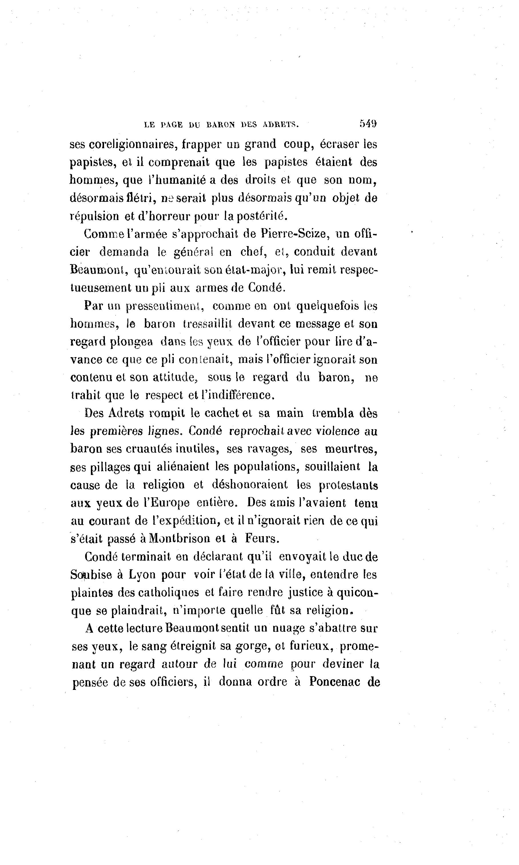 LE PAGE BU BARON 1>ES ADRETS. 54(.) ses coreligionnaires, frapper un grand coup, écraser les papistes, et il comprenait que les papistes étaient des hommes, que l'humanité a des droits et que son nom, désormais flétri, ne serait plus désormais qu'un objet de répulsion et d'horreur pour la postérité. Comme l'armée s'approchait de Pierre-Seize, un offi- cier demanda le générai en chef, et, conduit devant Beaumonl, qu'entourait son état-major, lui remit respec- tueusement uupii aux armes de Condé. Par un pressentiment., comme en ont quelquefois les hommes, le baron tressaillit devant ce message et son regard plongea dans les yeux de l'officier pour lire d'a- vance ce que ce pli conienait, mais l'officier ignorait son contenu et son attitude, sous le regard du baron, ne trahit que le respect et l'indifférence. Des Adrets rompit le cachet et sa main trembla dès les premières lignes. Condé reprochait avec violence au baron ses cruautés inutiles, ses ravages, ses meurtres, ses pillages qui aliénaient les populations, souillaient la cause de la religion et déshonoraient les protestants aux yeux de l'Europe entière. Des amis l'avaient tenu au courant de l'expédition, et il n'ignorait rien de ce qui s'était passé à Montbrison el à Feurs. Condé terminait en déclarant qu'il envoyait le duc de Soubise à Lyon pour voir l'état de la ville, entendre les plaintes des catholiques et faire rendre justice à quicon- que se plaindrait, n'importe quelle fût sa religion. A cette lecture Beaumont sentit un nuage s'abattre sur ses yeux, le sang étreignit sa gorge, et furieux, prome- nant un regard autour de lui comme pour deviner la pensée de ses officiers, il donna ordre à Poncenac de