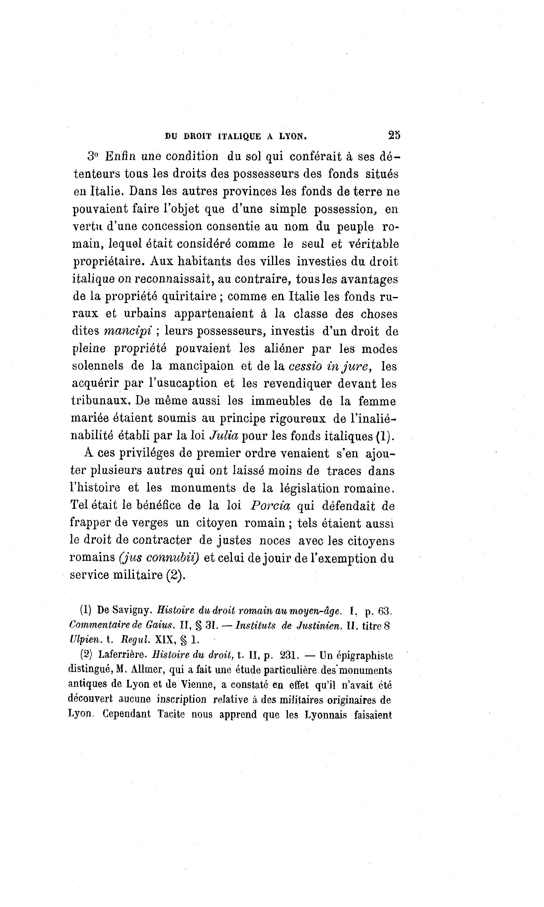 BU DROIT ITALIQUE A LYON. 25 3° Enfin une condition du sol qui conférait à ses dé- tenteurs tous les droits des possesseurs des fonds situés en Italie. Dans les autres provinces les fonds de terre ne pouvaient faire l'objet que d'une simple possession, en vertu d'une concession consentie au nom du peuple ro- main, lequel était considéré comme le seul et véritable propriétaire. Aux habitants des villes investies du droit italique on reconnaissait, au contraire, tous les avantages de la propriété quiritaire ; comme en Italie les fonds ru- raux et urbains appartenaient à la classe des choses dites mancipi ; leurs possesseurs, investis d'un droit de pleine propriété pouvaient les aliéner par les modes solennels de la mancipaion et de la cessio injure, les acquérir par l'usucaption et les revendiquer devant les tribunaux. De même aussi les immeubles de la femme mariée étaient soumis au principe rigoureux de l'inalié- nabilité établi par la loi Julia pour les fonds italiques (1). A ces privilèges de premier ordre venaient s'en ajou- ter plusieurs autres qui ont laissé moins de traces dans l'histoire et les monuments de la législation romaine. Tel était le bénéfice de la loi Porcia qui défendait de frapper de verges un citoyen romain ; tels étaient aussi le droit de contracter de justes noces avec les citoyens romains (jus connubii) et celui de jouir de l'exemption du service militaire (2). (1) De Savigny. Histoire du droit romain a« moyen-âge. I, p. 63. Commentaire de Gains. II, § 31. —Instituts de Justinien. II. titre 8 Ulpien. t. Regul. XIX, § 1. (2) Laferrière. Histoire du droit, t. II, p. 231. — Un épigraphiste distingué, M. Allmer, qui a fait une étude particulière des'monuments antiques de Lyon et de Vienne, a constaté en effet qu'il n'avait été découvert aucune inscription relative â des militaires originaires de Lyon. Cependant Tacite nous apprend que les Lyonnais faisaient