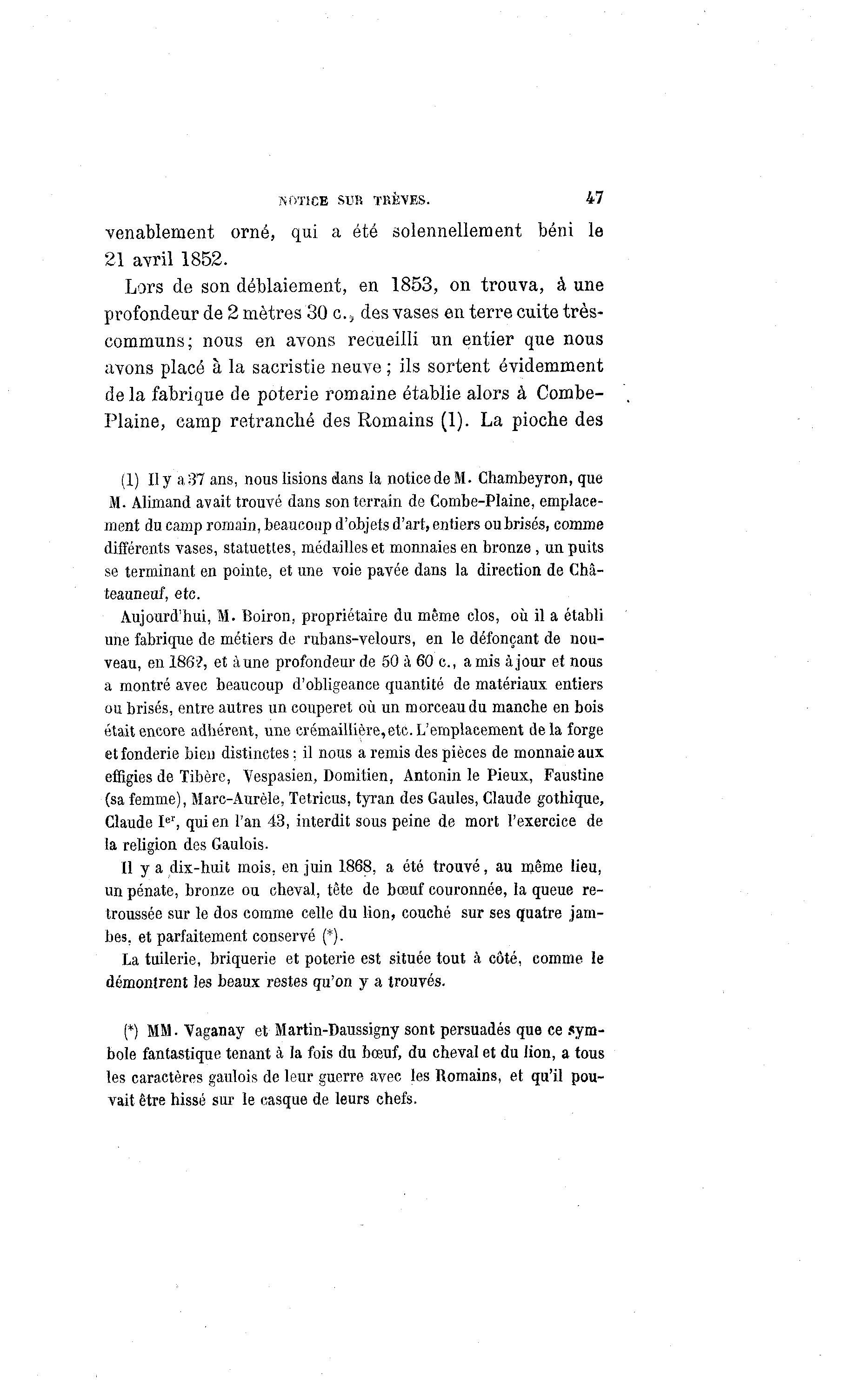 NOTICE SUR TRÊVES. 47 venablement orné, qui a été solennellement béni le 21 avril 1852. Lors de son déblaiement, en 1853, on trouva, à une profondeur de 2 mètres 30 c., des vases en terre cuite très- communs; nous en avons recueilli un entier que nous avons placé à la sacristie neuve ; ils sortent évidemment de la fabrique de poterie romaine établie alors à Combe- Plaine, camp retranché des Romains (1). La pioche des (1) Il y a 37 ans, nous lisions dans la notice de M. Chambeyron, que M. Alimand avait trouvé dans son terrain de Combe-Plaine, emplace- ment du camp romain, beaucoup d'objets d'art, entiers oubrises, comme différents vases, statuettes, médailles et monnaies en bronze, un puits se terminant en pointe, et une voie pavée dans la direction de Châ- teauneuf, etc. Aujourd'hui, M. Boiron, propriétaire du même clos, où il a établi une fabrique de métiers de rubans-velours, en le défonçant de nou- veau, en 186'-?, et aune profondeur de 50 à 60 c , a mis à jour et nous a montré avec beaucoup d'obligeance quantité de matériaux entiers ou brisés, entre autres un couperet où un morceau du manche en bois était encore adhérent, une erémaillière,etc. L'emplacement delà forge et fonderie bien distinctes ; il nous a remis des pièces de monnaie aux effigies de Tibère, Yespasien, Domitien, Antonin le Pieux, Faustine (sa femme), Marc-Aurèle, Tetricus, tyran des Gaules, Claude gothique, Claude I er , qui en l'an 43, interdit sous peine de mort l'exercice de la religion des Gaulois. Il y a dix-huit mois, en juin 1868, a été trouvé, au même lieu, un pénate, bronze ou cheval, tête de bœuf couronnée, la queue re- troussée sur le dos comme celle du lion, couché sur ses quatre jam- bes, et parfaitement conservé (*). La tuilerie, briquerie et poterie est située tout à côté, comme le démontrent les beaux restes qu'on y a trouvés. (*) MM. Yaganay et Martin-Daussigny sont persuadés que ce sym- bole fantastique tenant à la fois du bœuf, du cheval et du lion, a tous les caractères gaulois de leur guerre avec les Romains, et qu'il pou- vait être hissé sur le casque de leurs chefs.