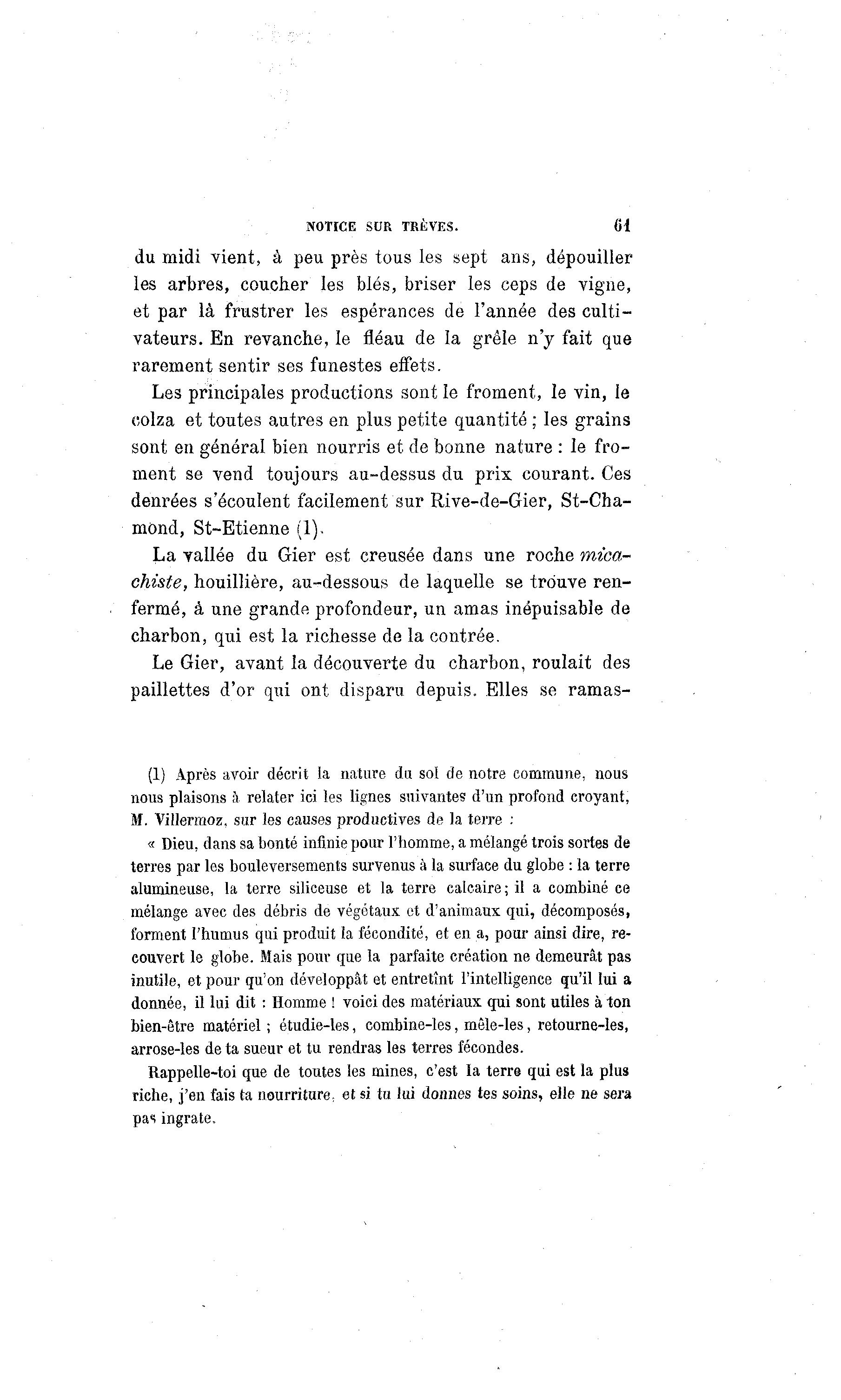 NOTICE SDR TRÊVES. Cl du midi vient, à peu près tous les sept ans, dépouiller les arbres, coucher les blés, briser les ceps de vigne, et par là frustrer les espérances de l'année des culti- vateurs. En revanche, le fléau de la grêle n'y fait que rarement sentir ses funestes effets. Les principales productions sont le froment, le vin, le colza et toutes autres en plus petite quantité ; les grains sont en général bien nourris et de bonne nature : le fro- ment se vend toujours au-dessus du prix courant. Ces denrées s'écoulent facilement sur Rive-de-Gier, St-Cha- mônd, St-Etienne (1). La vallée du Gier est creusée dans une roche micas- chiste, houillière, au-dessous de laquelle se trouve ren- fermé, à une grande profondeur, un amas inépuisable de charbon, qui est la richesse de la contrée. Le Gier, avant la découverte du charbon, roulait des paillettes d'or qui ont disparu depuis. Elles se ramas- (1) Après avoir décrit la nature du sol de notre commune, nous nous plaisons à relater ici les lignes suivantes d'un profond croyant, M. Villermoz, sur les causes productives de la terre : « Dieu, dans sa bonté infinie pour l'homme, a mélangé trois sortes de terres par les bouleversements survenus à la surface du globe : la terre alumineuse, la terre siliceuse et la terre calcaire ; il a combiné ce mélange avec des débris de végétaux et d'animaux qui, décomposés, forment l'humus qui produit la fécondité, et en a, pour ainsi dire, re- couvert le globe. Mais pour que la parfaite création ne demeurât pas inutile, et pour qu'on développât et entretînt l'intelligence qu'il lui a donnée, il lui dit : Homme ! voici des matériaux qui sont utiles à ton bien-être matériel ; étudie-les, combine-les, mêle-les, retourne-les, arrose-les de ta sueur et tu rendras les terres fécondes. Rappelle-toi que de toutes les mines, c'est la terre qui est la plus riche, j'en fais ta nourriture; et si tu lui donnes tes soins, elle ne sera pas ingrate.