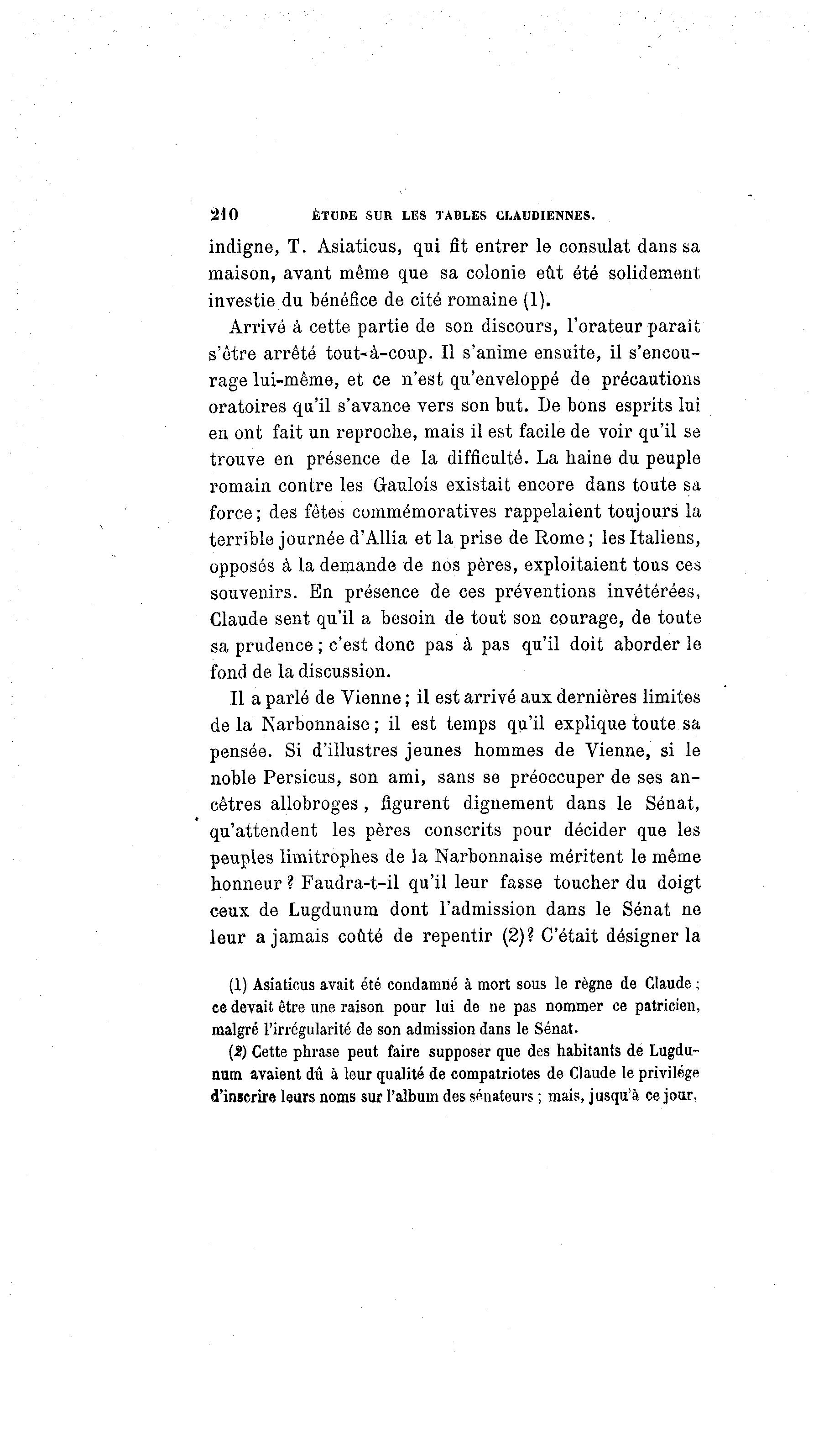 210 ÈTCDE SUR LES TABLES CLAUDIENNES. indigne, T. Asiaticus, qui fit entrer le consulat dans sa maison, avant même que sa colonie eût été solidement investie du bénéfice de cité romaine (1). Arrivé à cette partie de son discours, l'orateur paraît s'être arrêté tout-à -coup. Il s'anime ensuite, il s'encou- rage lui-même, et ce n'est qu'enveloppé de précautions oratoires qu'il s'avance vers son but. De bons esprits lui en ont fait un reproche, mais il est facile de voir qu'il se trouve en présence de la difficulté. La haine du peuple romain contre les Gaulois existait encore dans toute sa force ; des fêtes commémoratives rappelaient toujours la terrible journée d'Allia et la prise de Rome ; les Italiens, opposés à la demande de nos pères, exploitaient tous ces souvenirs. En présence de ces préventions invétérées, Claude sent qu'il a besoin de tout son courage, de toute sa prudence ; c'est donc pas à pas qu'il doit aborder le fond de la discussion. Il a parlé de Vienne ; il est arrivé aux dernières limites de la Narbonnaise ; il est temps qu'il explique toute sa pensée. Si d'illustres jeunes hommes de Vienne, si le noble Persicus, son ami, sans se préoccuper de ses an- cêtres allobroges, figurent dignement dans le Sénat, qu'attendent les pères conscrits pour décider que les peuples limitrophes de Ja Narbonnaise méritent le même honneur ? Faudra-t-il qu'il leur fasse toucher du doigt ceux de Lugdunum dont l'admission dans le Sénat ne leur a jamais coûté de repentir (2)? C'était désigner la (1) Asiaticus avait été condamné à mort sous le règne de Claude ; ce devait être une raison pour lui de ne pas nommer ce patricien, malgré l'irrégularité de son admission dans le Sénat- (5) Cette phrase peut faire supposer que des habitants dé Lugdu- num avaient dû à leur qualité de compatriotes de Claude le privilège d'inscrire leurs noms sur l'album des sénateurs ; mais, jusqu'à ce jour,