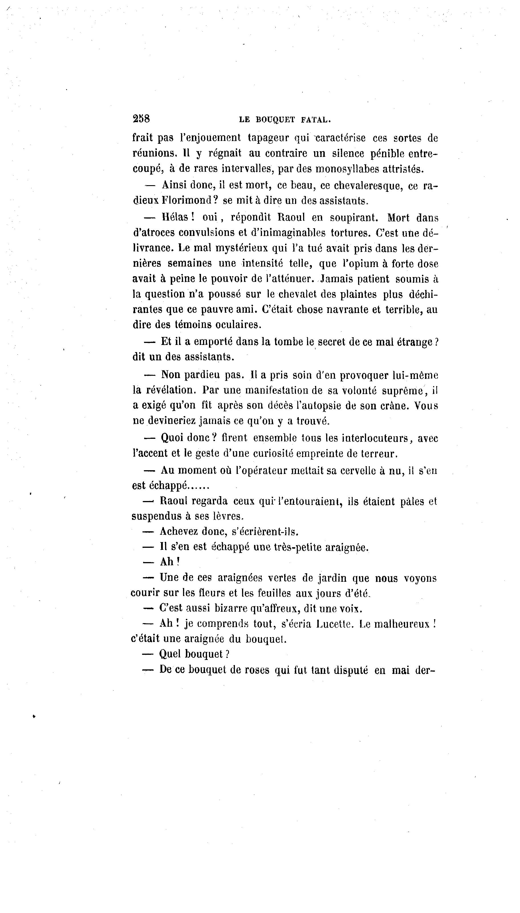 258 LE BOUQUET FATAL. frait pas l'enjouement tapageur qui caractérise ces sortes de réunions. Il y régnait au contraire un silence pénible entre- coupé, à de rares intervalles, par des monosyllabes attristés. — Ainsi donc, il est mort, ce beau, ce chevaleresque, ce ra- dieux Florimond? se mit à dire un des assistants. — Hélas ! oui, répondit Raoul en soupirant. Mort dans d'atroces convulsions et d'inimaginables tortures. C'est une dé- livrance. Le mal mystérieux qui Fa tué avait pris dans les der- nières semaines une intensité telle, que l'opium à forte dose avait à peine le pouvoir de l'atténuer. Jamais patient soumis à la question n'a poussé sur le chevalet des plaintes plus déchi- rantes que ce pauvre ami. C'était chose navrante et terrible, au dire des témoins oculaires. — Et il a emporté dans la tombe le secret de ce mal étrange ? dit un des assistants. — Non pardieu pas. Il a pris soin d'en provoquer lui-même la révélation. Par une manifestation de sa volonté suprême, il a exigé qu'on fît après son décès l'autopsie de son crâne. Vous ne devineriez jamais ce qu'on y a trouvé. — Quoi donc? firent ensemble tous les interlocuteurs, avec l'accent et le geste d'une curiosité empreinte de terreur. — Au moment où l'opérateur mettait sa cervelle à nu, il s'en est échappé —• Raoul regarda ceux qui- l'entouraient, ils étaient pâles et suspendus à ses lèvres. — Achevez donc, s'écrièrent-ils. — Il s'en est échappé une très-petite araignée. — Ah! — Une de ces araignées vertes de jardin que nous voyons courir sur les fleurs et les feuilles aux jours d'été. — C'est aussi bizarre qu'affreux, dit une voix. — Ah ! je comprends tout, s'écria Lucette. Le malheureux ! c'était une araignée du bouquet. — Quel bouquet ? — De ce bouquet de roses qui fut tant disputé en mai der-