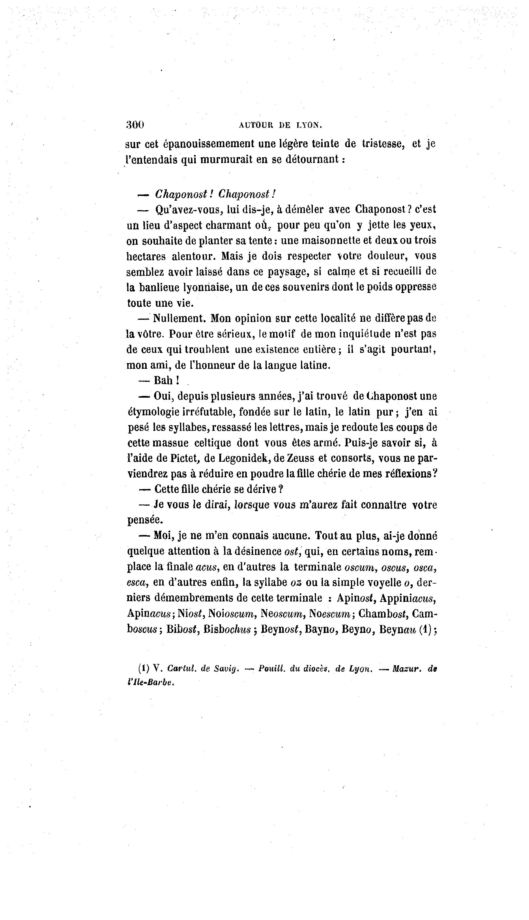 300 AUTOUR DE LYON. sur cet épanouissemement une légère teinte de tristesse, et je l'entendais qui murmurait en se détournant : — Chaponost ! Chaponost ! — Qu'avez-vous, lui dis-je, à démêler avec Chaponost ? c'est un lieu d'aspect charmant ou t pour peu qu'on y jette les yeux, on souhaite de planter sa tente : une maisonnette et deux ou trois hectares alentour. Mais je dois respecter votre douleur, vous semblez avoir laissé dans ce paysage, si calrne et si recueilli de la banlieue lyonnaise, un de ces souvenirs dont le poids oppresse toute une vie. — Nullement. Mon opinion sur cette localité ne diffère pas de la vôtre. Pour être sérieux, le motif de mon inquiétude n'est pas de ceux qui troublent une existence entière; il s'agit pourtant, mon ami, de l'honneur de la langue latine. — Bah! — Oui, depuis plusieurs années, j'ai trouvé de Chaponost une étymologie irréfutable, fondée sur le latin, le latin pur ; j'en ai pesé les syllabes, ressassé les lettres, mais je redoute les coups de cette massue celtique dont vous êtes armé. Puis-je savoir si, à l'aide de Pietet, de Legonidek, de Zeuss et consorts, vous ne par- viendrez pas à réduire en poudre lafillechérie de mes réflexions? — Cettefillechérie se dérive ? — Je vous le dirai, lorsque vous m'aurez fait connaître votre pensée. — Moi, je ne m'en connais aucune. Tout au plus, ai-je donné quelque attention à la désinence ost, qui, en certains noms, rem - place la finale acus, en d'autres la terminale oseum, oscus, osca, esca, en d'autres enfin, la syllabe os ou la simple voyelle o, der- niers démembrements de cette terminale : ApinosJ, Appiniacus, Apinaros; Wwst, Noioscum, Neoscum, Noescum; Chambosî, Cam- boscMs ; Bibost, Bishochus ; Beynost, Bayno, Beyno, Beyuau (1) ; (1) V. Cartul. de- Savig. — Pouill. du diocès. de Lyon. — Mazur. de l'He-Barbe.